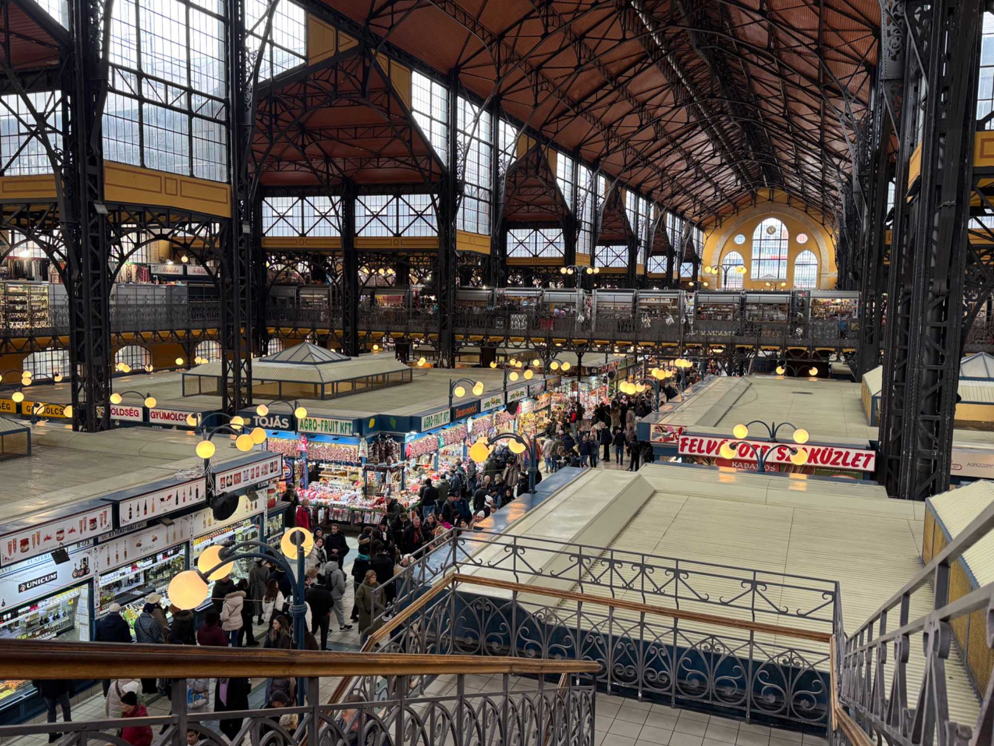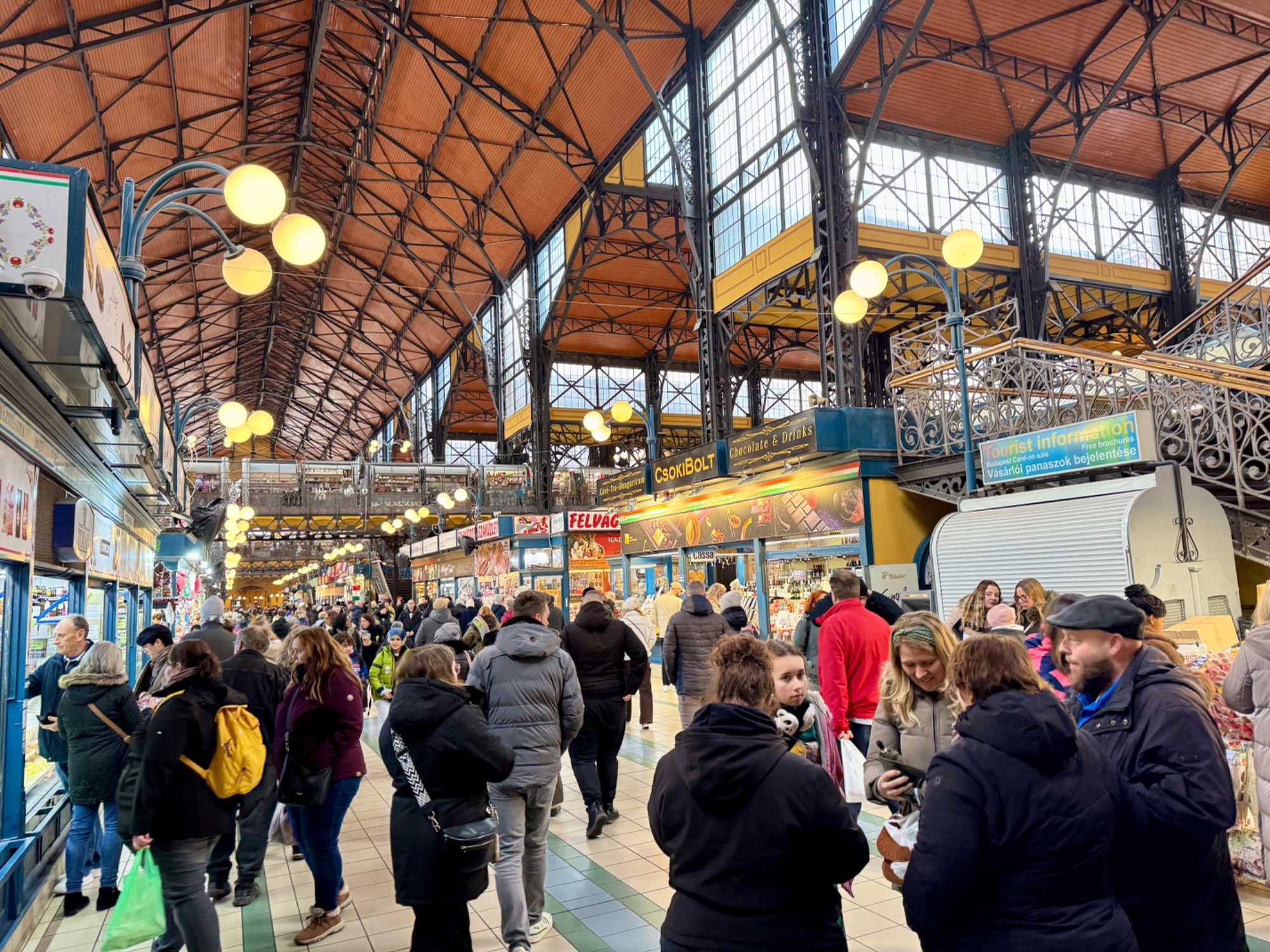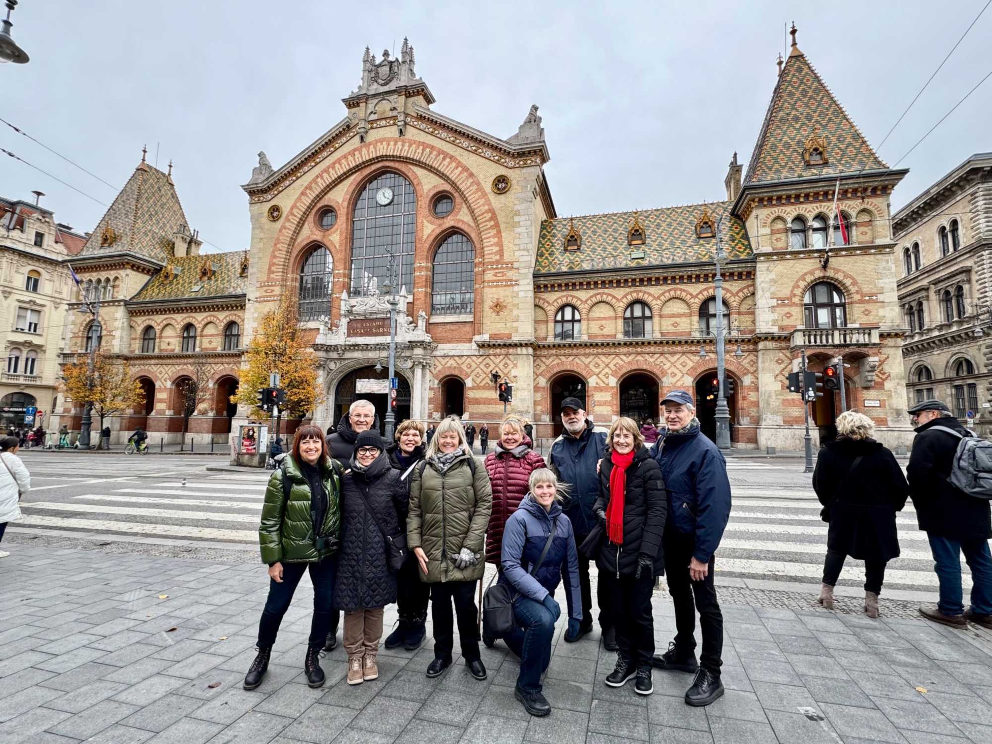 Ce matin, nous arrivons à Budapest un peu plus tôt que prévu. J’invite donc les voyageurs à m’accompagner pour une agréable promenade jusqu’au Grand Marché Couvert, situé à une dizaine de minutes à pied du bateau. Cet imposant bâtiment en briques rouges et de fer forgé, inauguré en 1897, est l’un des joyaux commerciaux de la ville. Le rez-de-chaussée regorge de produits frais et d’ingrédients typiques de la cuisine hongroise : paprika parfumé, charcuteries, fromages, pâtisseries et fruits colorés. À l’étage, l’atmosphère change : boutiques de souvenirs, artisanat traditionnel, broderies colorées, objets en bois sculpté… Un lieu vibrant, authentique, où le quotidien des Budapestois côtoie le charme des traditions.