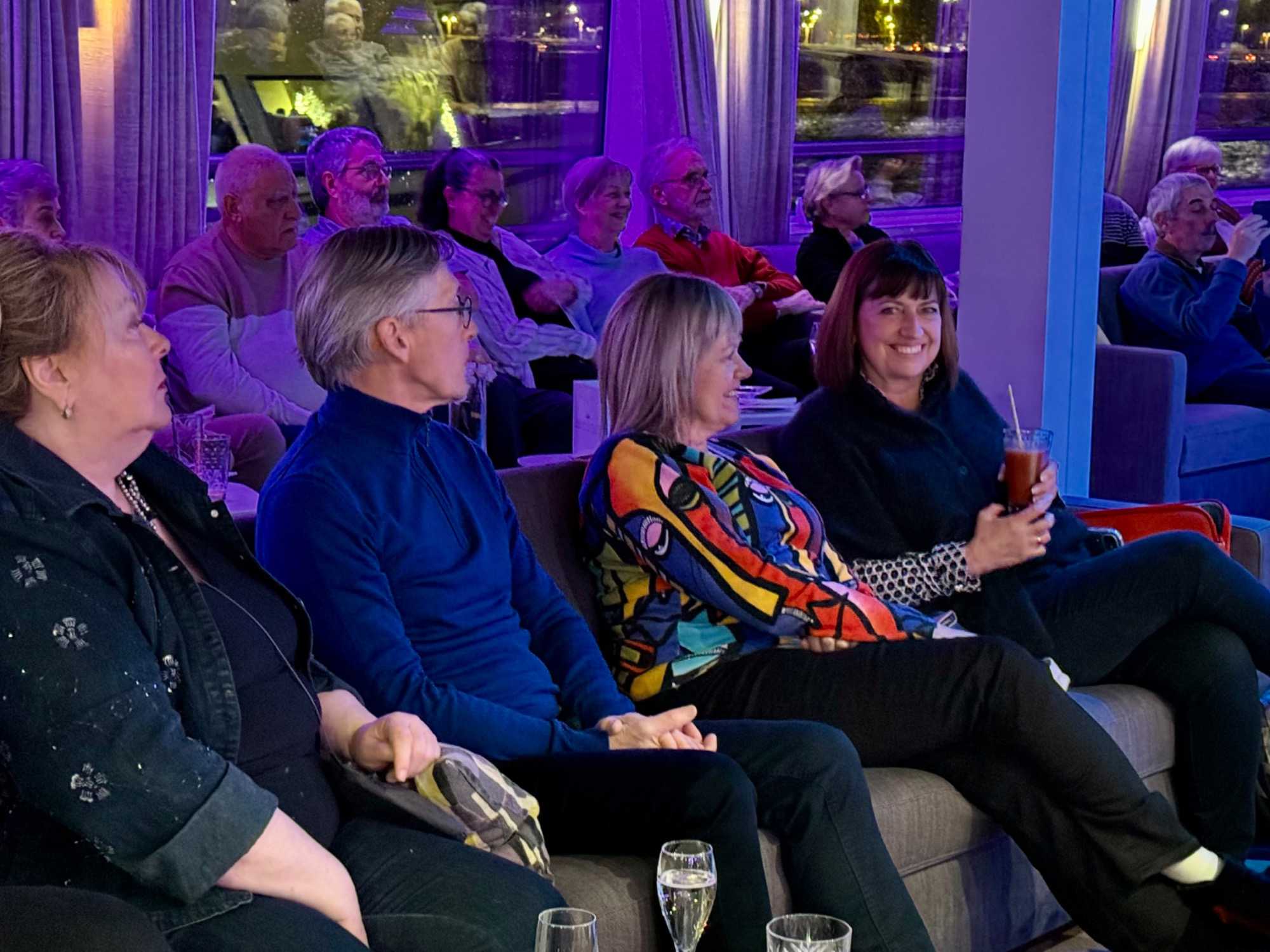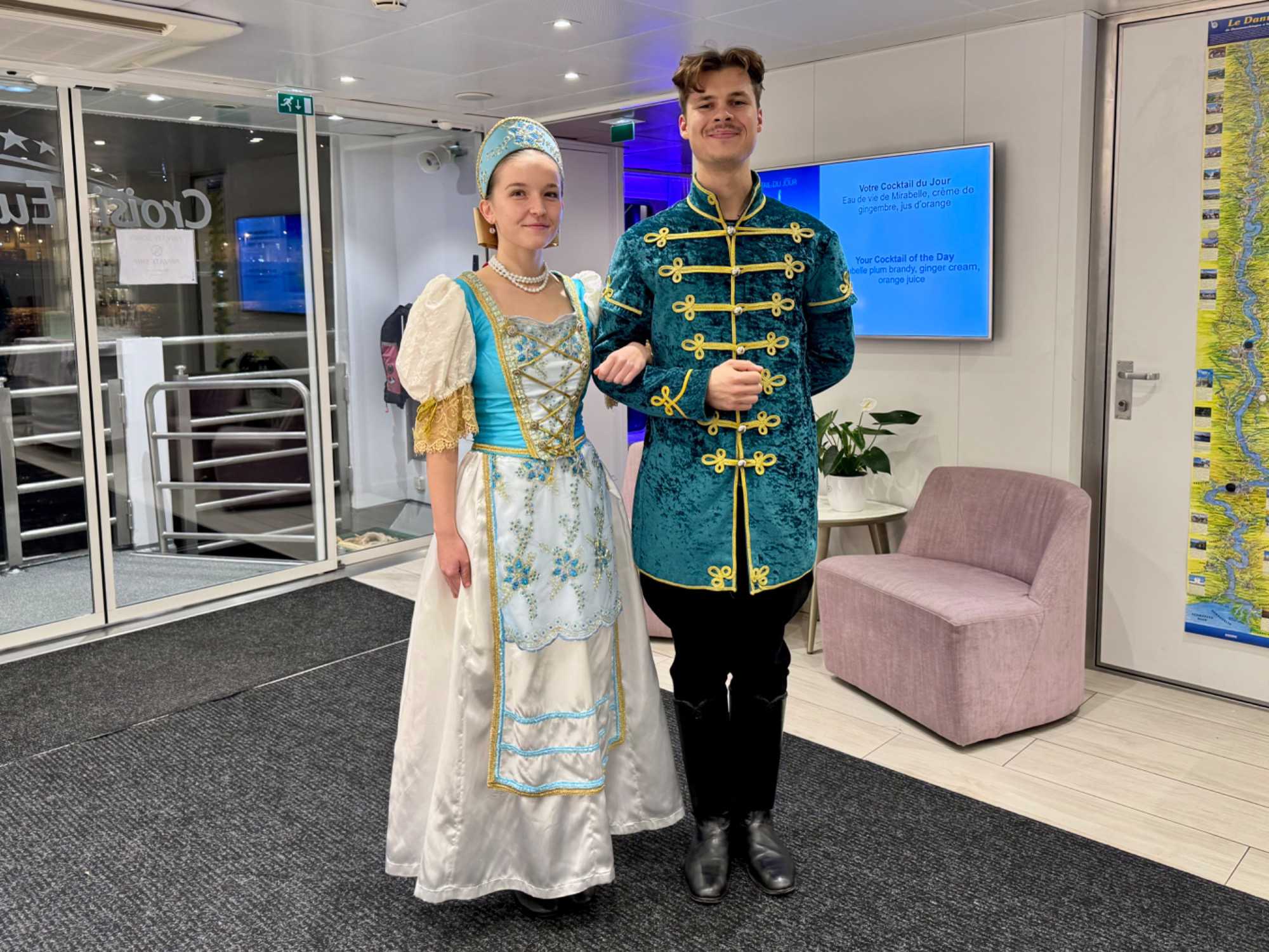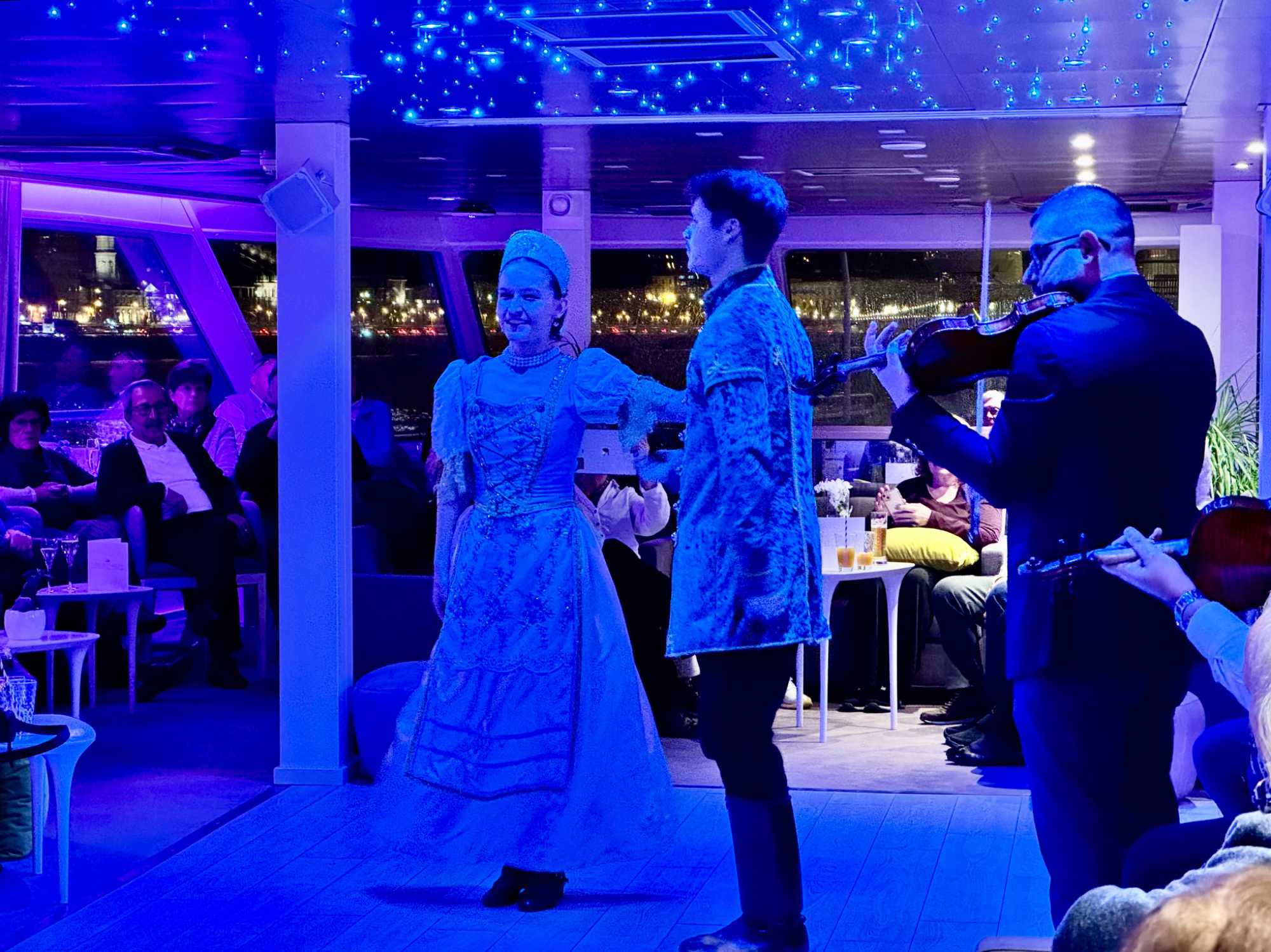 En fin d’après-midi, nous regagnons le MS Douce France pour profiter d’un moment de détente à bord. Très vite, l’ambiance s’anime : des musiciens et danseurs folkloriques hongrois montent à bord pour nous offrir un spectacle haut en couleur. Les rythmes entraînants du violon tzigane, les costumes traditionnels et les danses virevoltantes enchantent les voyageurs, certains s’aventurant même sur la piste au plus grand plaisir du groupe. Puis vient l’heure du souper, un délicieux repas préparé par notre chef et son équipe, inspiré des saveurs hongroises découvertes plus tôt dans la journée.