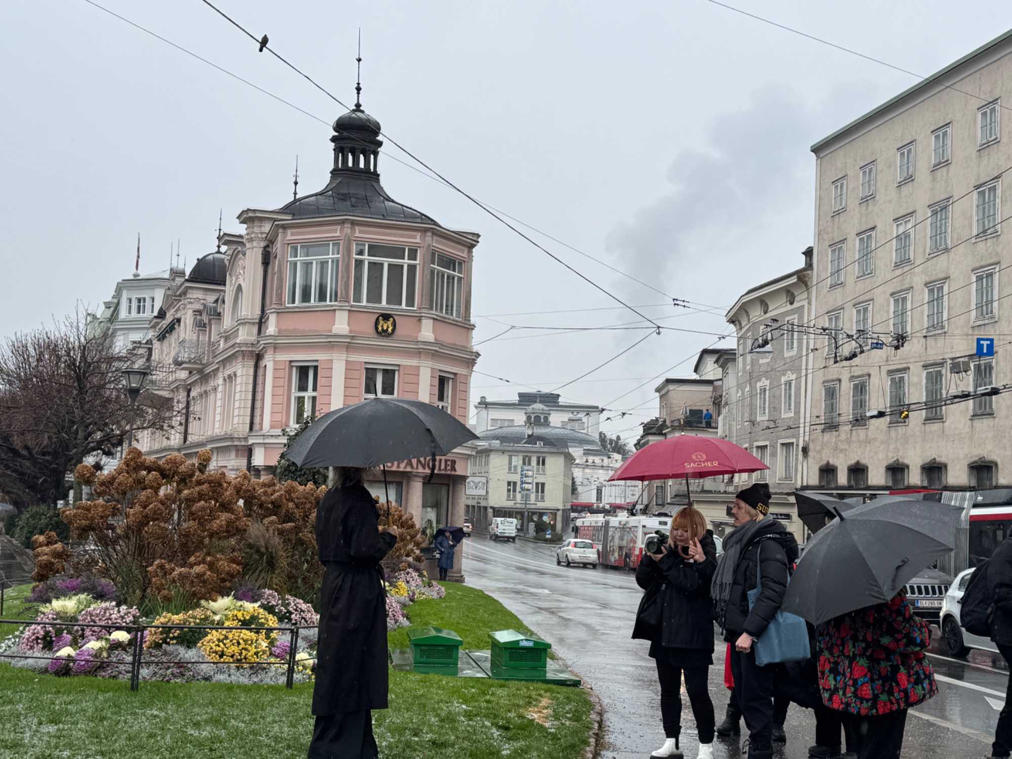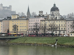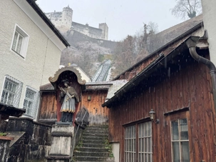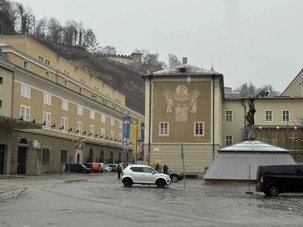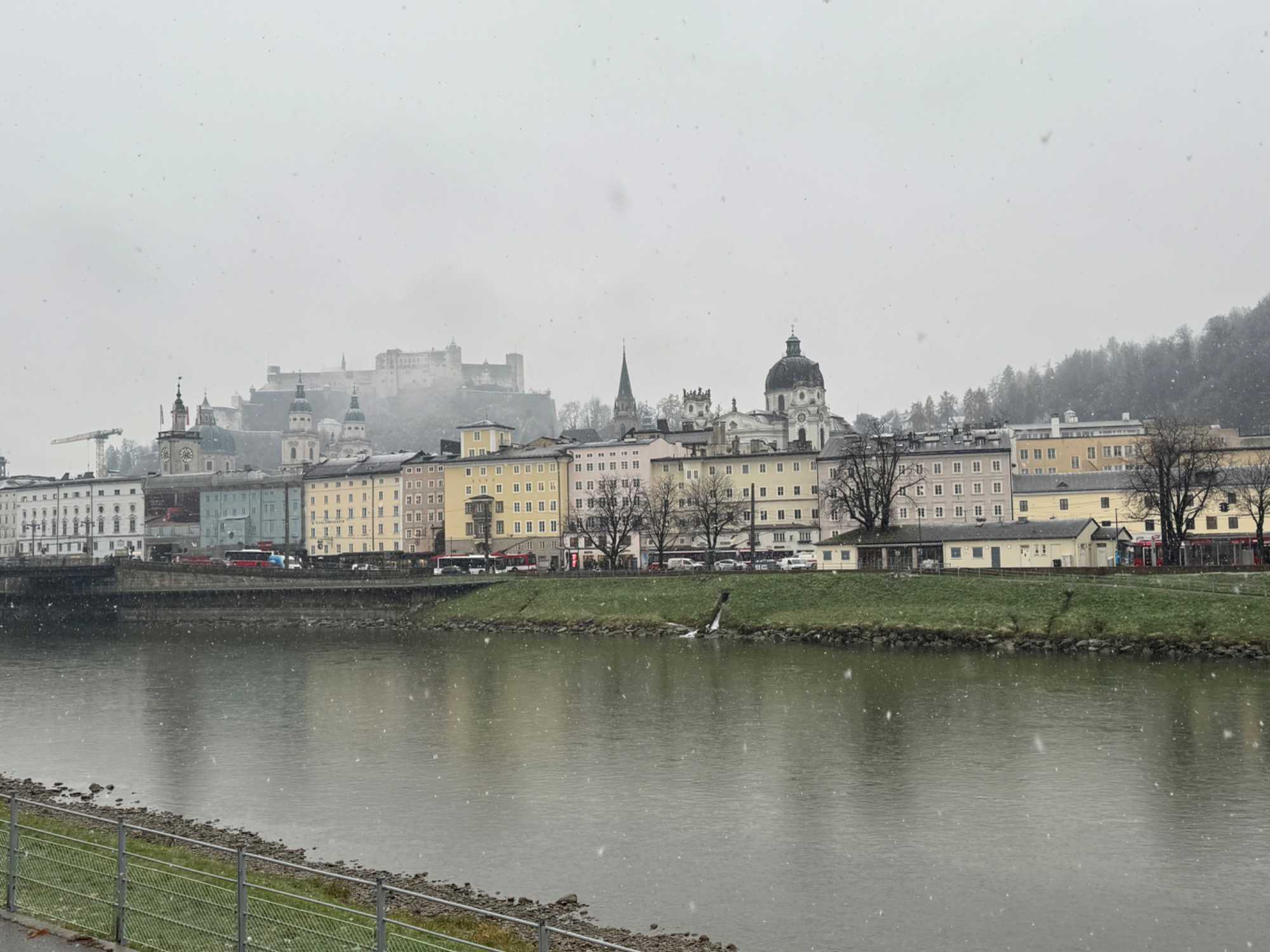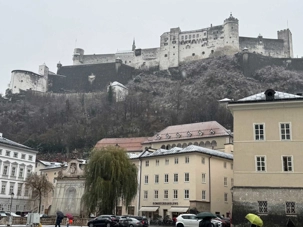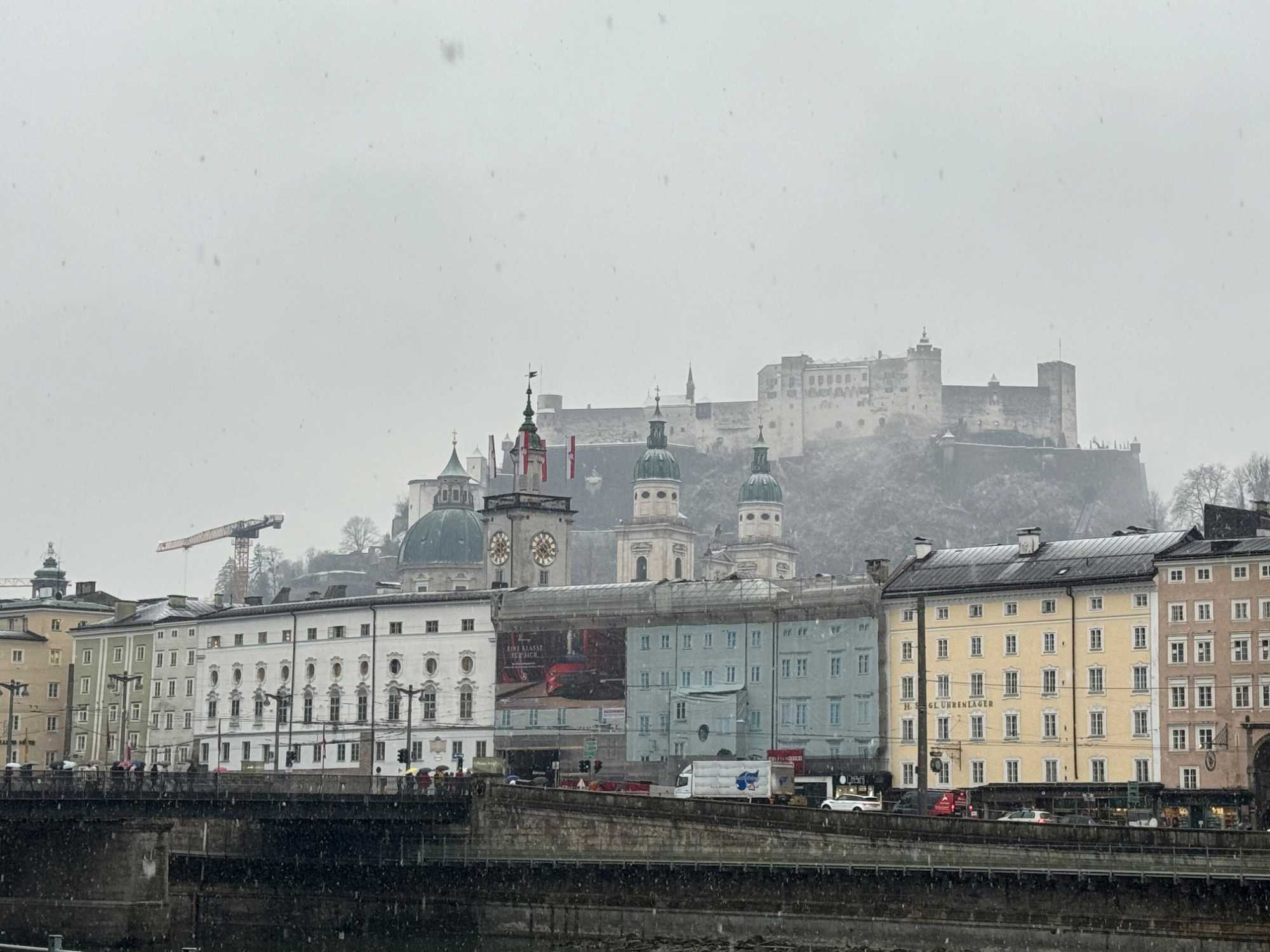 Ce matin, après un délicieux déjeuner partagé dans la bonne humeur, nous quittons l’hôtel pour retrouver notre guide locale, Helga, qui nous accompagnera lors de notre visite de Salzbourg. Le ciel est couvert, l’air vif, et une fine couche de neige tombée au réveil adoucit les toits baroques de la ville. Sous cette lumière hivernale, chaque façade semble scintiller davantage, comme saupoudrée de poudre d’argent.