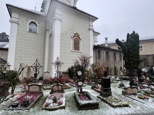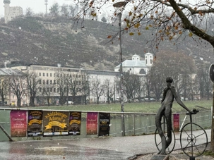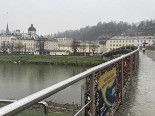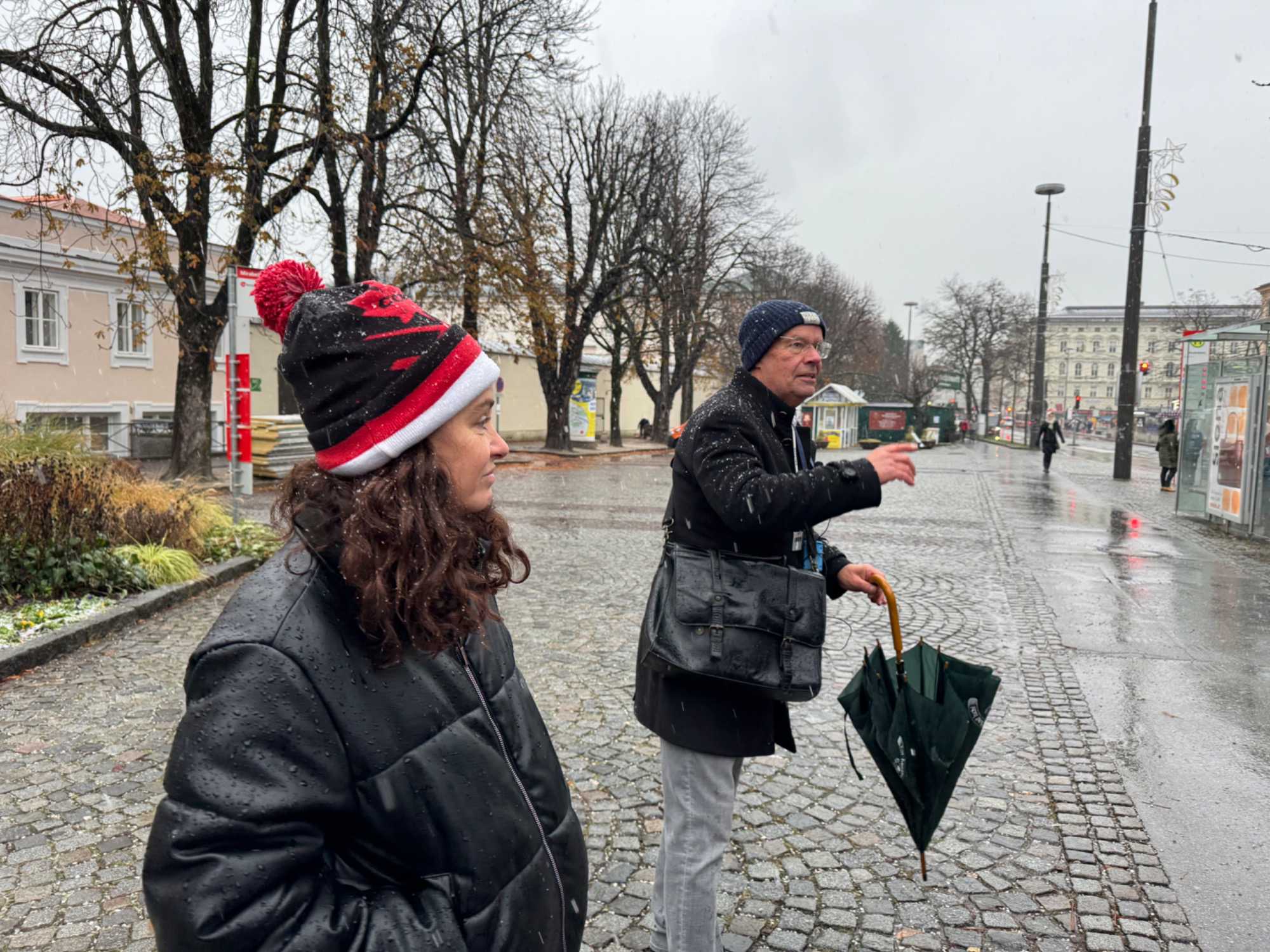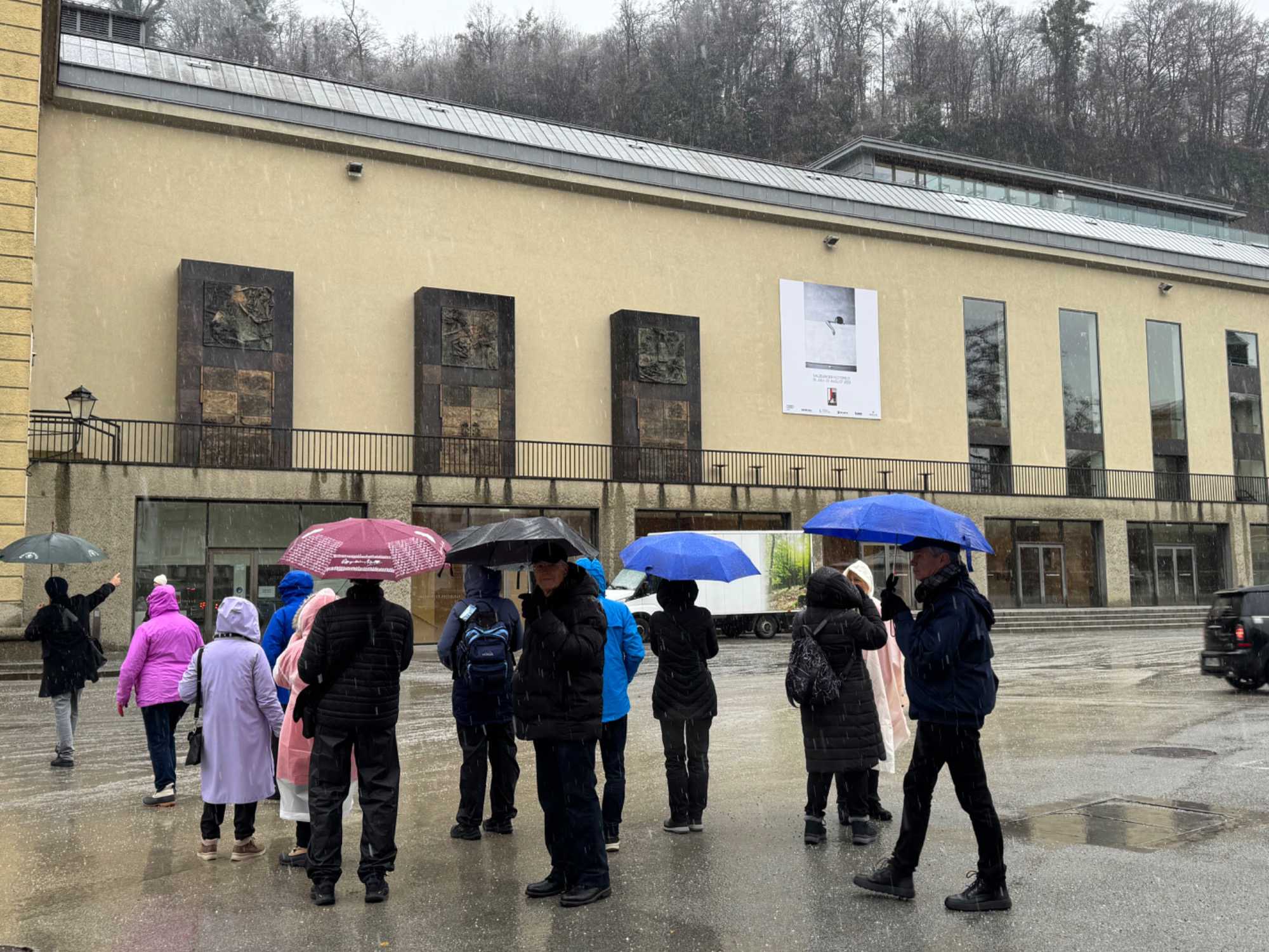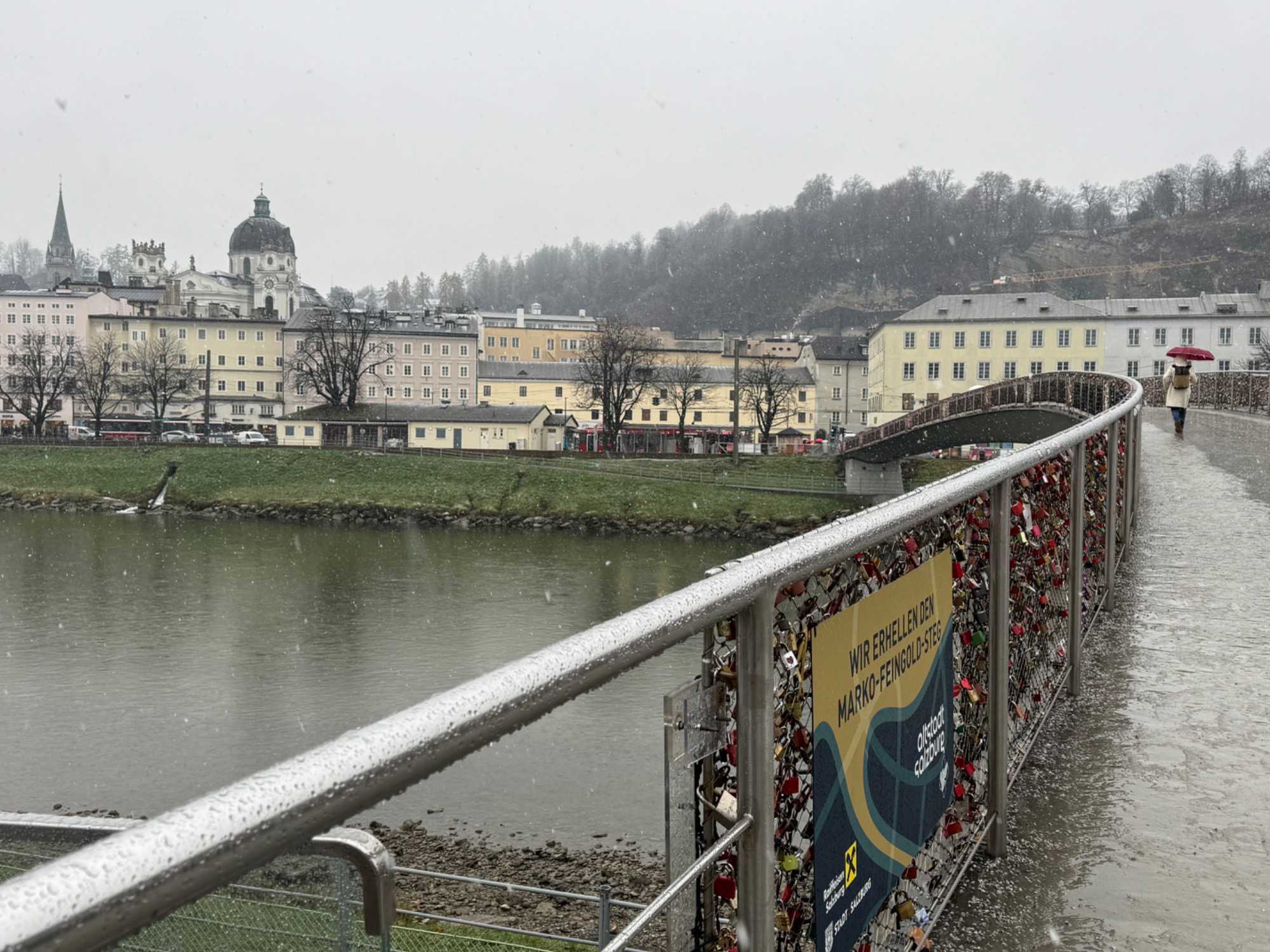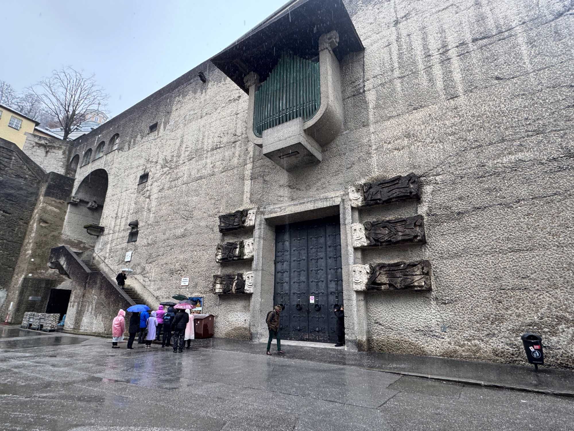Ce matin, après un délicieux déjeuner partagé dans la bonne humeur, nous quittons l’hôtel pour retrouver notre guide locale, Helga, qui nous accompagnera lors de notre visite de Salzbourg. Le ciel est couvert, l’air vif, et une fine couche de neige tombée au réveil adoucit les toits baroques de la ville. Sous cette lumière hivernale, chaque façade semble scintiller davantage, comme saupoudrée de poudre d’argent.