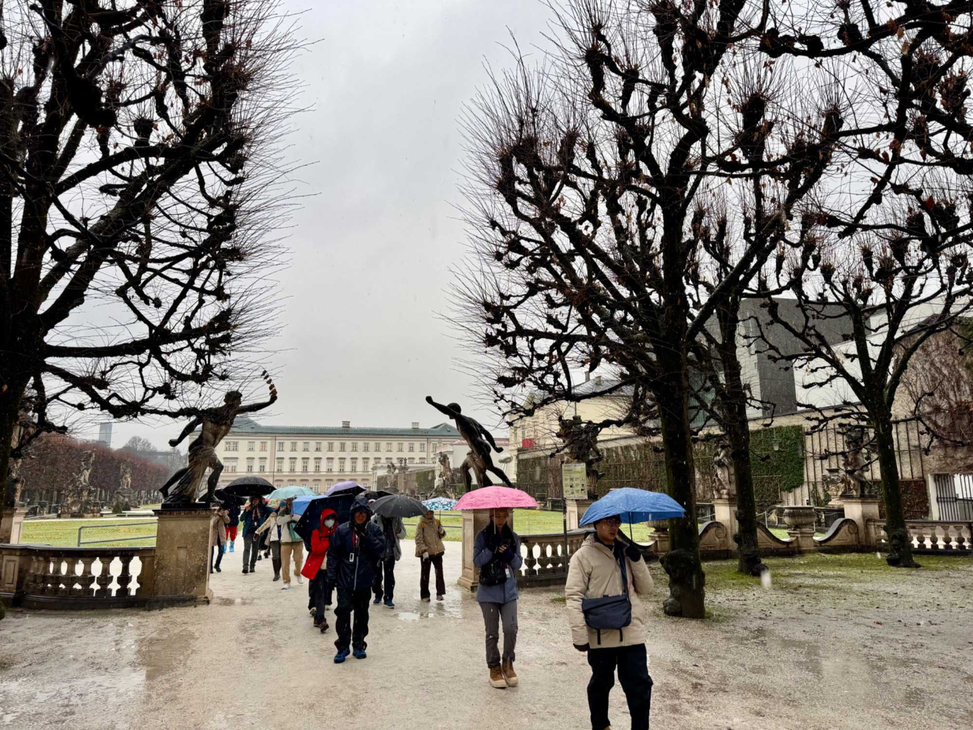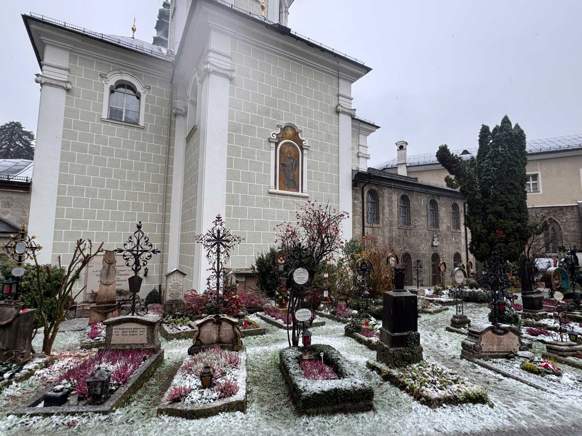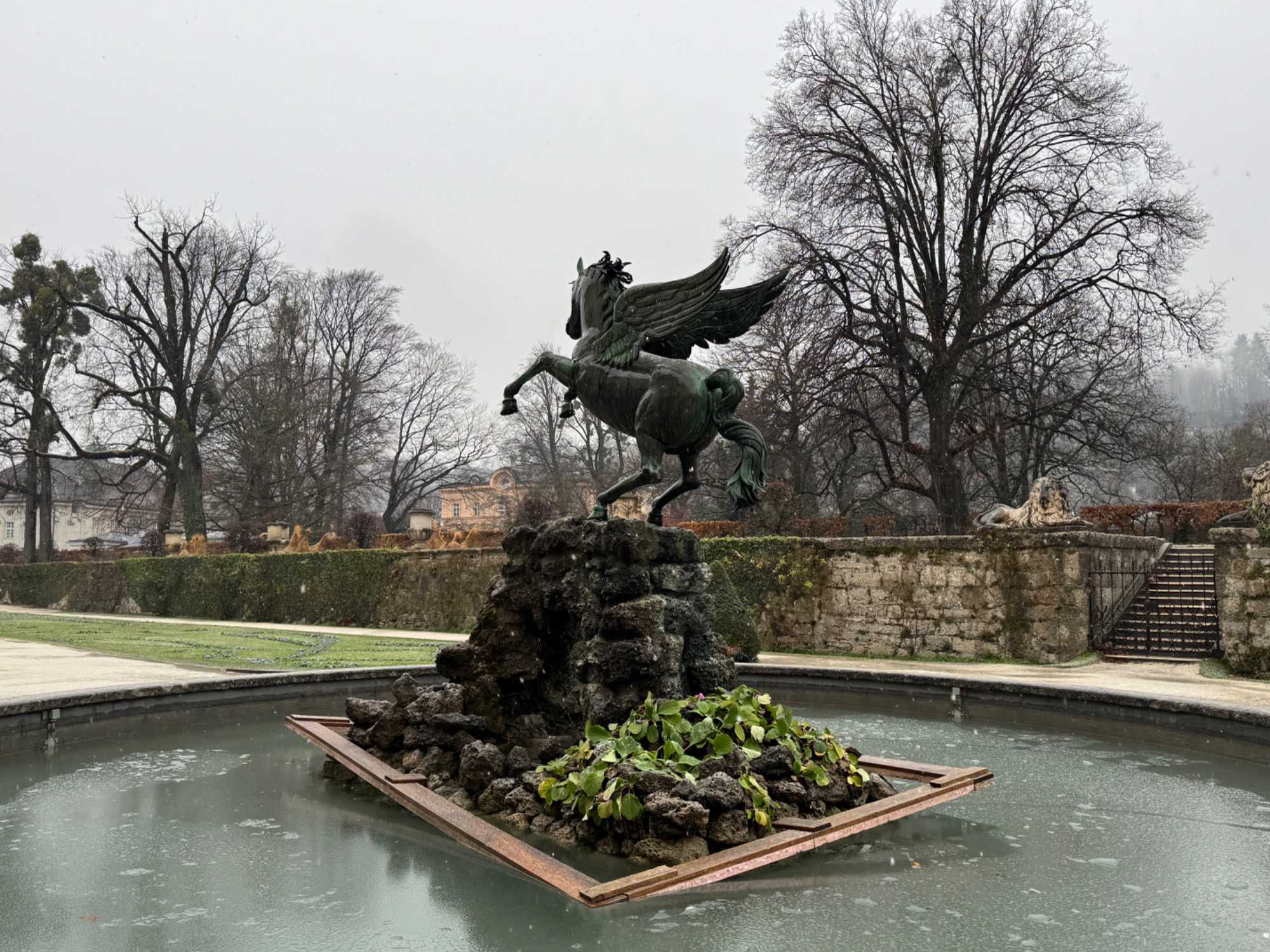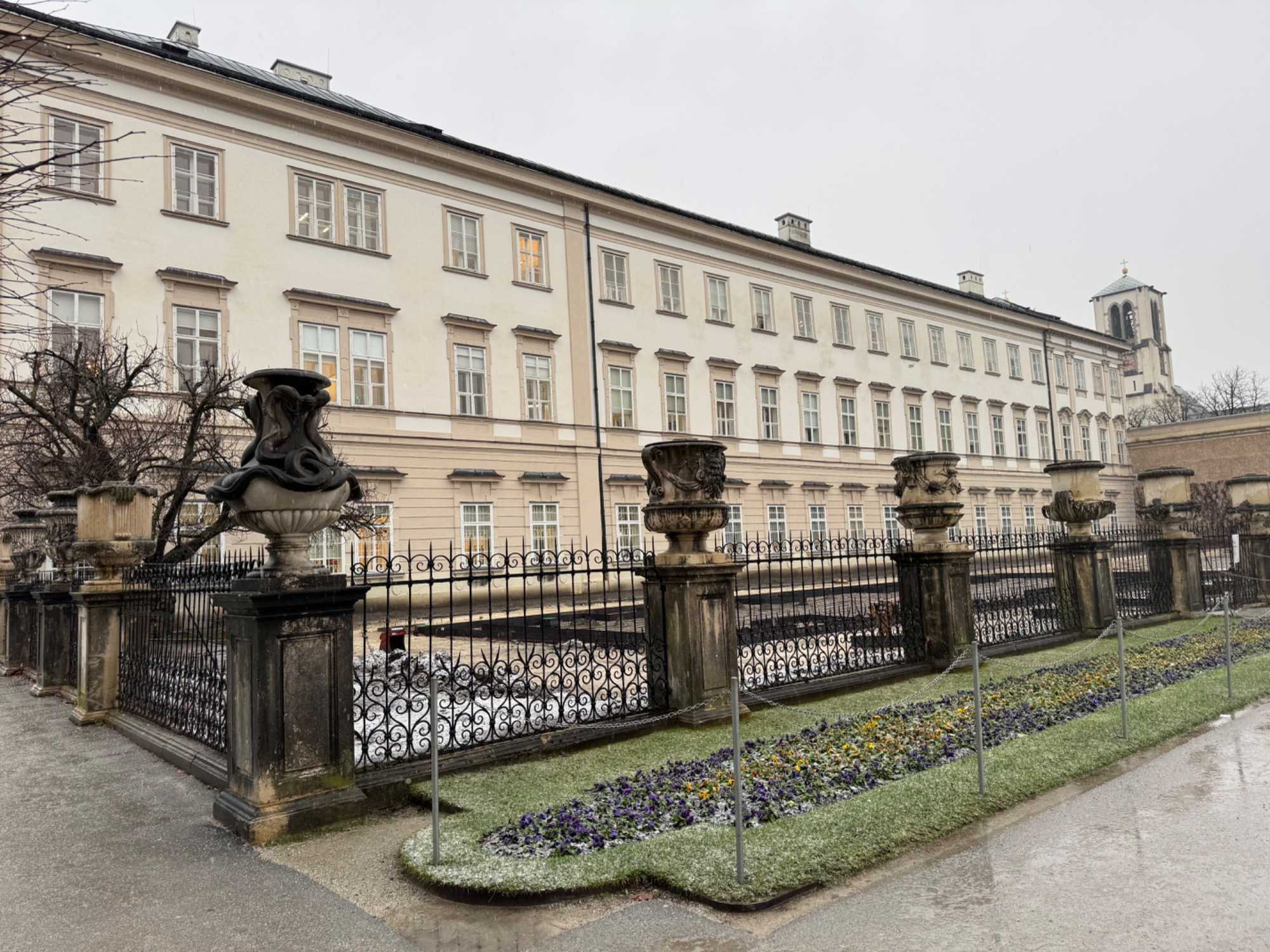 Notre promenade commence par les jardins Mirabell, véritable écrin de verdure aujourd’hui blanchi par la neige. Ses allées symétriques, ses statues et ses parterres immaculés encadrent une magnifique vue sur la forteresse Hohensalzburg, perchée sur sa colline. Ces lieux sont célèbres pour avoir servi de décor à plusieurs scènes du film The Sound of Music, un clin d’œil parfait à la soirée qui nous attend.