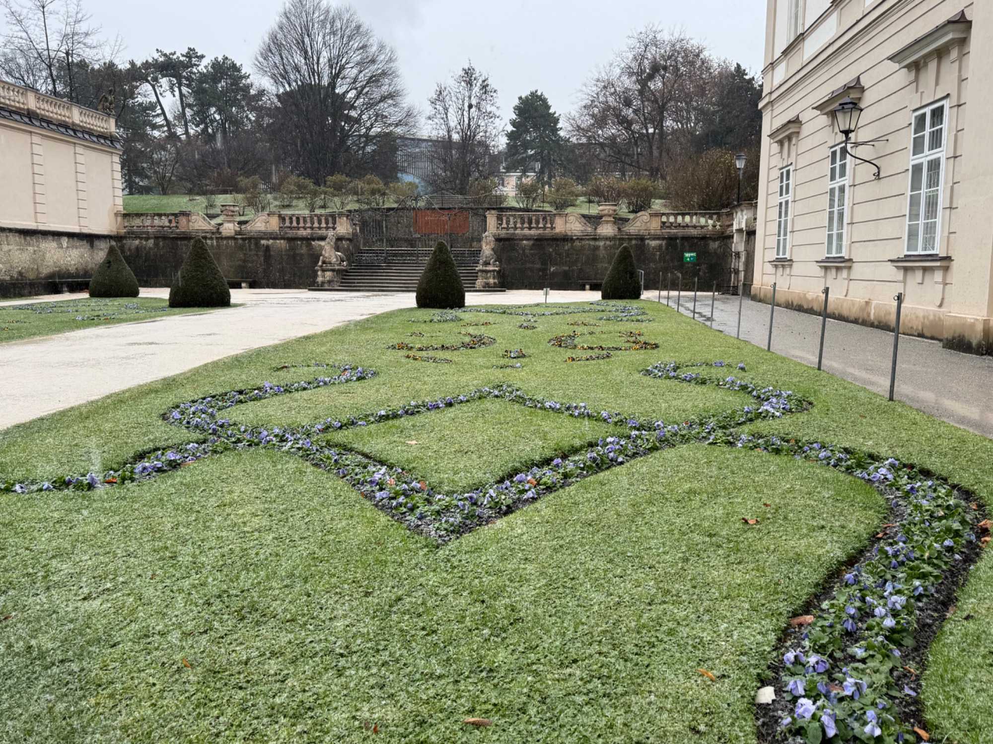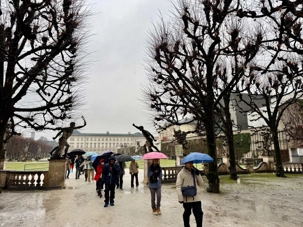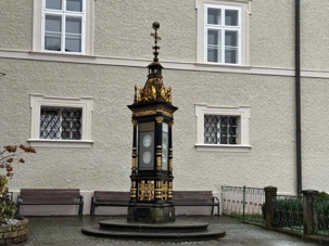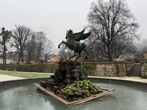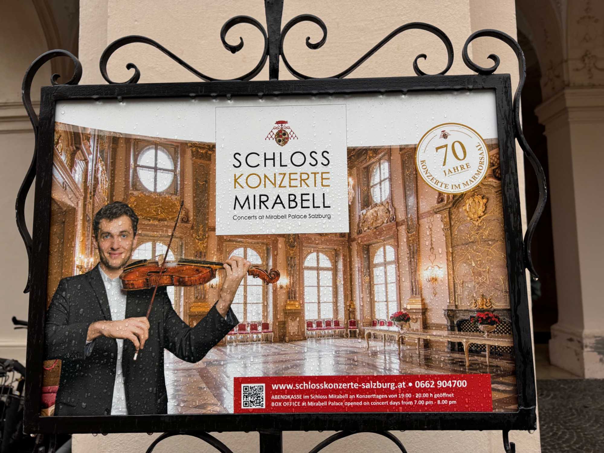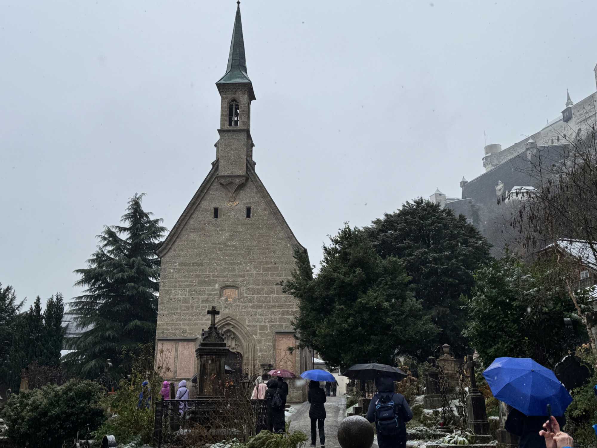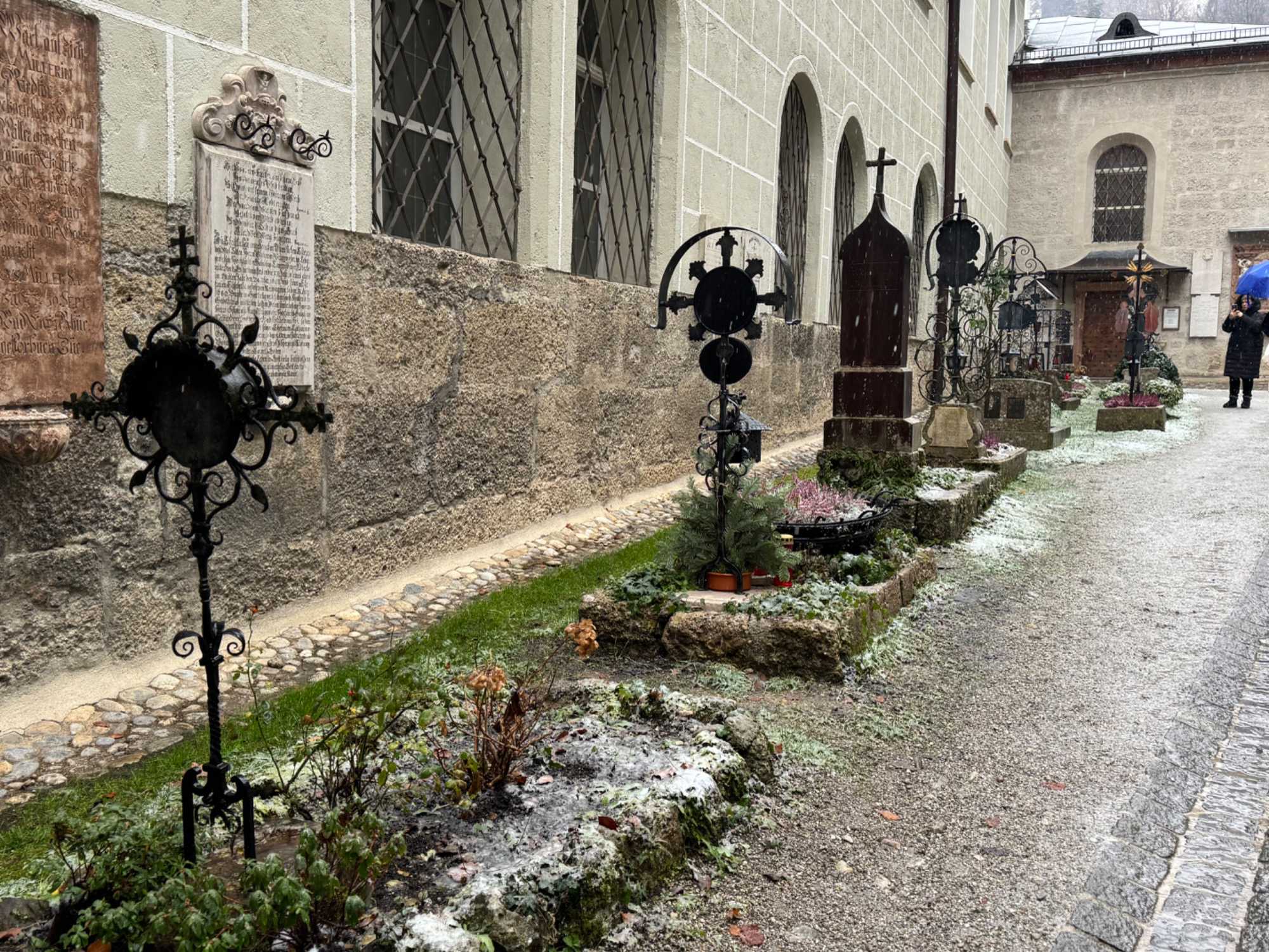 Notre promenade commence par les jardins Mirabell, véritable écrin de verdure aujourd’hui blanchi par la neige. Ses allées symétriques, ses statues et ses parterres immaculés encadrent une magnifique vue sur la forteresse Hohensalzburg, perchée sur sa colline. Ces lieux sont célèbres pour avoir servi de décor à plusieurs scènes du film The Sound of Music, un clin d’œil parfait à la soirée qui nous attend.