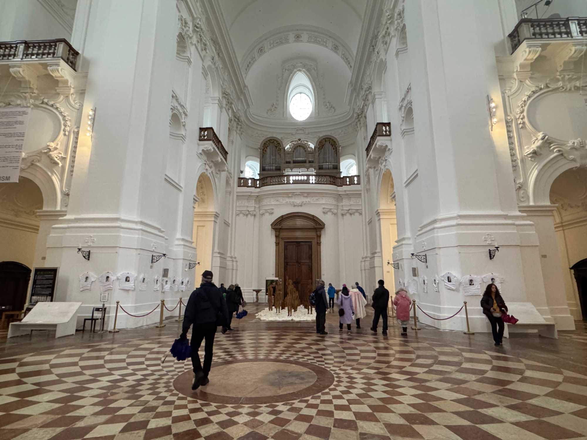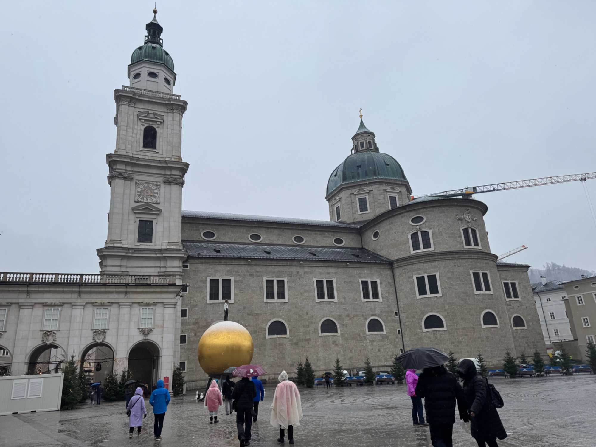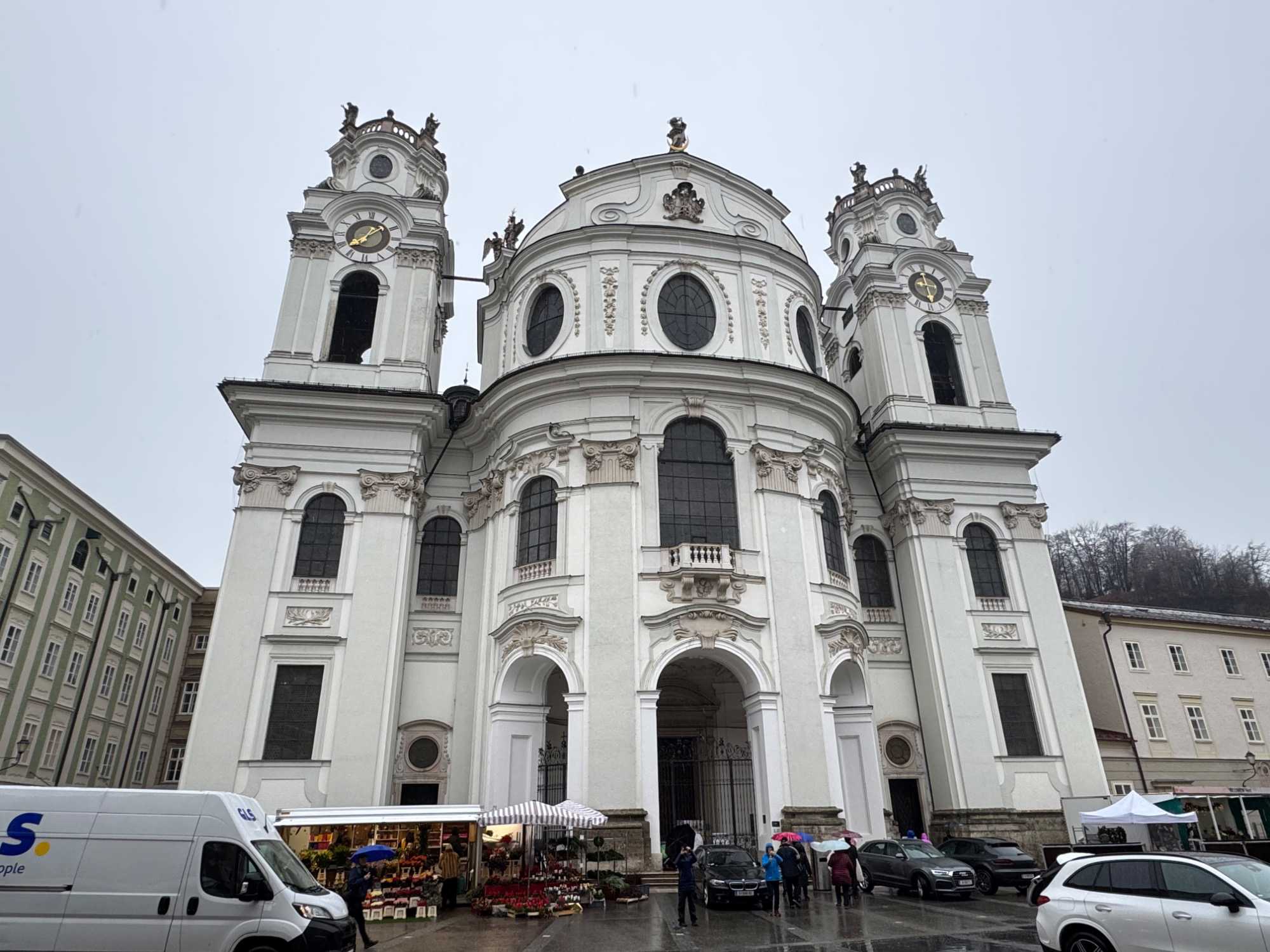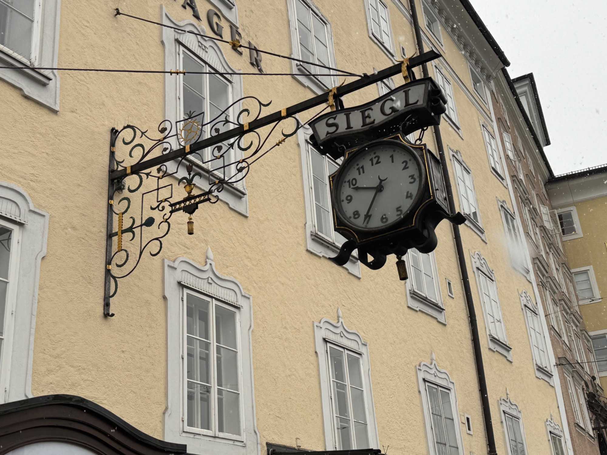 Nous traversons ensuite la Salzach pour rejoindre la vieille ville, classée au patrimoine mondial de l’UNESCO. Les ruelles pavées, les façades pastel légèrement poudrées de neige et les enseignes en fer forgé doré racontent une histoire vieille de plusieurs siècles. Sur la place de la Cathédrale, Helga nous explique l’importance de ce lieu dans la vie religieuse et musicale de Salzbourg : Mozart lui-même y joua de l’orgue lorsqu’il était enfant.