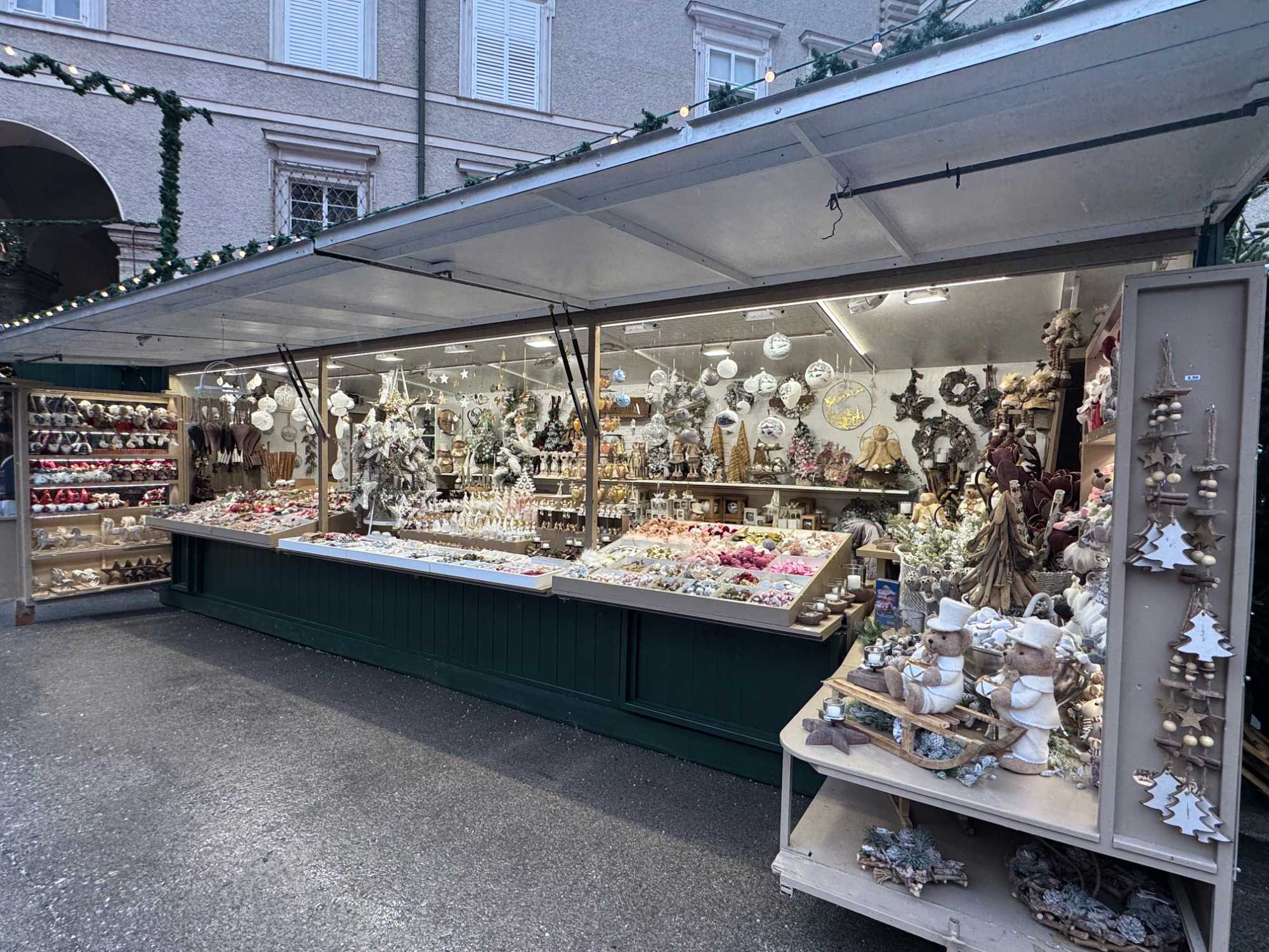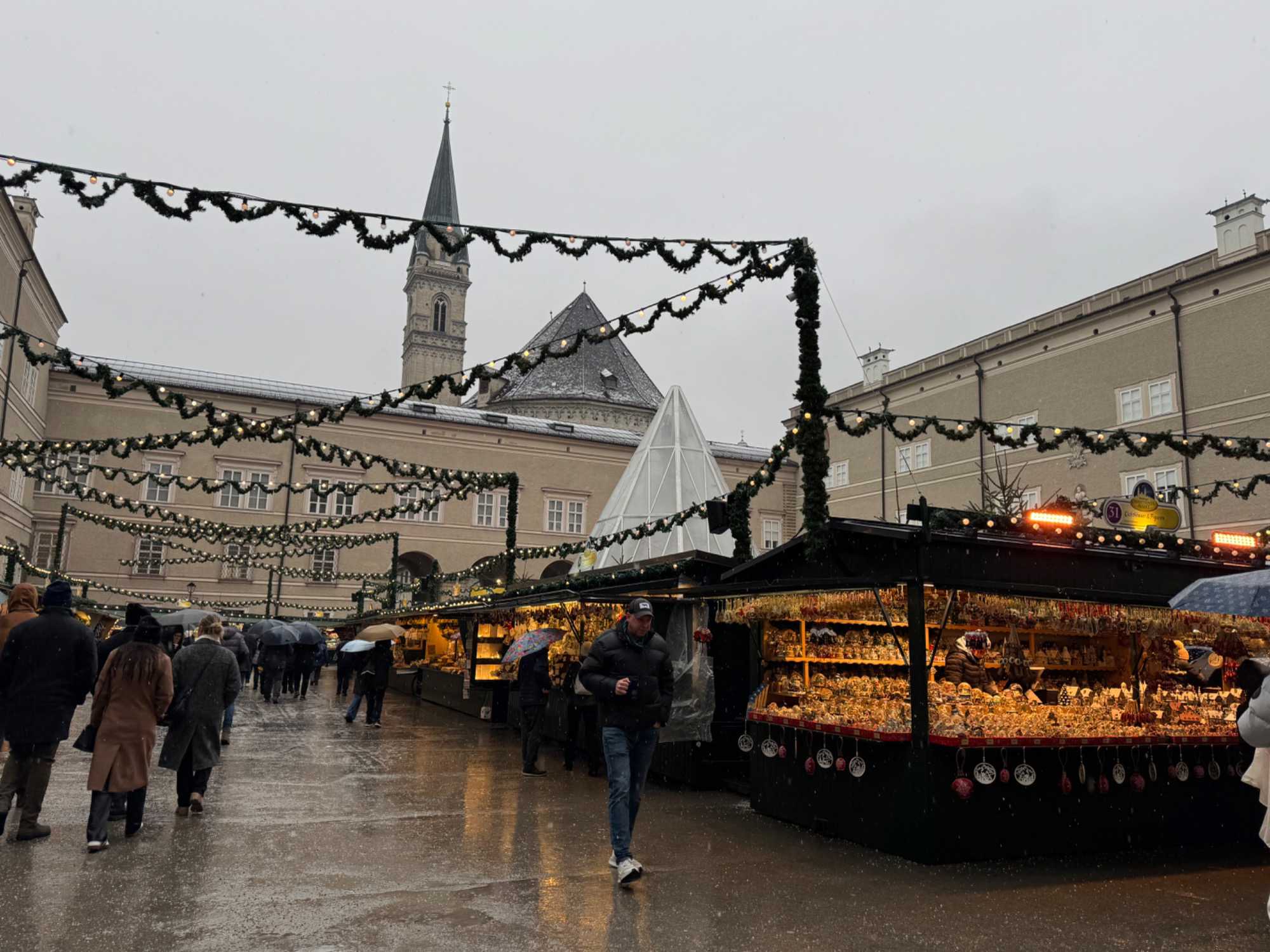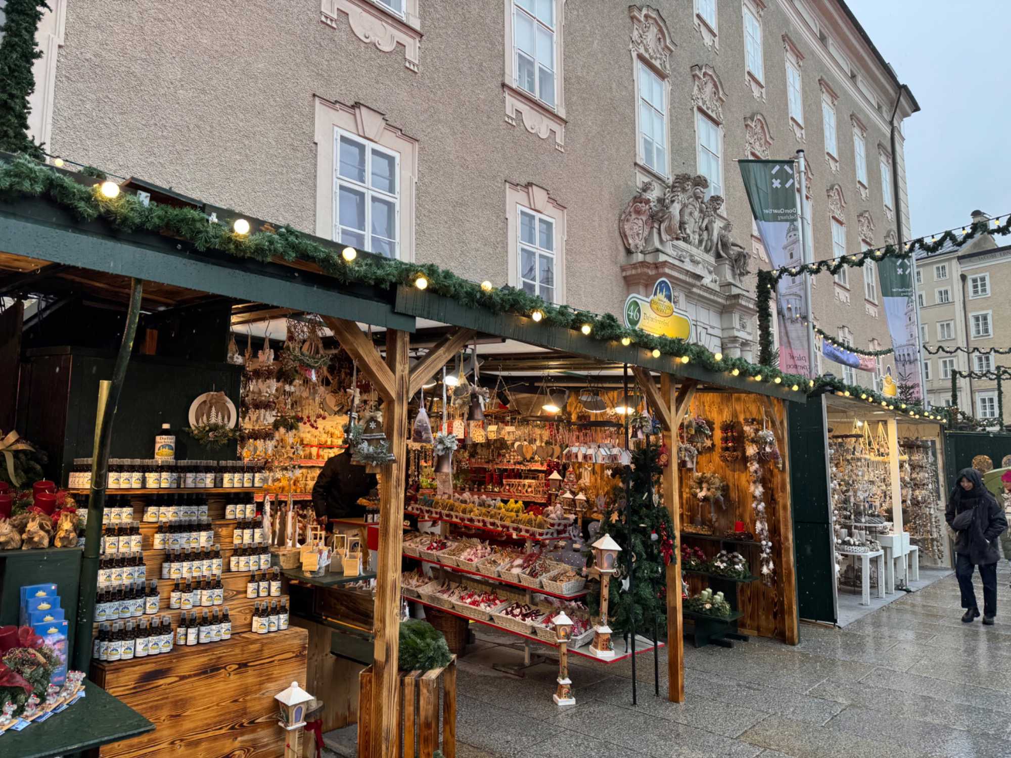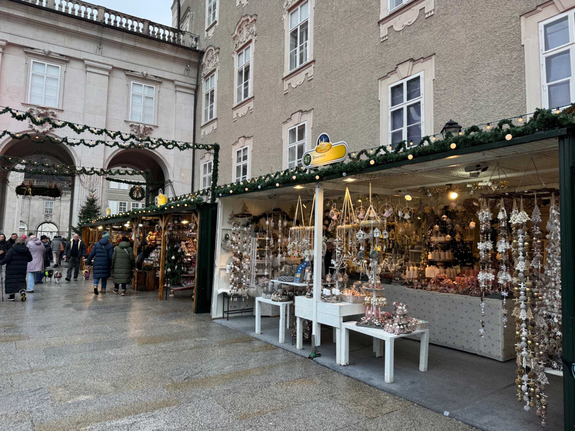 Installé sur la Residenzplatz et la Domplatz, le marché scintille sous la neige fraîche : chalets de bois décorés, guirlandes lumineuses et artisanat traditionnel se mêlent aux effluves de vin chaud et de cannelle. Nous flânons entre les étals, admirant les crèches sculptées, les couronnes de l’Avent, les bijoux faits main, tout en dégustant quelques douceurs locales. L’ambiance est féérique : chants de Noël, rires et cloches d’église composent une véritable symphonie hivernale.