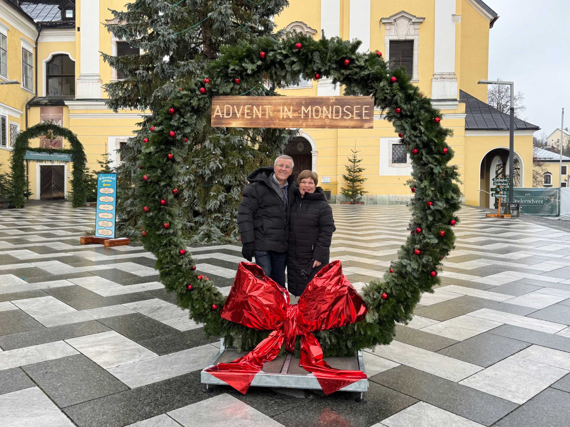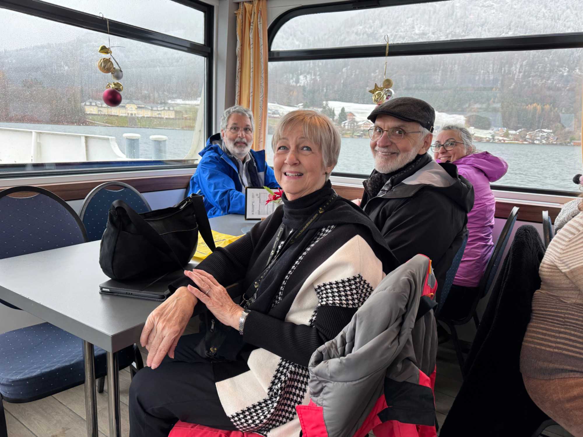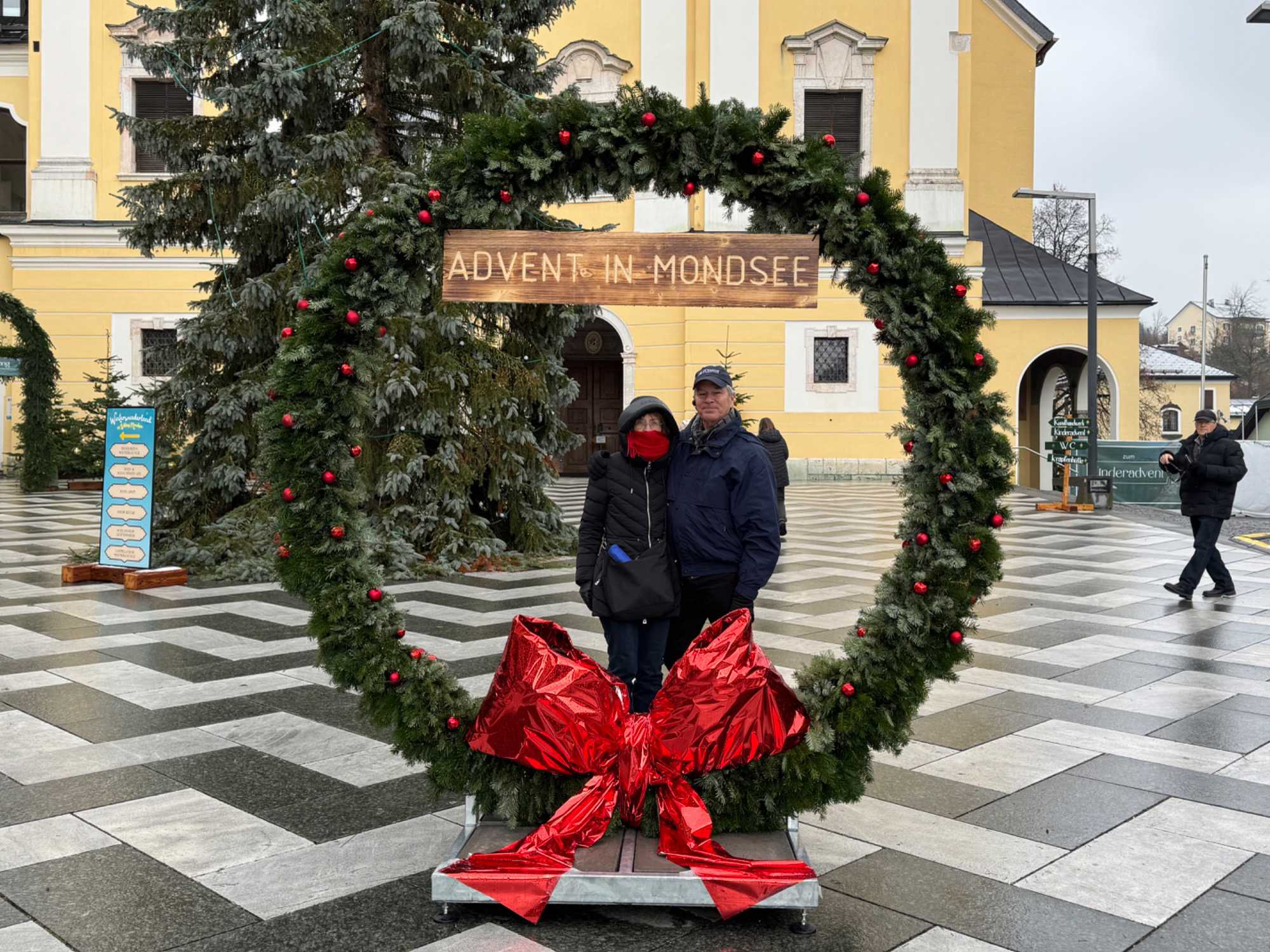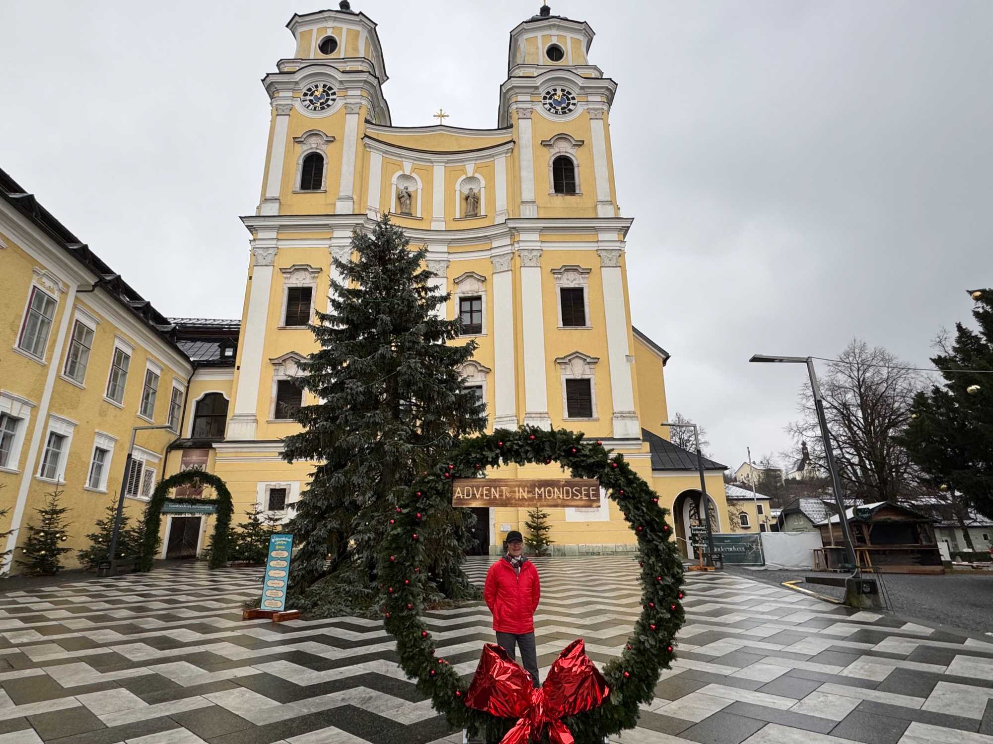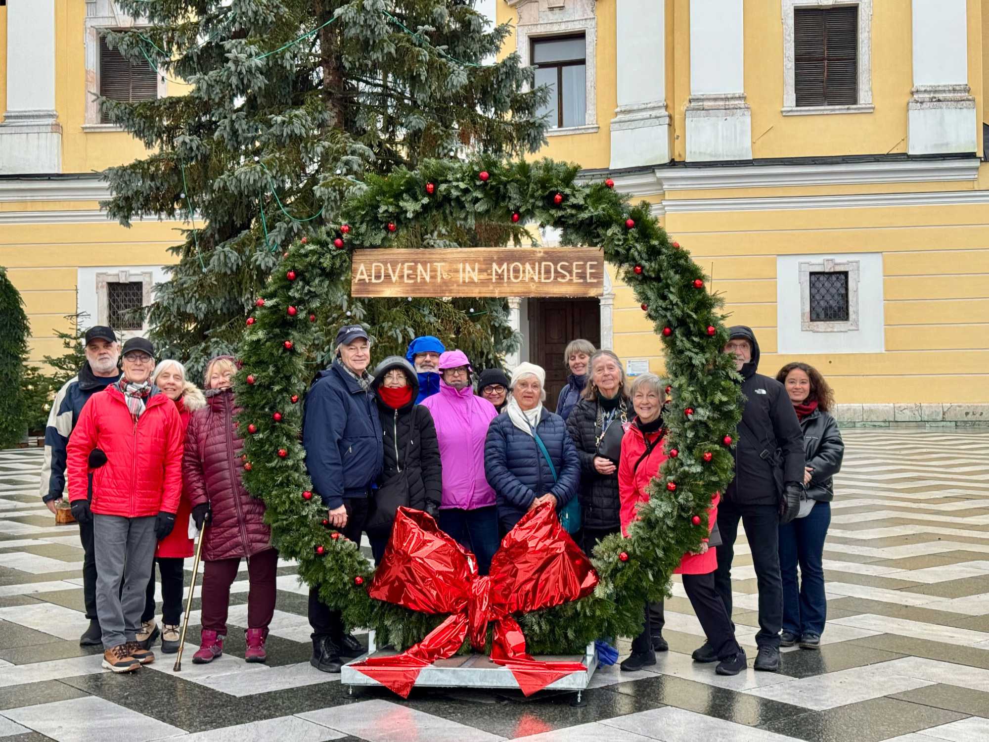 Dès les premiers kilomètres, nous sommes émerveillés par les paysages : lacs scintillants, forêts colorées et villages charmants. Valérie nous raconte l’histoire de cette région autrefois prisée par les empereurs pour leurs séjours d’été. Notre première halte est Mondsee, célèbre pour la basilique Saint-Michel où fut tournée la scène du mariage dans La Mélodie du Bonheur. Nous visitons l’église et admirons son magnifique autel baroque, puis profitons d’un moment libre pour flâner dans les ruelles décorées pour l’Avent. L’ambiance chaleureuse, le panorama sur les montagnes et la lumière douce de novembre confèrent à ce lieu un charme tout particulier. Nous poursuivons ensuite jusqu’à St. Wolfgang, où nous découvrons le marché de Noël du village, l’un des plus pittoresques du Salzkammergut. Les chalets en bois ornés de guirlandes, les anges géants et les musiciens jouant des airs de Noël créent une atmosphère féérique. Les senteurs de cannelle, de vin chaud et de pain d’épices ajoutent à la magie de cette halte.