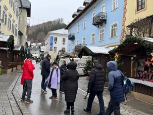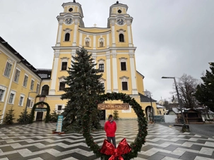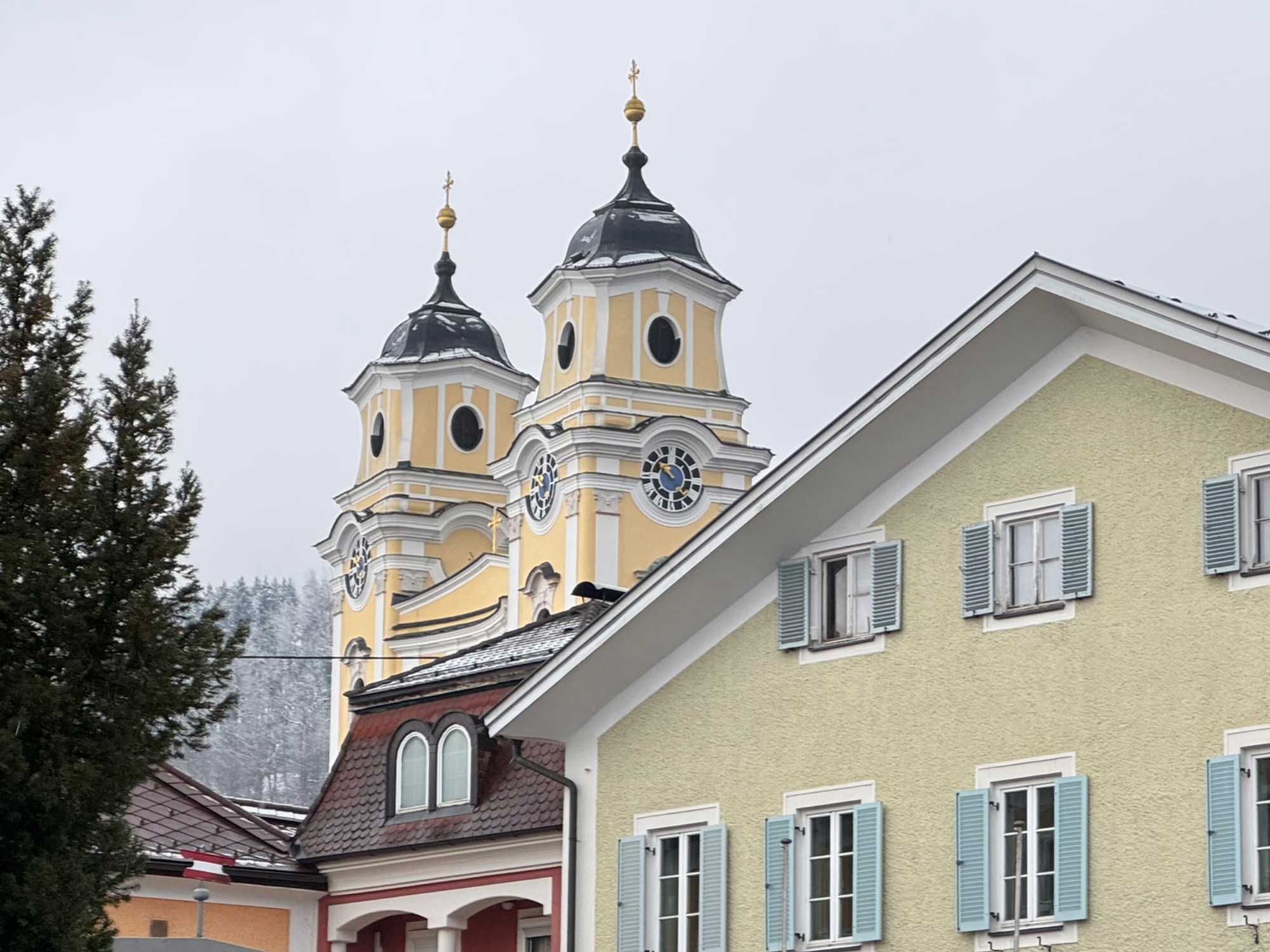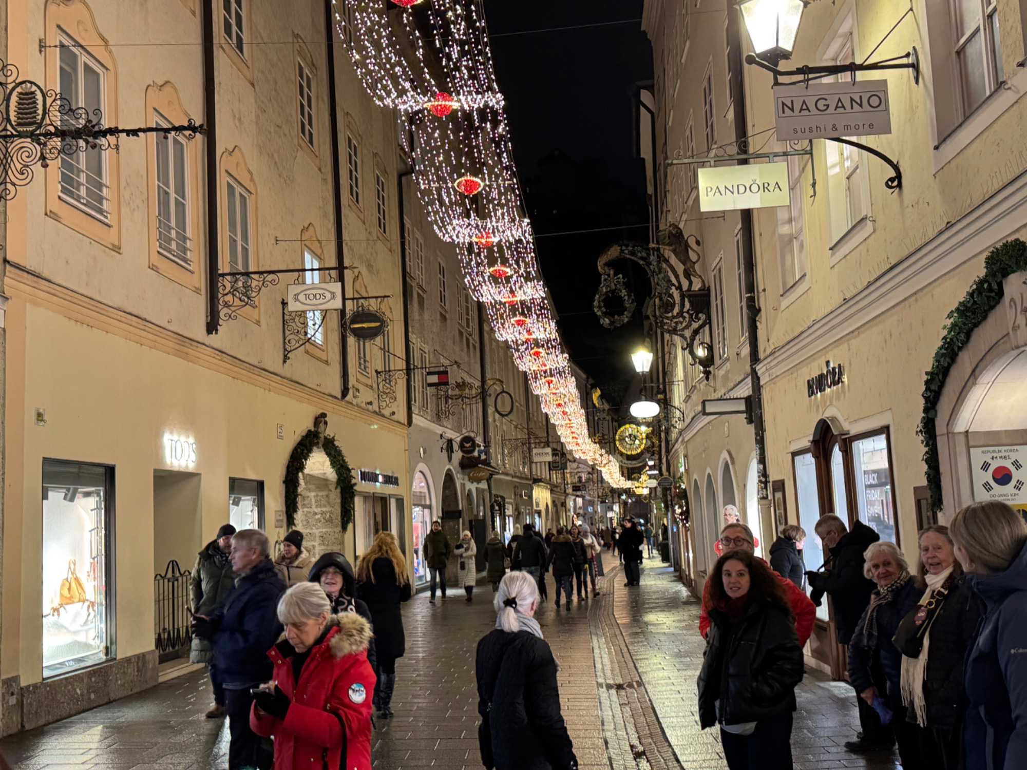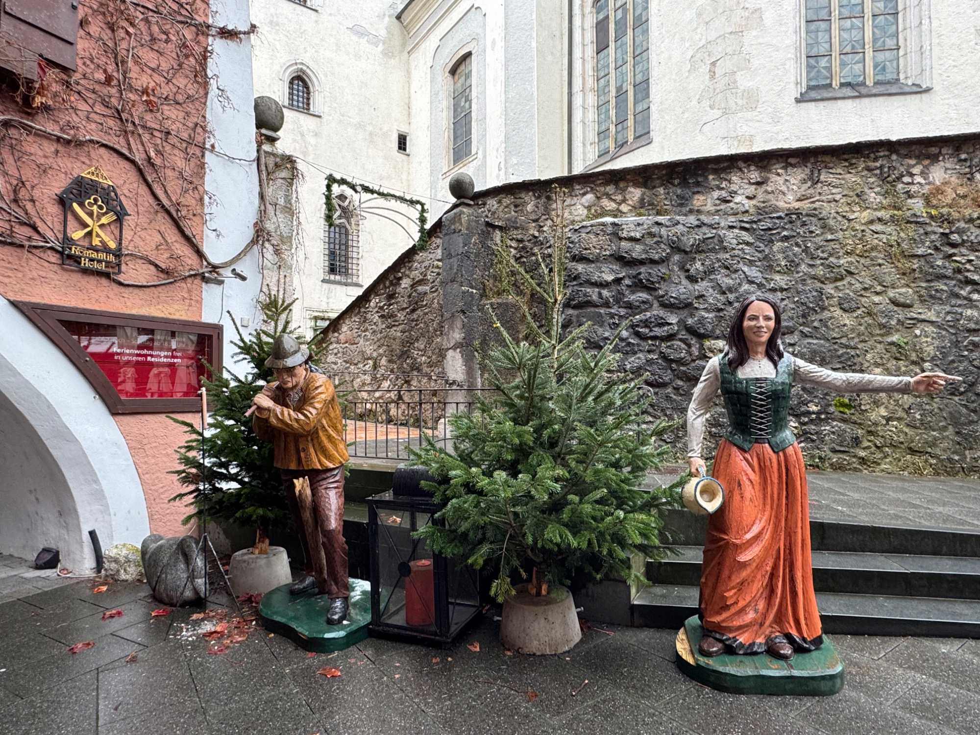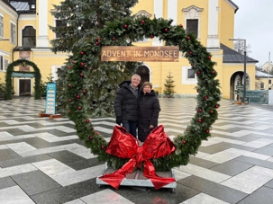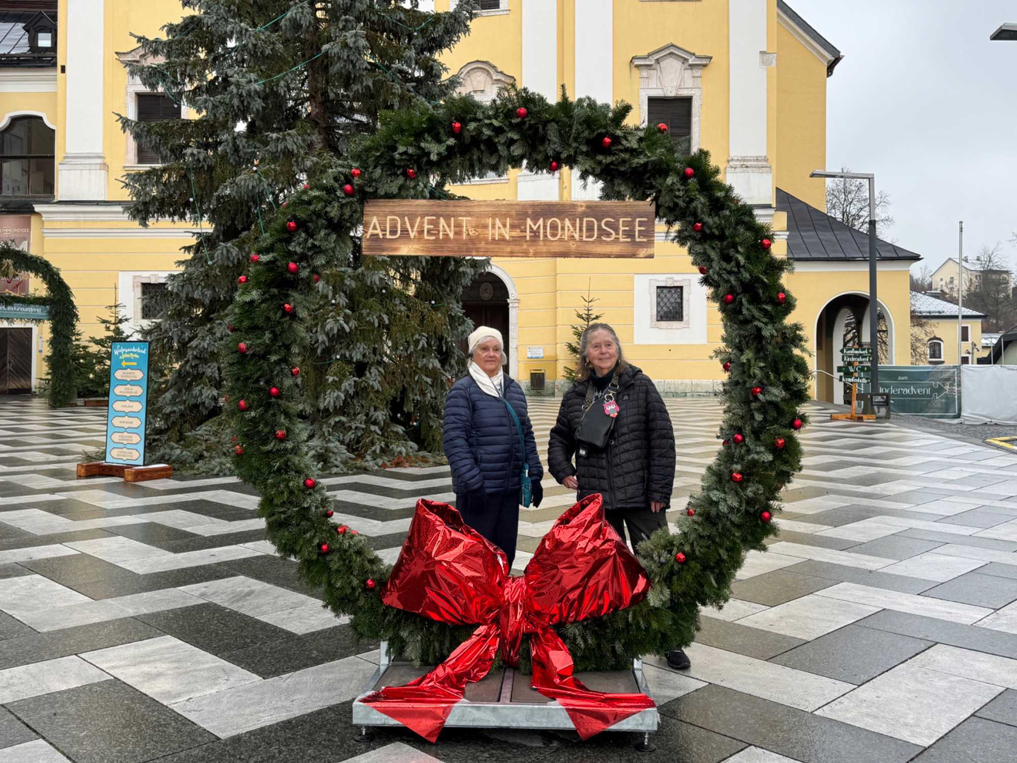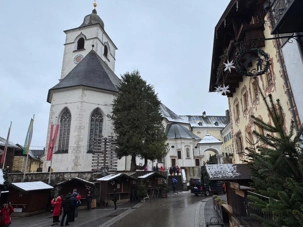 Dès les premiers kilomètres, nous sommes émerveillés par les paysages : lacs scintillants, forêts colorées et villages charmants. Valérie nous raconte l’histoire de cette région autrefois prisée par les empereurs pour leurs séjours d’été. Notre première halte est Mondsee, célèbre pour la basilique Saint-Michel où fut tournée la scène du mariage dans La Mélodie du Bonheur. Nous visitons l’église et admirons son magnifique autel baroque, puis profitons d’un moment libre pour flâner dans les ruelles décorées pour l’Avent. L’ambiance chaleureuse, le panorama sur les montagnes et la lumière douce de novembre confèrent à ce lieu un charme tout particulier. Nous poursuivons ensuite jusqu’à St. Wolfgang, où nous découvrons le marché de Noël du village, l’un des plus pittoresques du Salzkammergut. Les chalets en bois ornés de guirlandes, les anges géants et les musiciens jouant des airs de Noël créent une atmosphère féérique. Les senteurs de cannelle, de vin chaud et de pain d’épices ajoutent à la magie de cette halte.