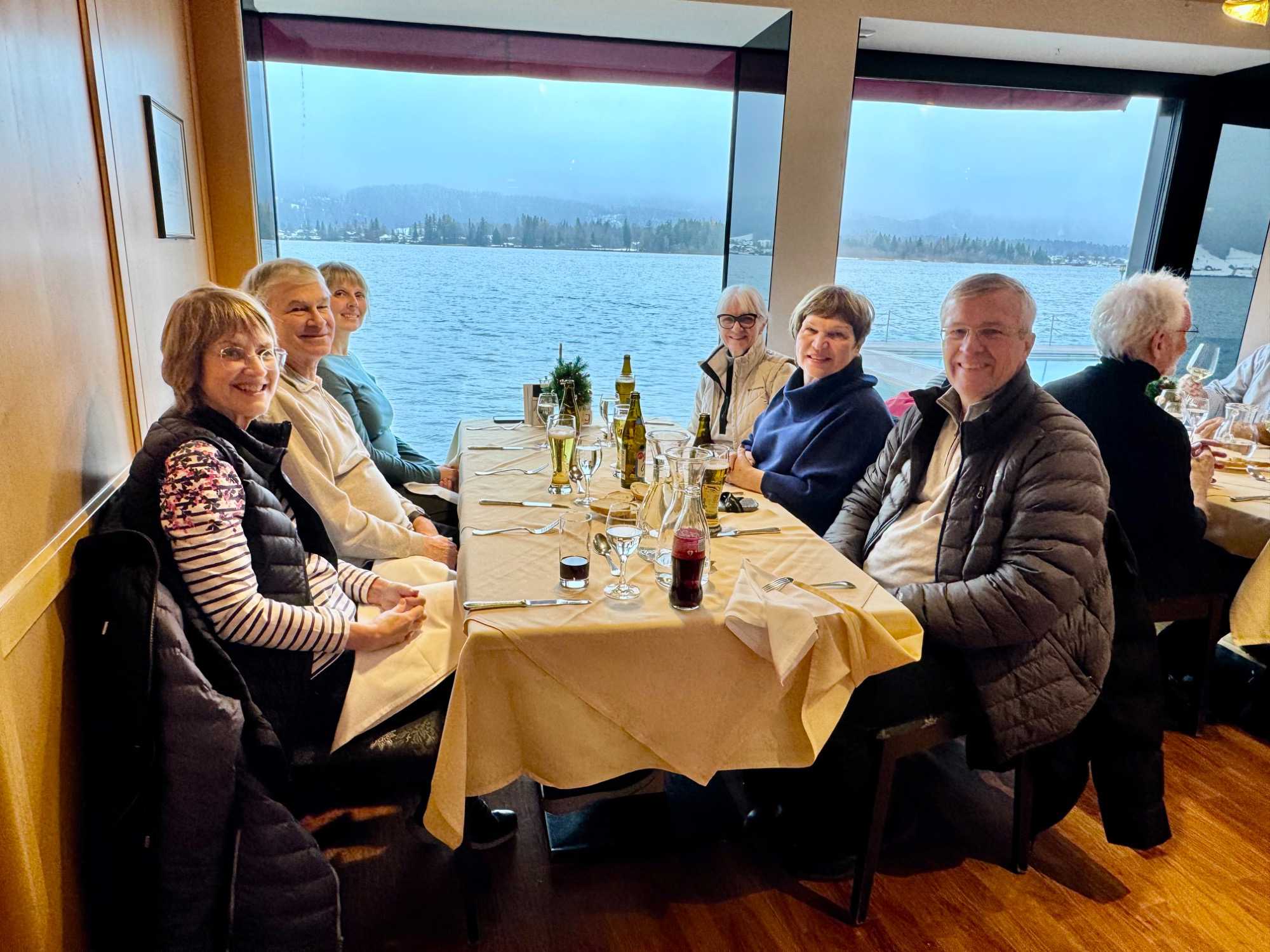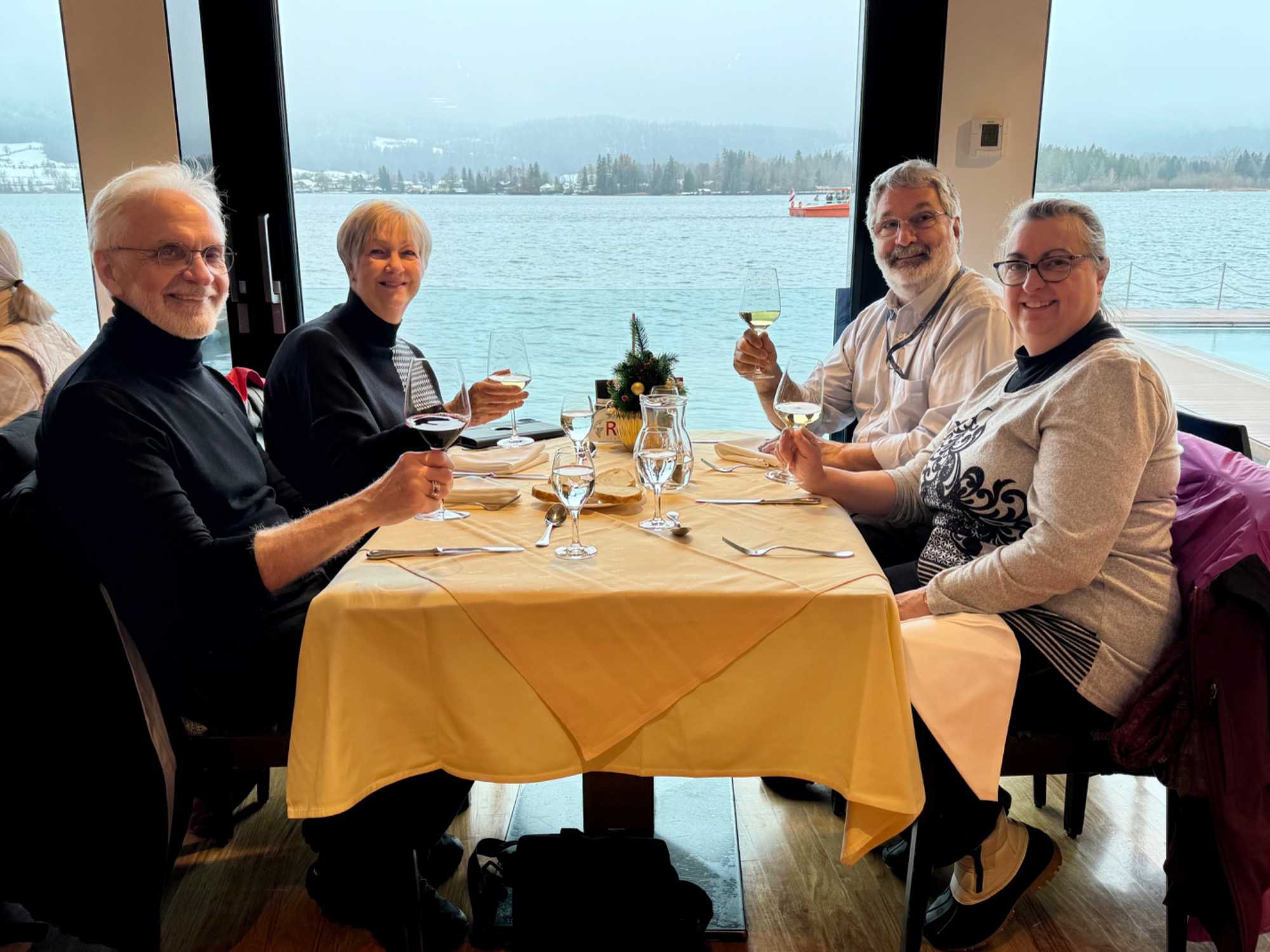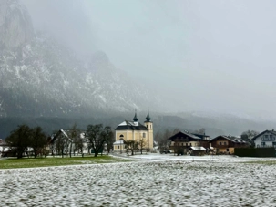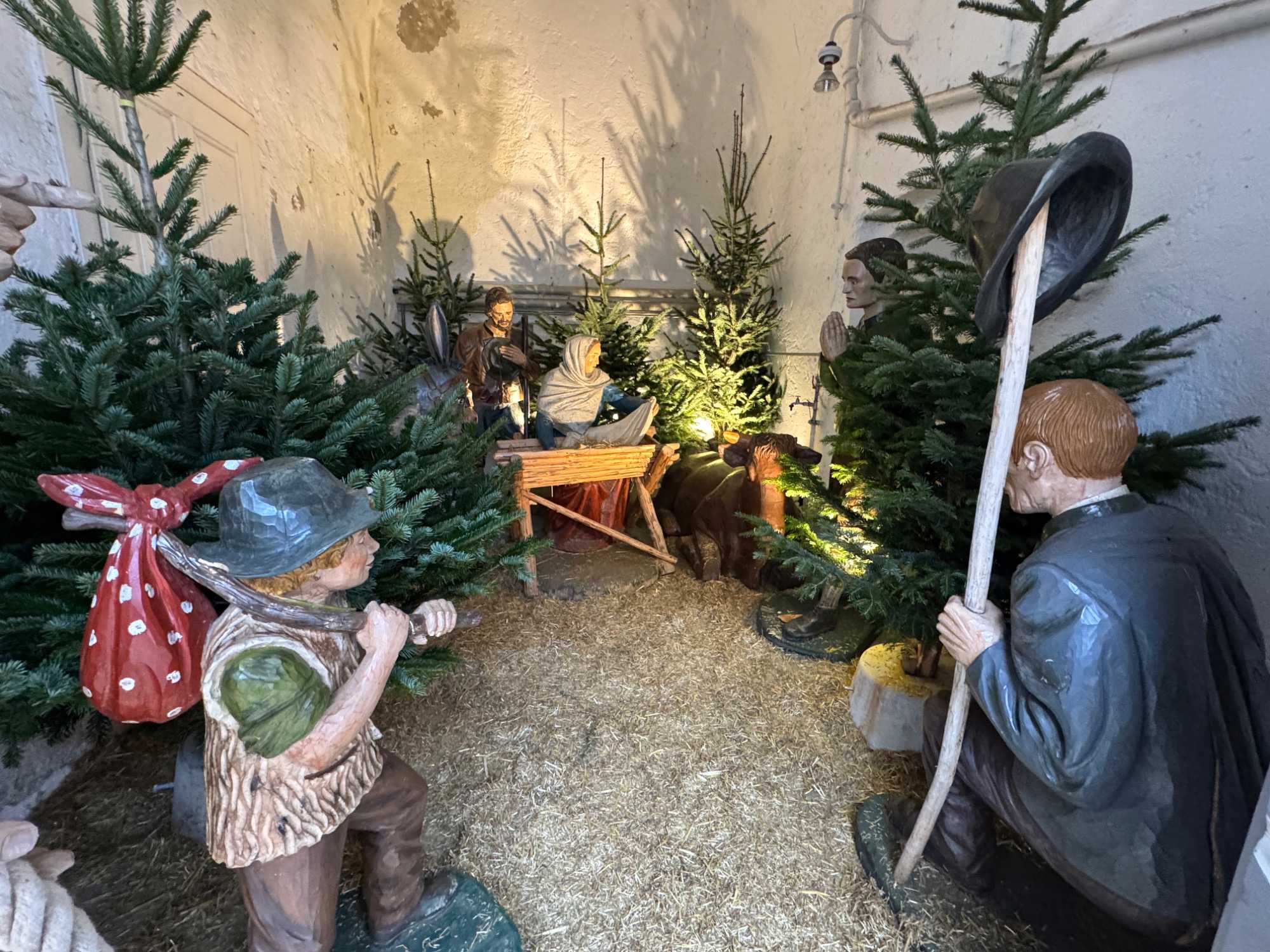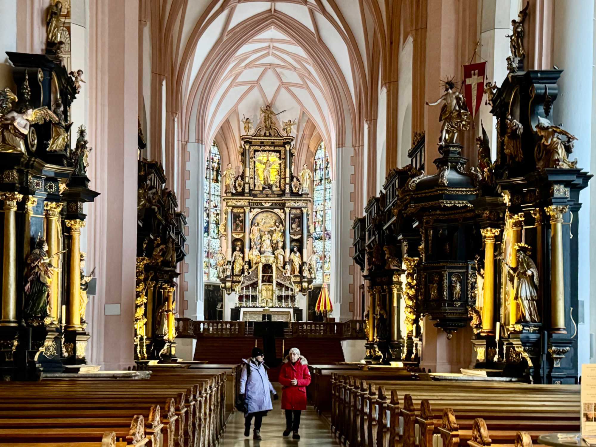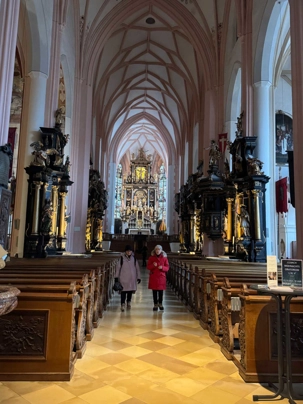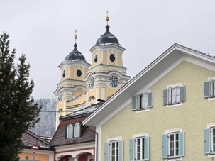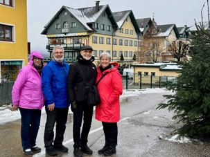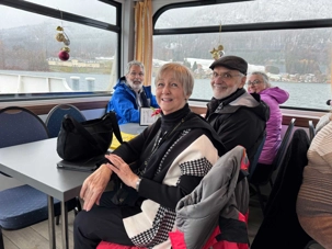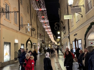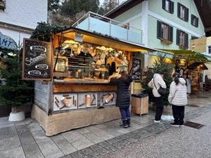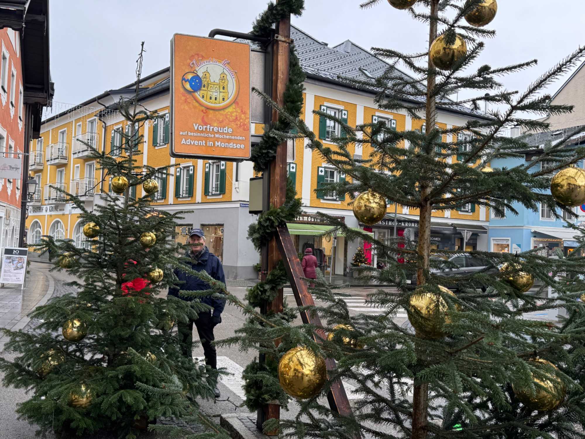 Dès les premiers kilomètres, nous sommes émerveillés par les paysages : lacs scintillants, forêts colorées et villages charmants. Valérie nous raconte l’histoire de cette région autrefois prisée par les empereurs pour leurs séjours d’été. Notre première halte est Mondsee, célèbre pour la basilique Saint-Michel où fut tournée la scène du mariage dans La Mélodie du Bonheur. Nous visitons l’église et admirons son magnifique autel baroque, puis profitons d’un moment libre pour flâner dans les ruelles décorées pour l’Avent. L’ambiance chaleureuse, le panorama sur les montagnes et la lumière douce de novembre confèrent à ce lieu un charme tout particulier. Nous poursuivons ensuite jusqu’à St. Wolfgang, où nous découvrons le marché de Noël du village, l’un des plus pittoresques du Salzkammergut. Les chalets en bois ornés de guirlandes, les anges géants et les musiciens jouant des airs de Noël créent une atmosphère féérique. Les senteurs de cannelle, de vin chaud et de pain d’épices ajoutent à la magie de cette halte.