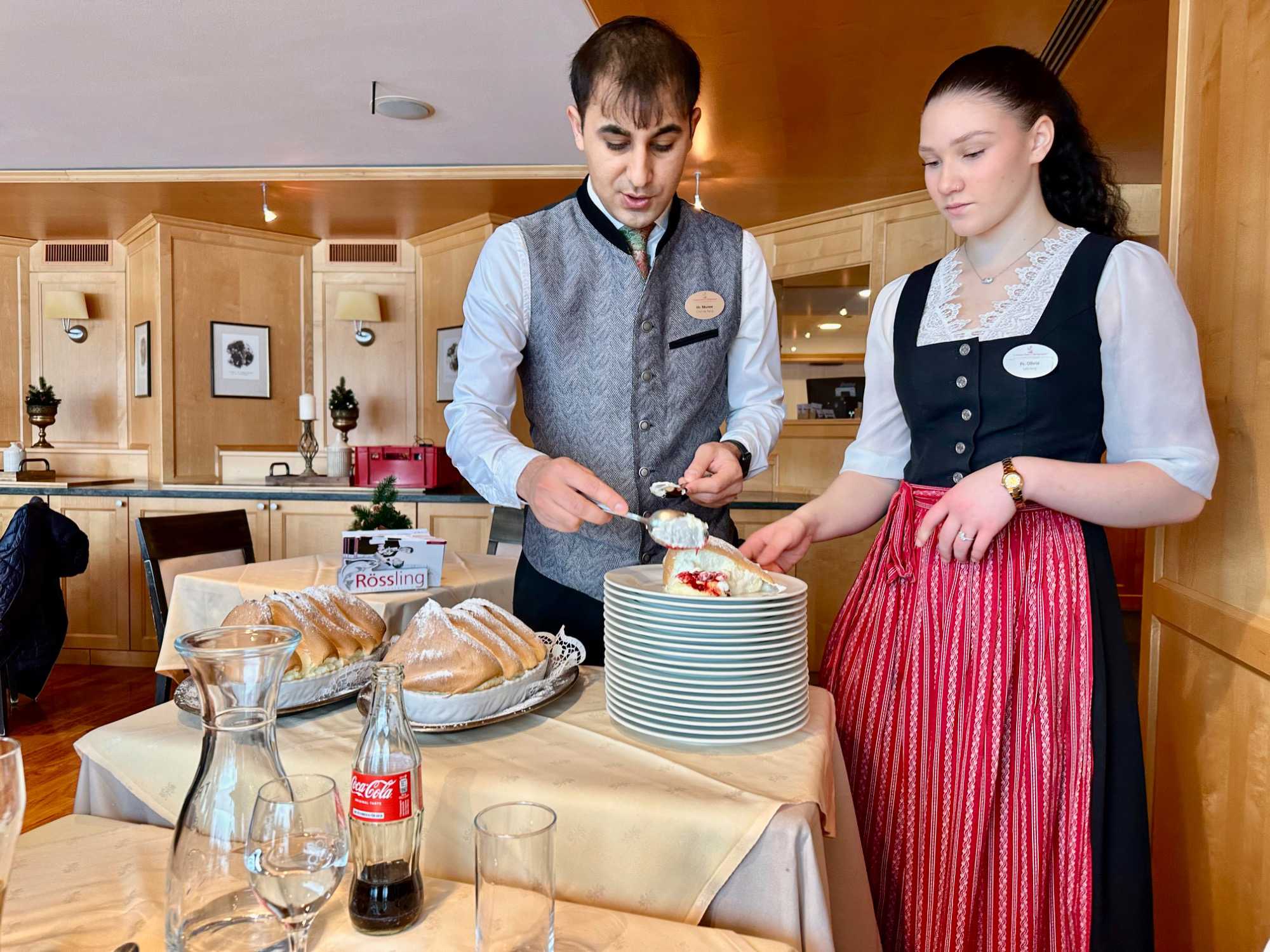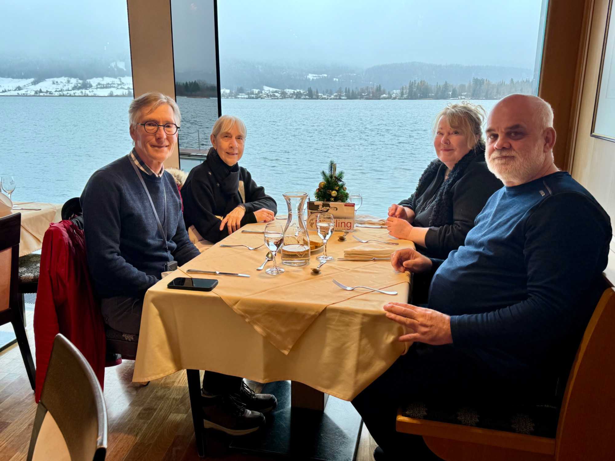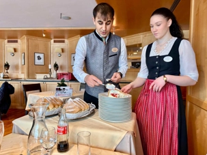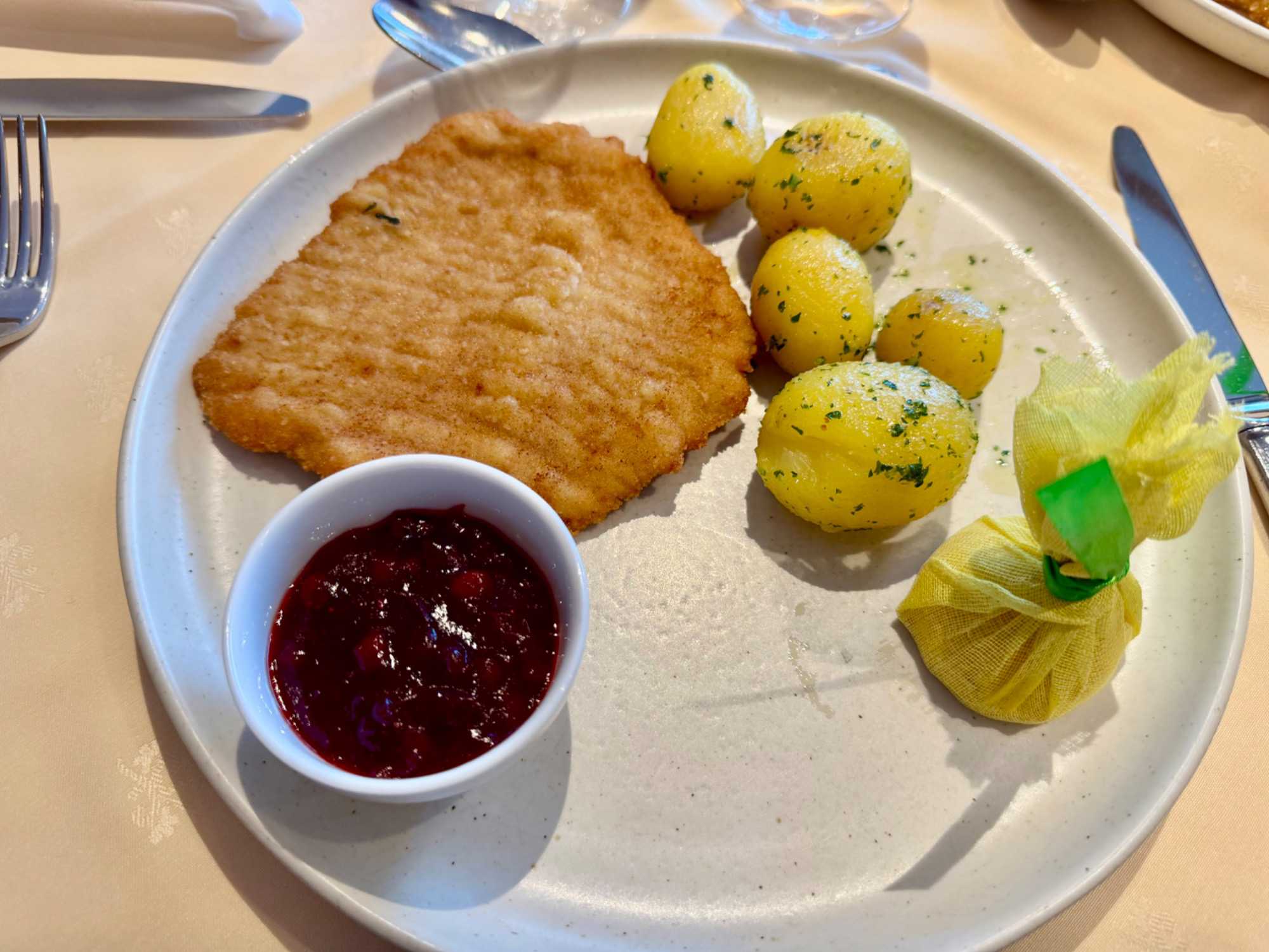 Après cette balade festive, nous savourons un délicieux dîner au célèbre restaurant Weisses Rössl, au bord du lac, une véritable institution rendue célèbre par l’opérette Im weißen Rössl, créée en 1930 à Berlin. Situé au cœur du village et directement au bord du Wolfgangsee, l’établissement mêle traditions culinaires, charme alpin et vues imprenables sur le lac. Nous nous régalons d’une escalope viennoise de porc accompagnée de pommes de terre au persil, suivie des Nockerl salzbourgeois, spécialité légère et aérienne à base de blancs d’œufs qui fond délicatement en bouche.