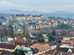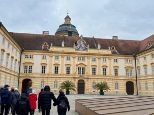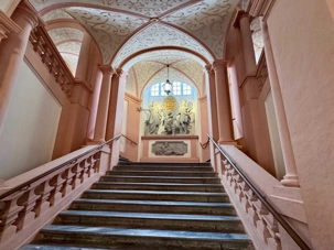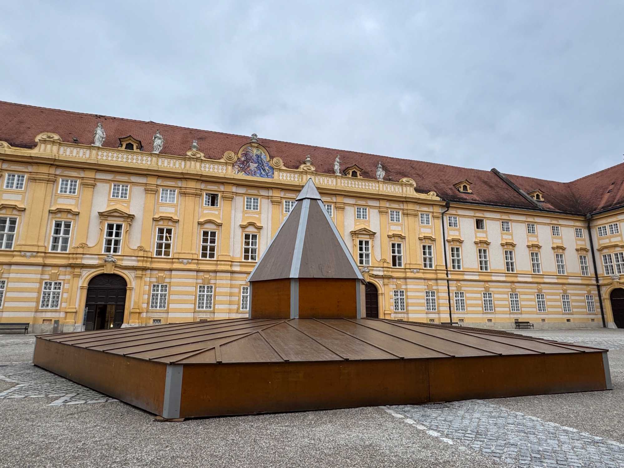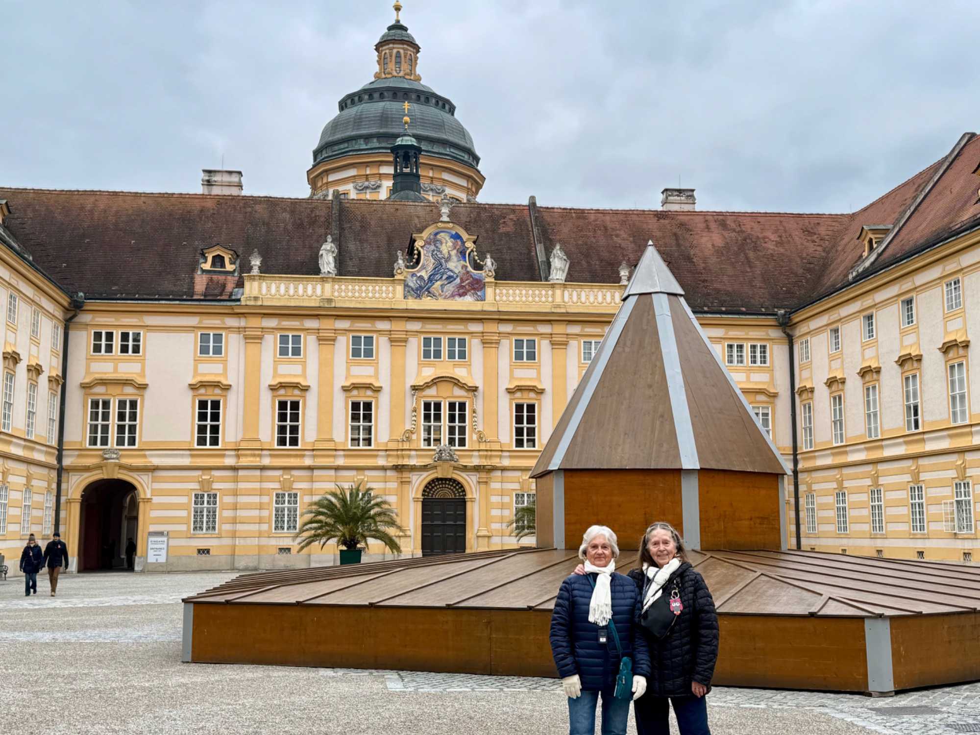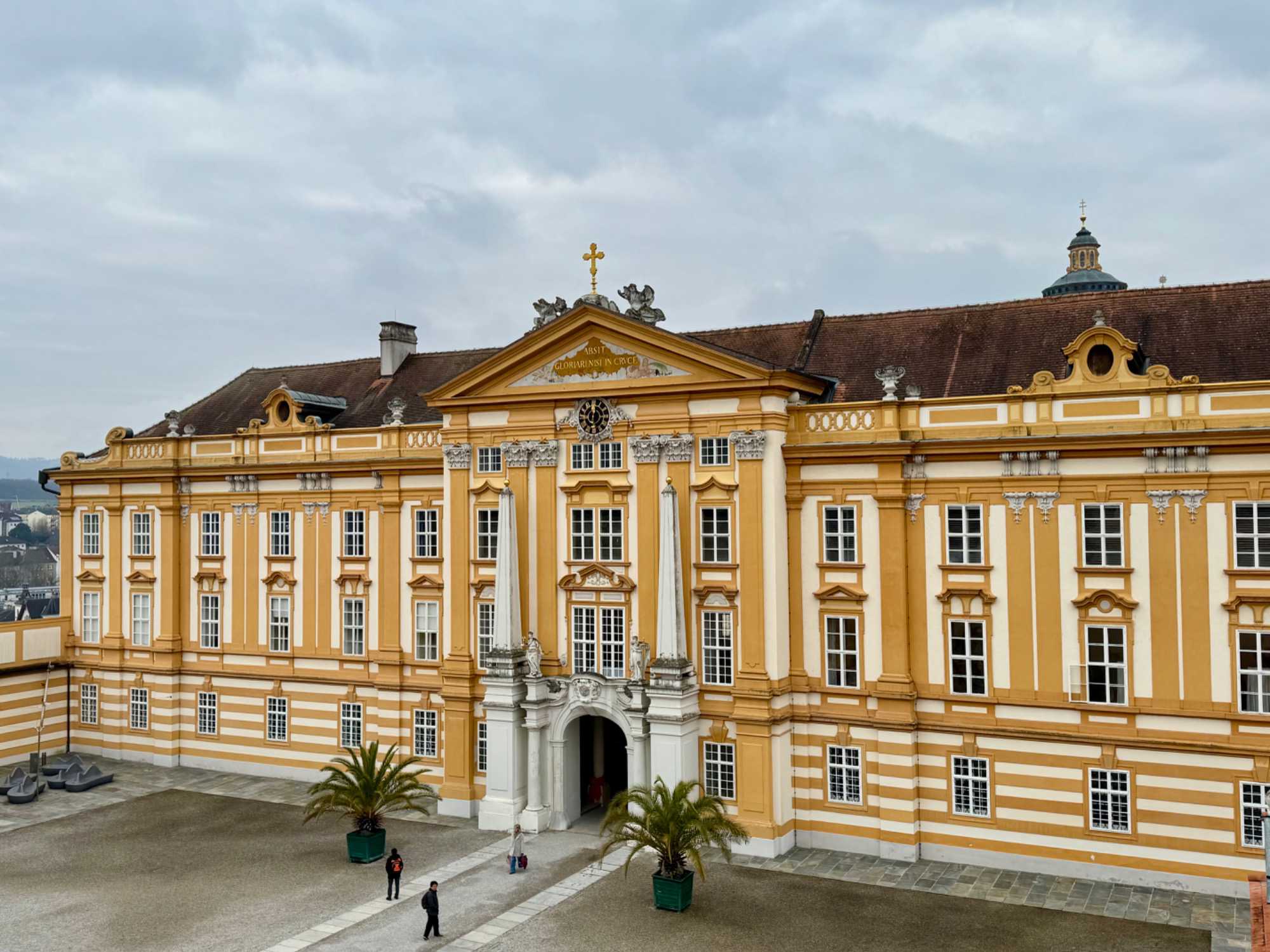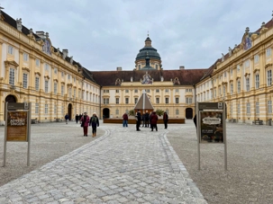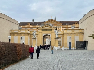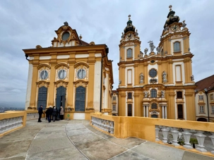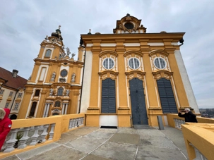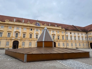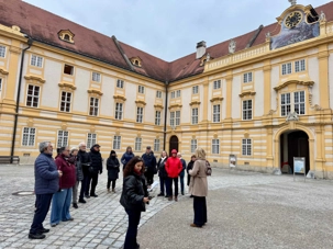 Accompagnés de notre guide, nous pénétrons dans le vaste complexe monastique en franchissant deux bastions arrondis datant du XVIIᵉ siècle. L’escalier impérial, orné de fresques et de dorures, nous mène vers l’aile d’apparat et les anciens appartements impériaux. Sur le palier, deux grands portraits de l’impératrice Marie-Thérèse et de François de Lorraine rappellent la puissance et la foi des souverains autrichiens.
