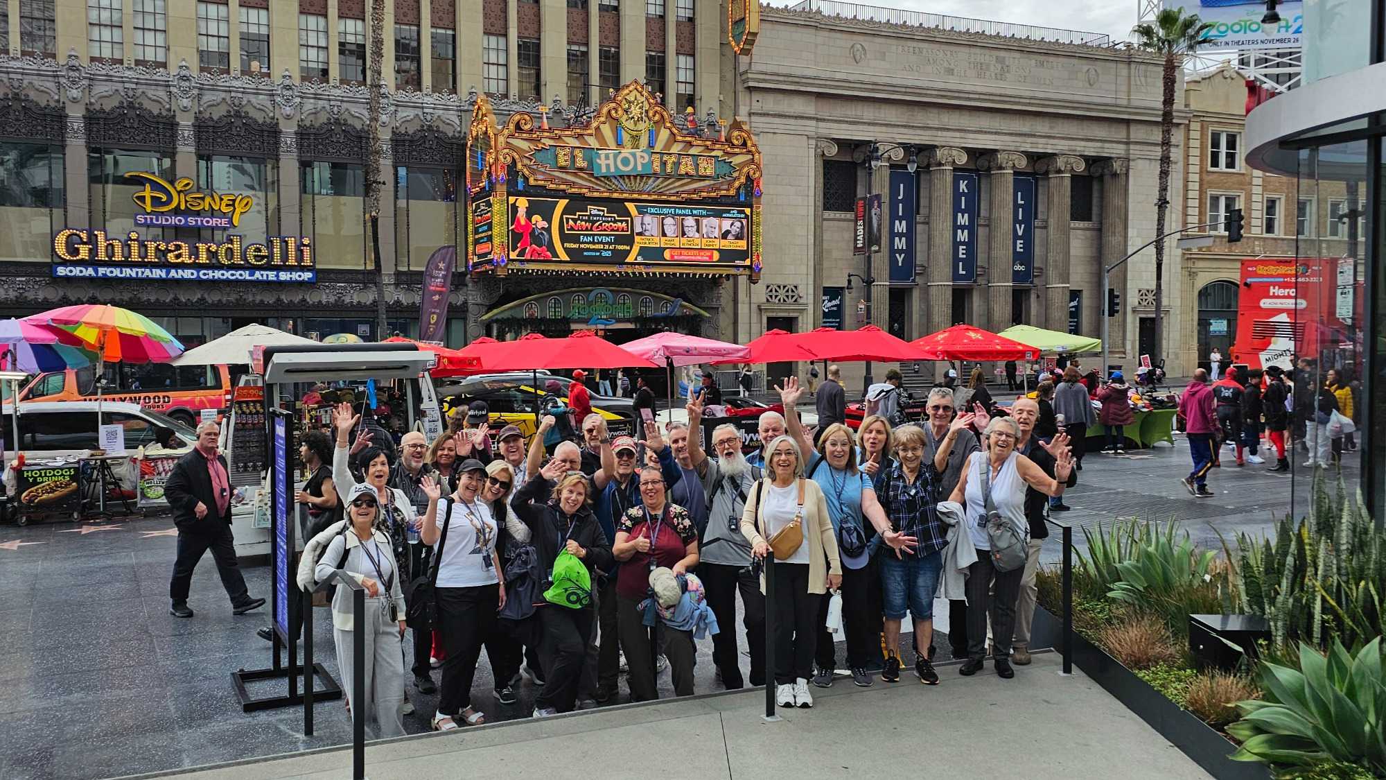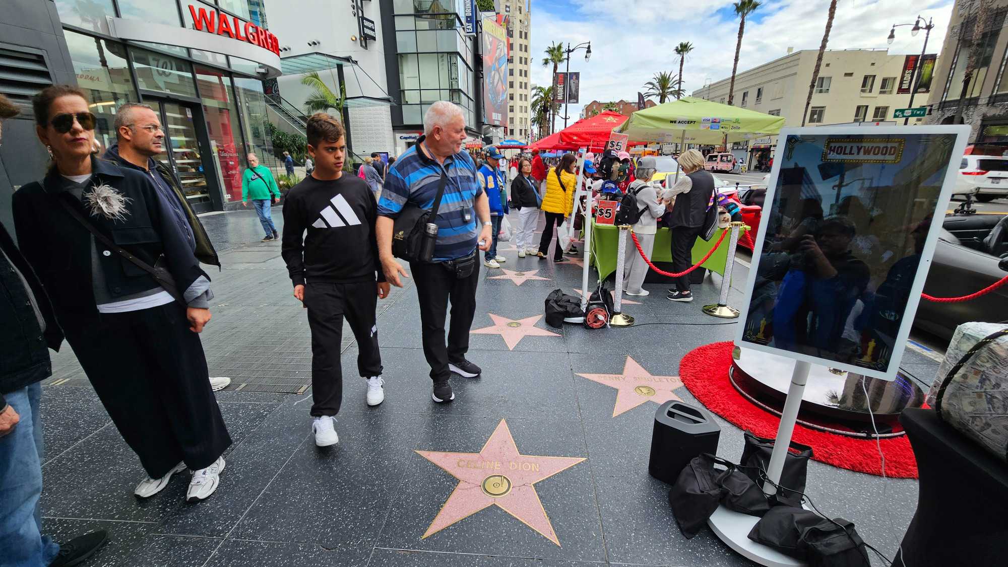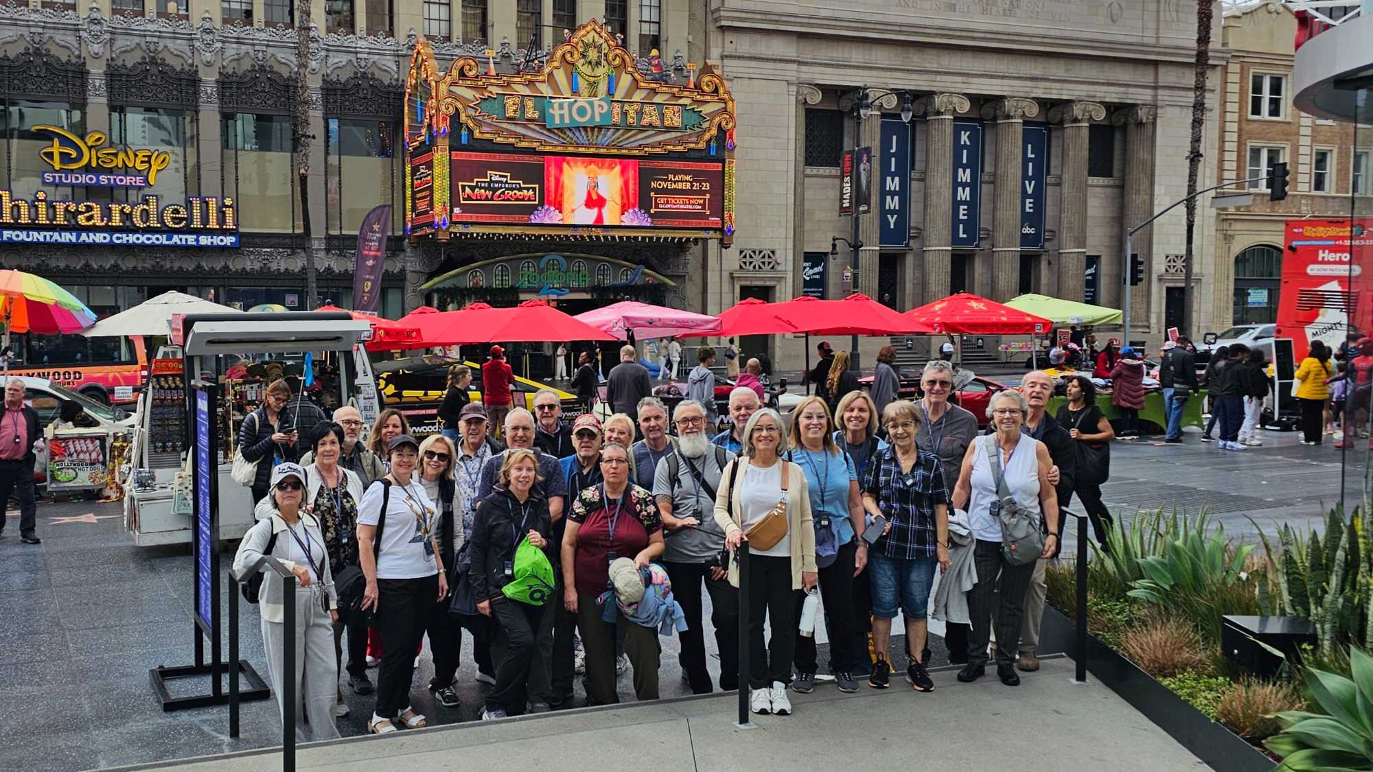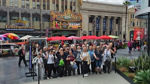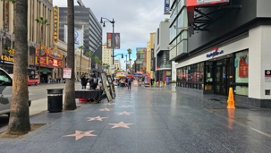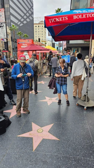 Nous avons ensuite marché sur le célèbre Hollywood Boulevard, situé directement a côté de notre hotel, au cœur du Walk of Fame, qui compte plus de 2 700 étoiles incrustées dans le trottoir en hommage aux célébrités du monde artistique. Élisabeth nous a expliqué que pour obtenir une étoile, il faut généralement débourser environ 75 000 $ – souvent payés par les studios – et être choisi par un comité qui n'approuve qu'une soixantaine de candidatures annuellement. À notre grande fierté de Québécois, nous y avons repéré les étoiles de Céline Dion et Guy Laliberté, parmi les noms mythiques comme Marilyn Monroe et Walt Disney et bien d’autres.
