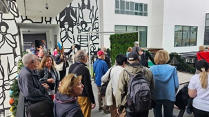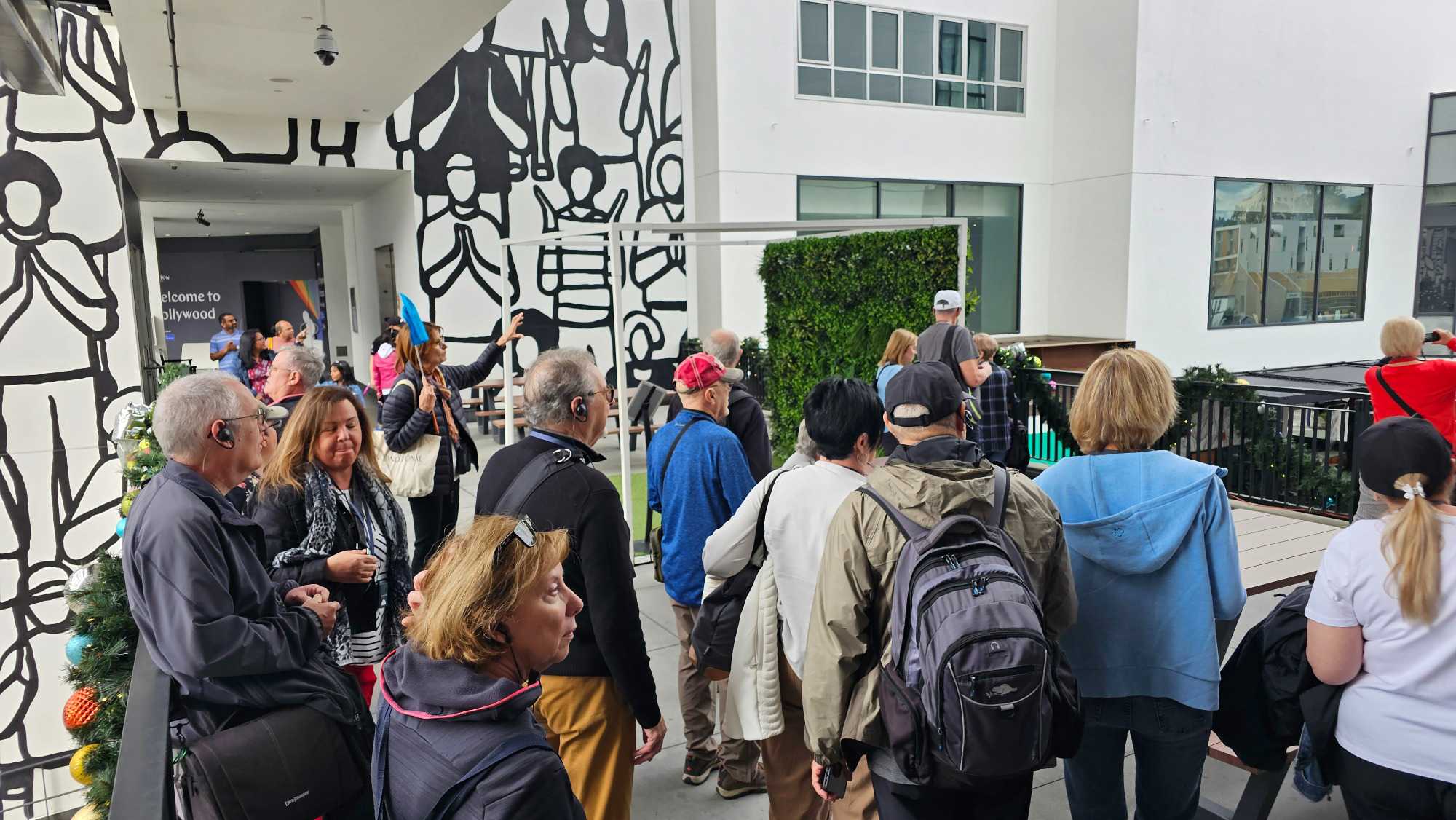 Vers 10h30, nous avons rencontré notre guide, Élisabeth. Puis nous avons quitté l'hôtel LOEWS à pied en direction du Highland Center pour admirer la fameuse enseigne, installée en 1923, qui affichait à l'origine "Hollywoodland" pour une campagne immobilière. Le "Land" fut retiré en 1949, et l'enseigne est désormais un monument culturel protégé. Il est important de noter que Hollywood n'est pas une ville indépendante, mais un quartier de la ville de Los Angeles, avec une population estimée à environ 159 000 habitants.