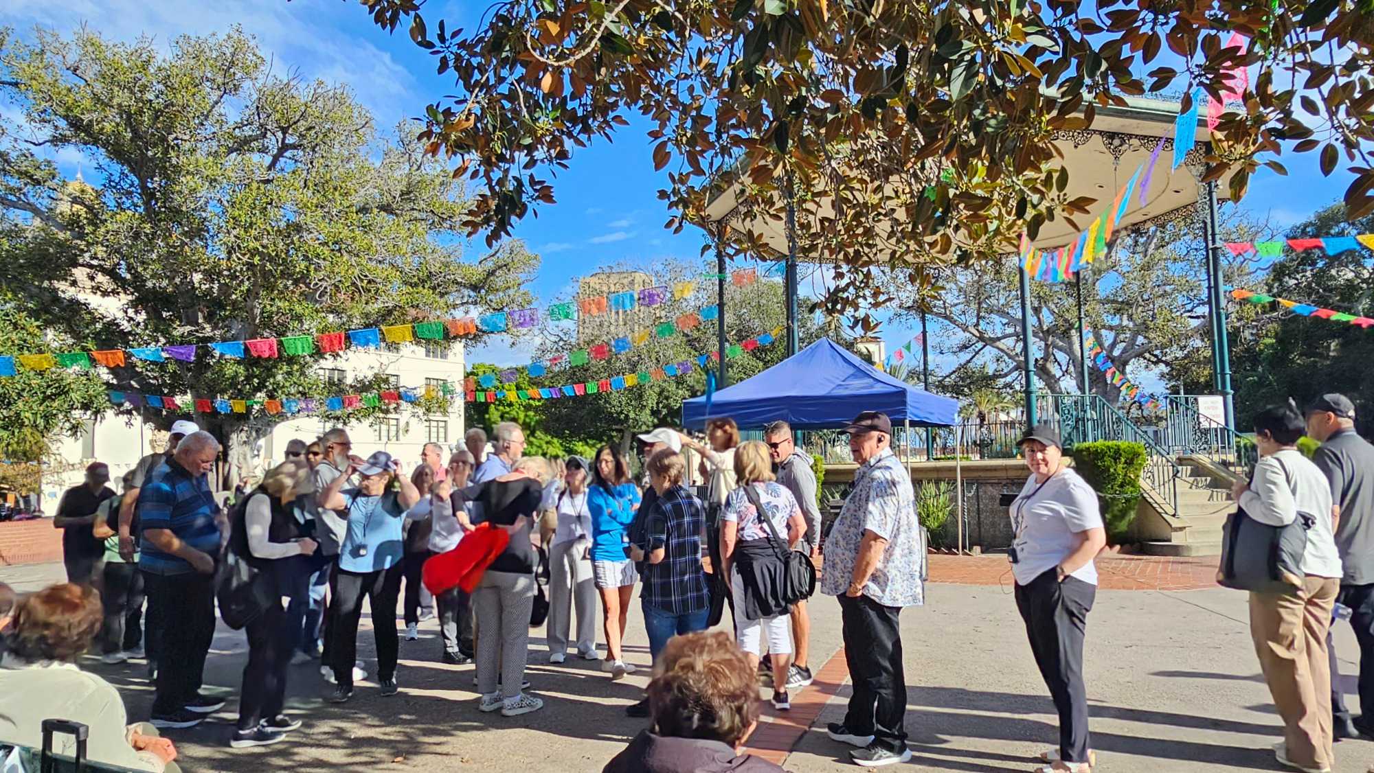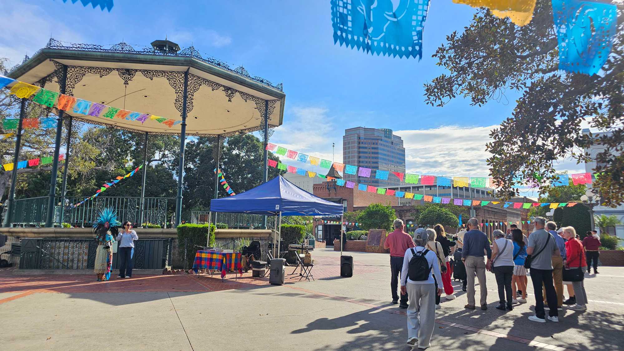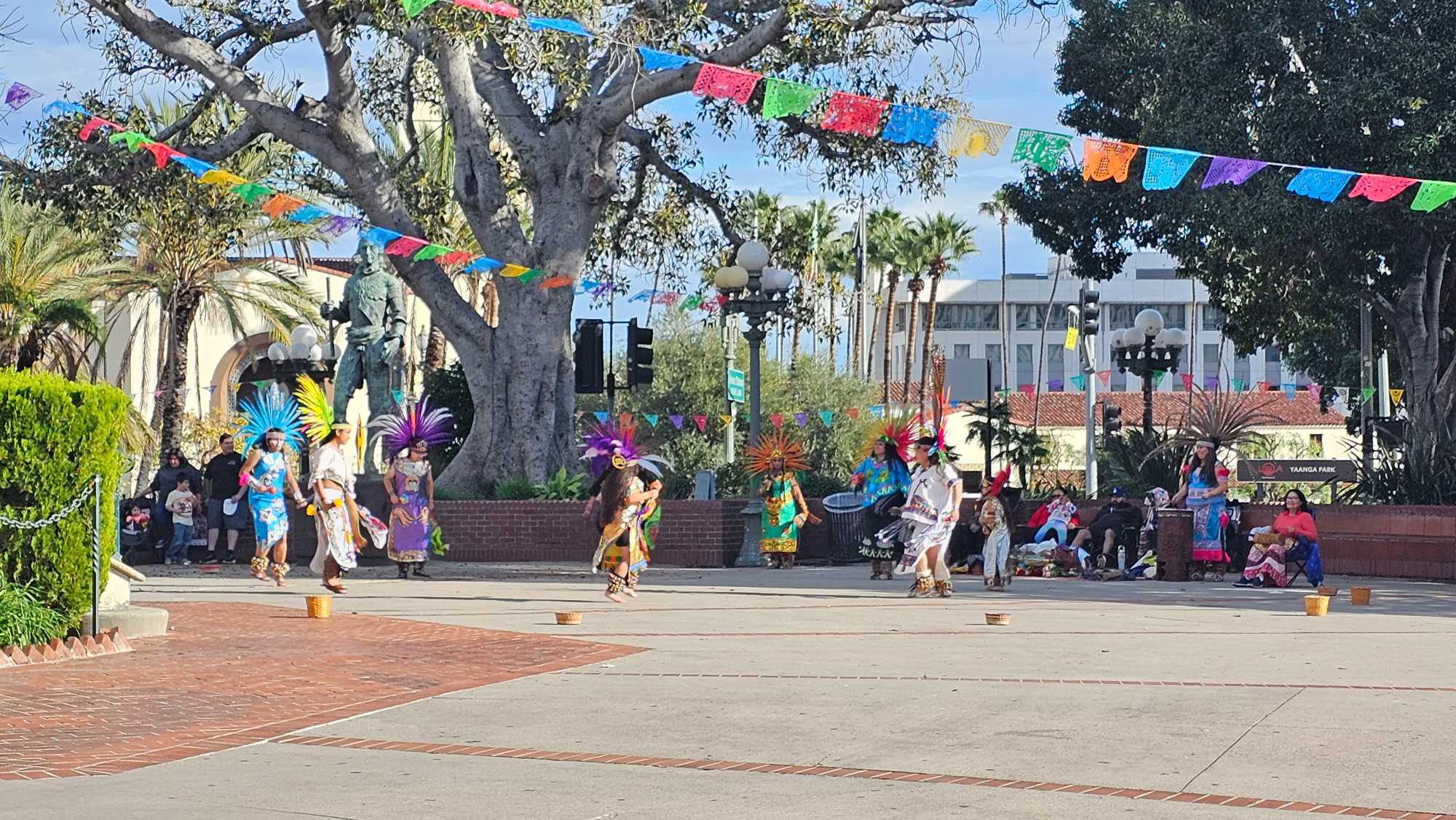 Élisabeth nous a expliqué l'histoire de la ville, fondée en 1781 en tant que pueblo (village en espagnol) par 12 familles, un territoire initialement sous appartenance mexicaine. C'est un lieu de rassemblement important pour les populations d'origine mexicaine et indigène. Nous avons eu la chance d'apprécier des danses traditionnelles et des couples qui dansaient sur la place, un spectacle vraiment sympathique. Sur la place, on y voie un monument commémore le nom des 44 fondateurs (adultes et enfants). Ce parc est tres vivant à l’année.