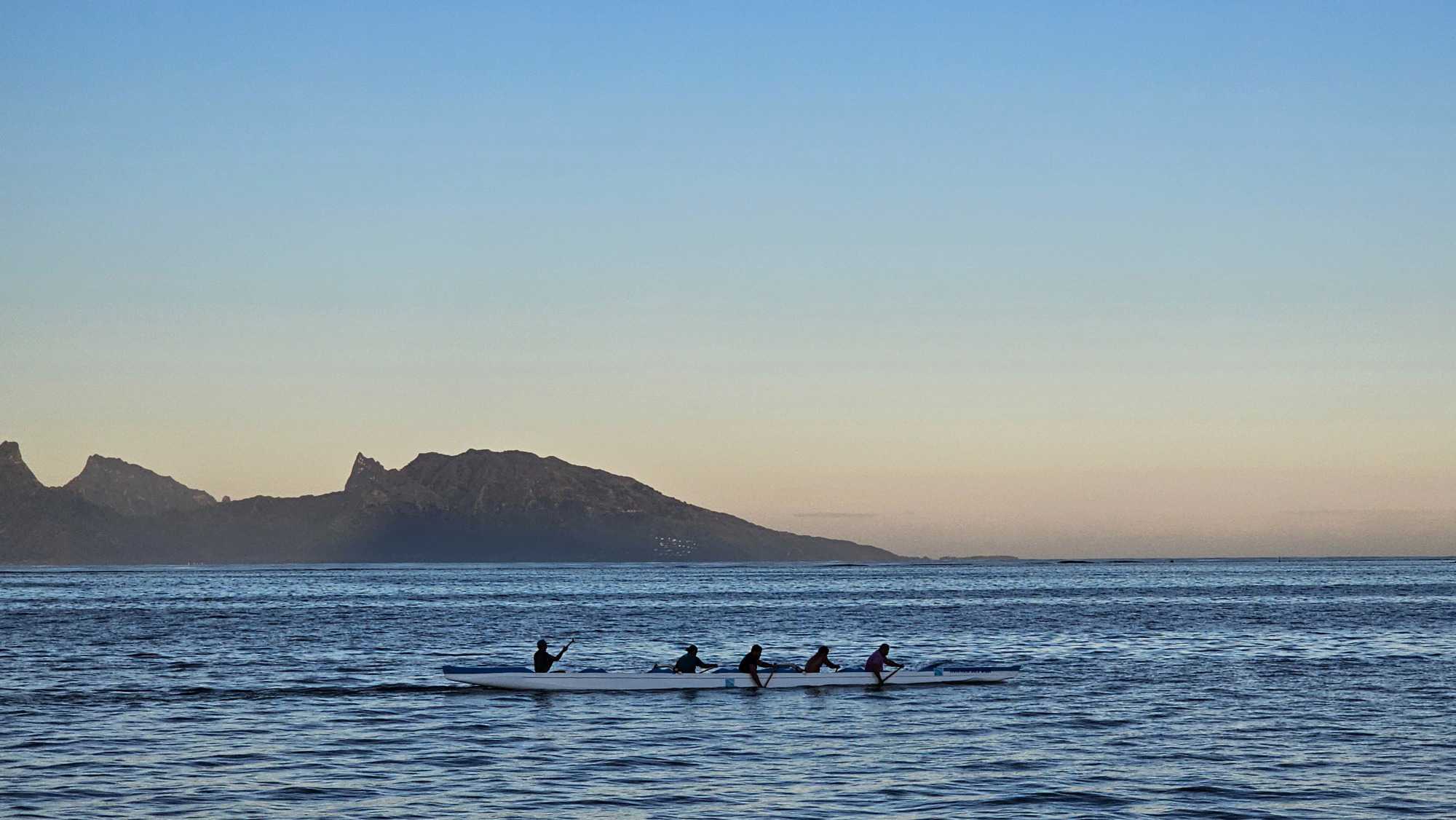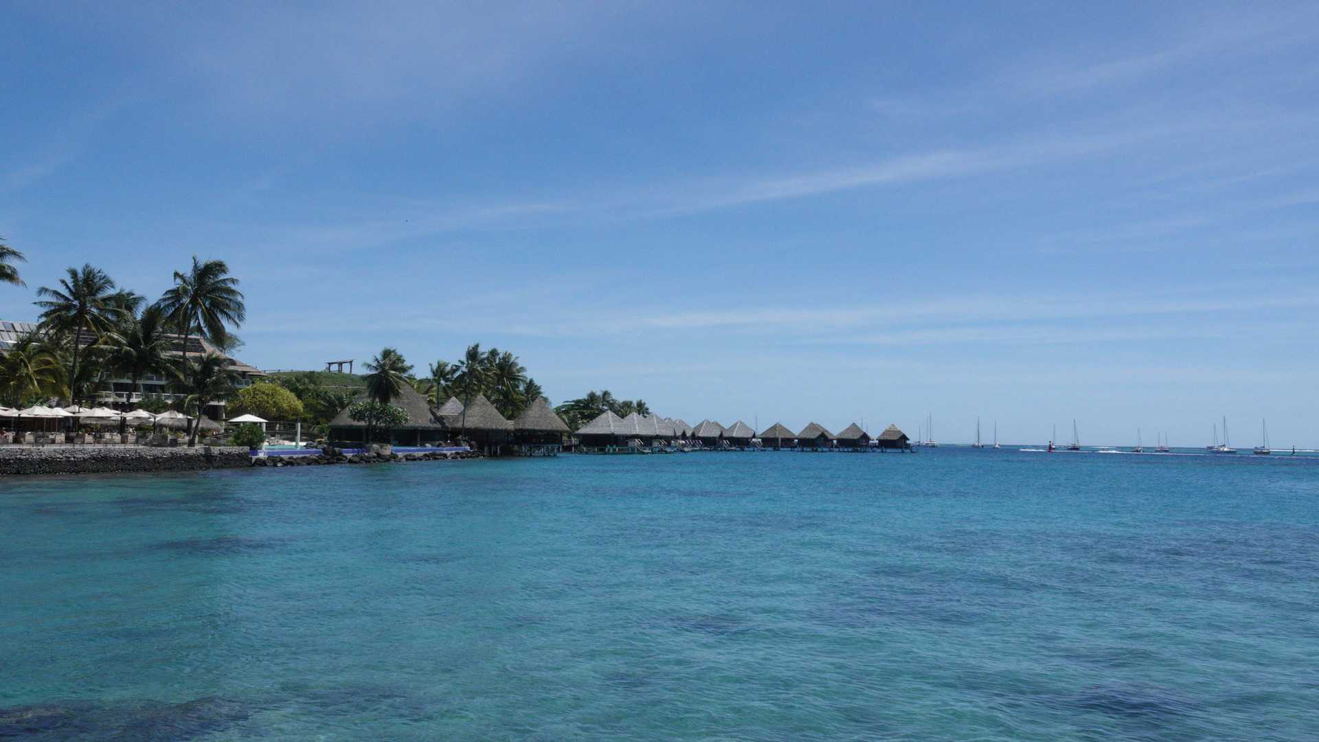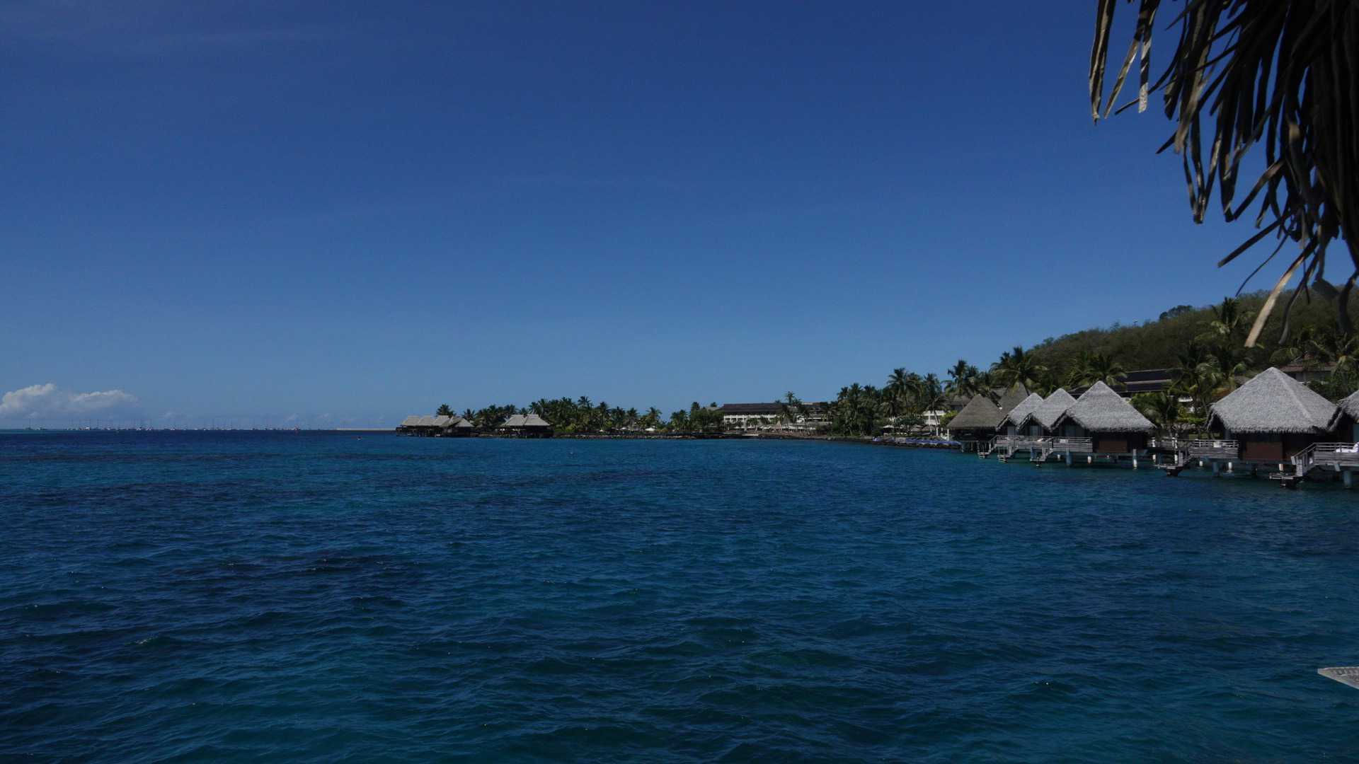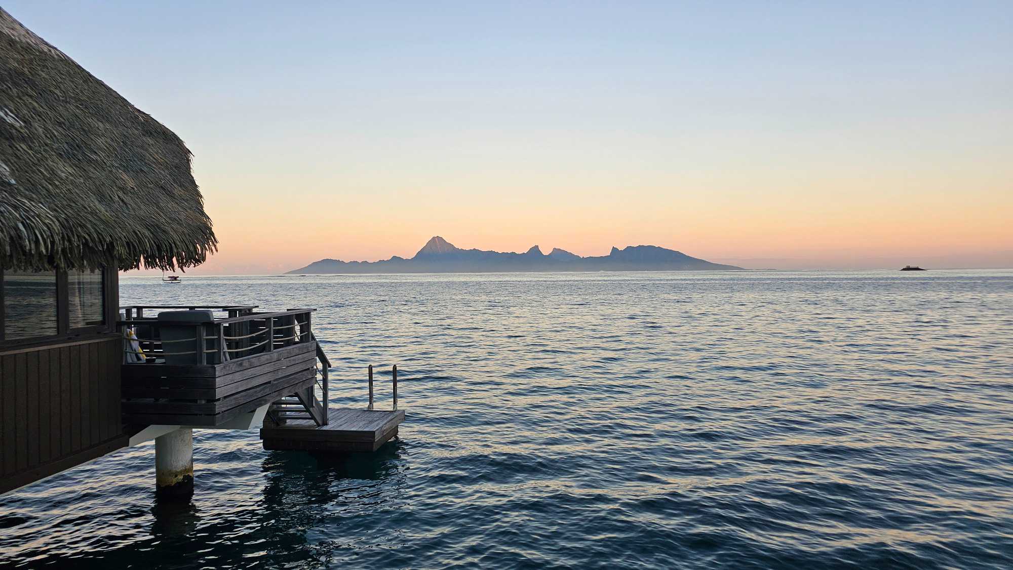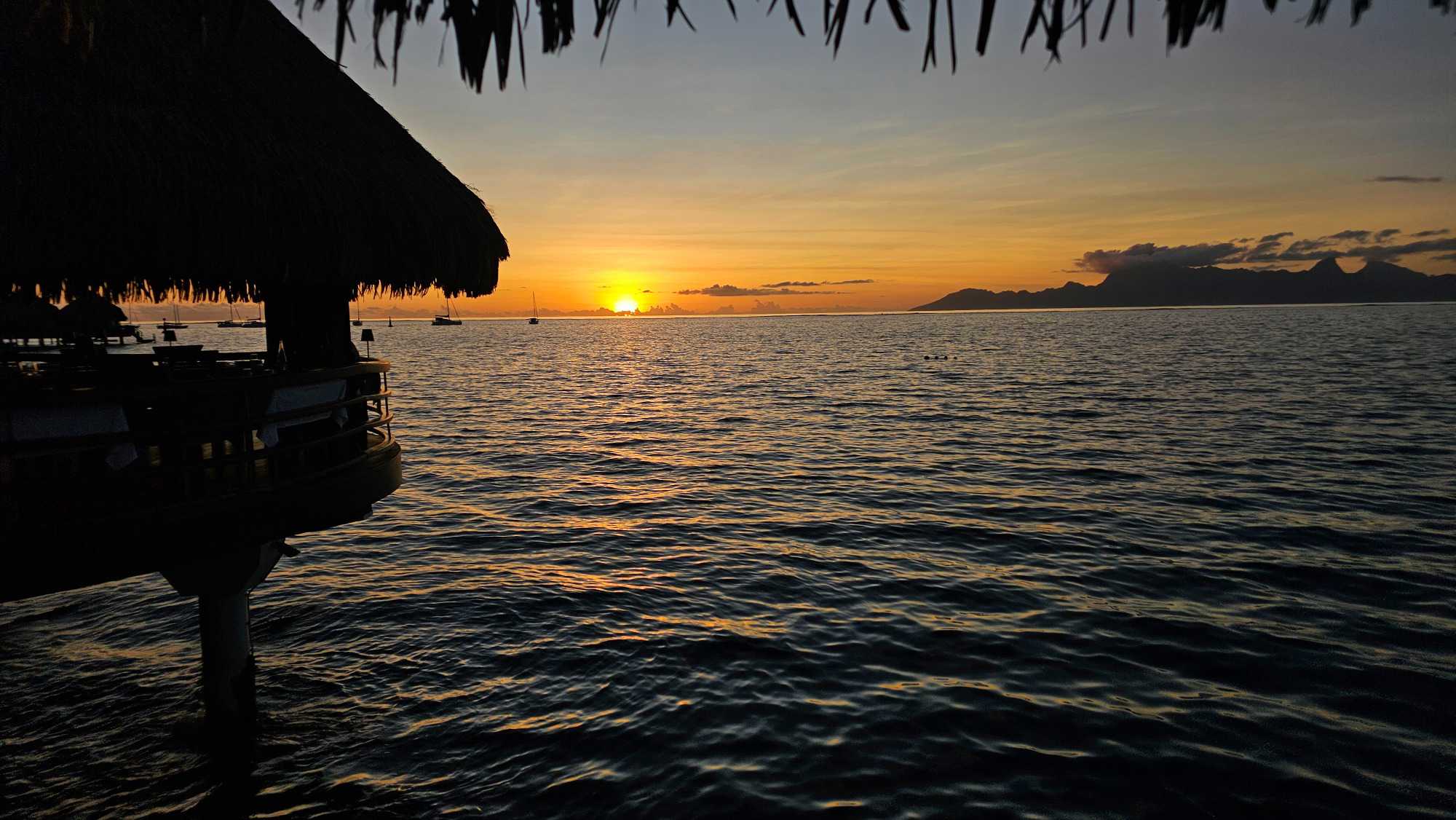 Quel beau matin calme. Le ciel est dégagé, les lève tôt peuvent observer Moorea se faire dorer graduellement par le soleil. On voie déjà les vaa qui profitent de cette belle aurore. L’absence de vent nous permet d’apprécier le clapotis de l’eau sur les pilotis et même on entent la mer se briser sur les récifs au large qui nous permet d’avoir cette mer paradisiaque pour se baigner.