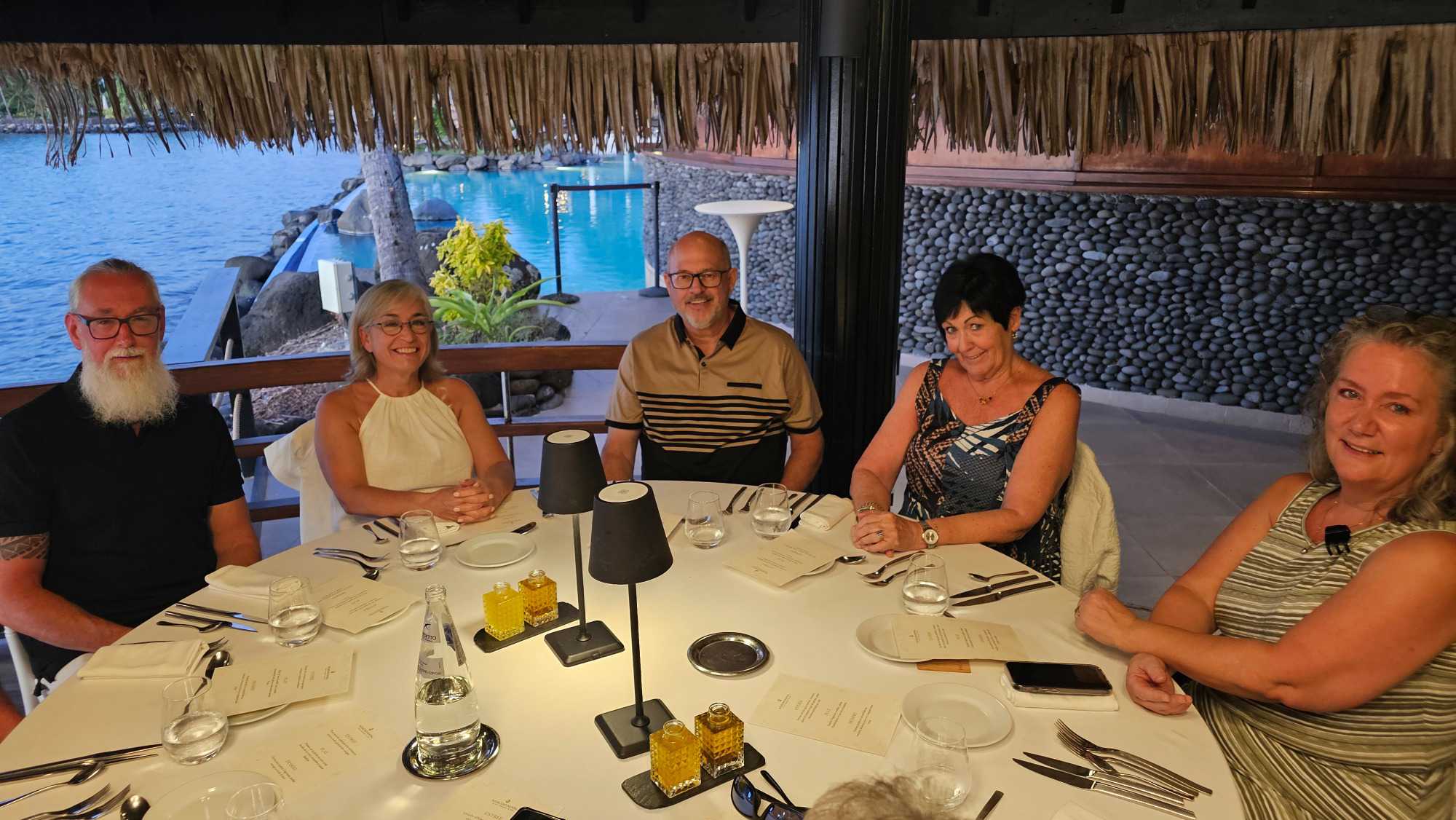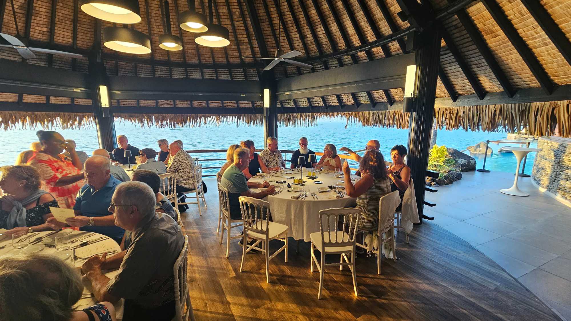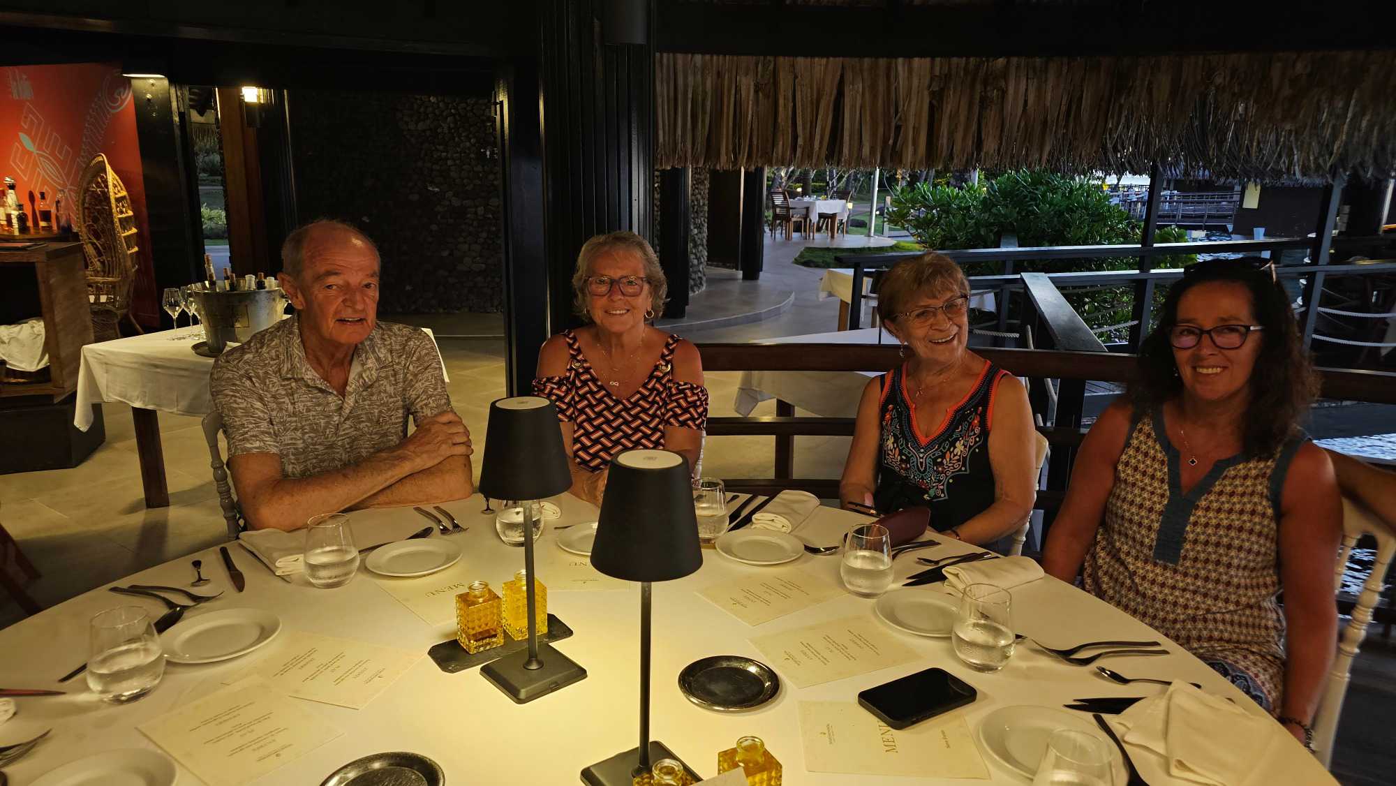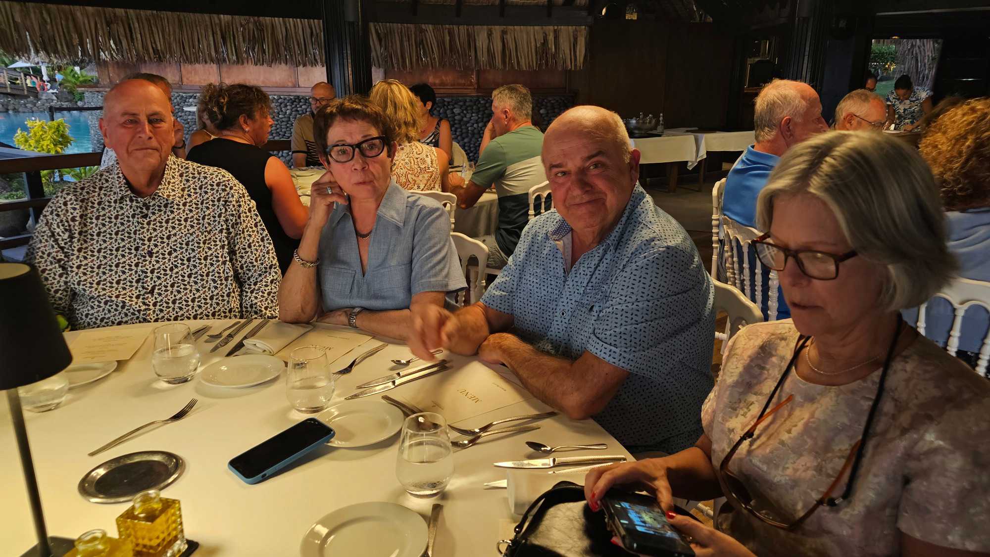 Finalement on aura eu une superbe journée ensoleillée juste assez chaude. Je crois que personne n’a été se promener aujourd’hui. On profite de la mer, nos balcons privé, le lagon ou on peut nager à travers les poissons curieux. Le buffet déjeuner au Te Tiare comme hier est à la hauteur. C’est une journée libre mais on se rencontre ce soir pour souper ensemble au coucher de soleil au resto gastronomique Le Lotus. Belle petite attention, on avait chacun notre petit menu déjà sélectionné la veille, ca fait chic. Nos tables sont sur le bord de mer face a l ouest donc on jase au coucher de soleil, c’est magique. Le repas est succulent. Belle façon de terminer une journée que je qualifierais de parfaite.