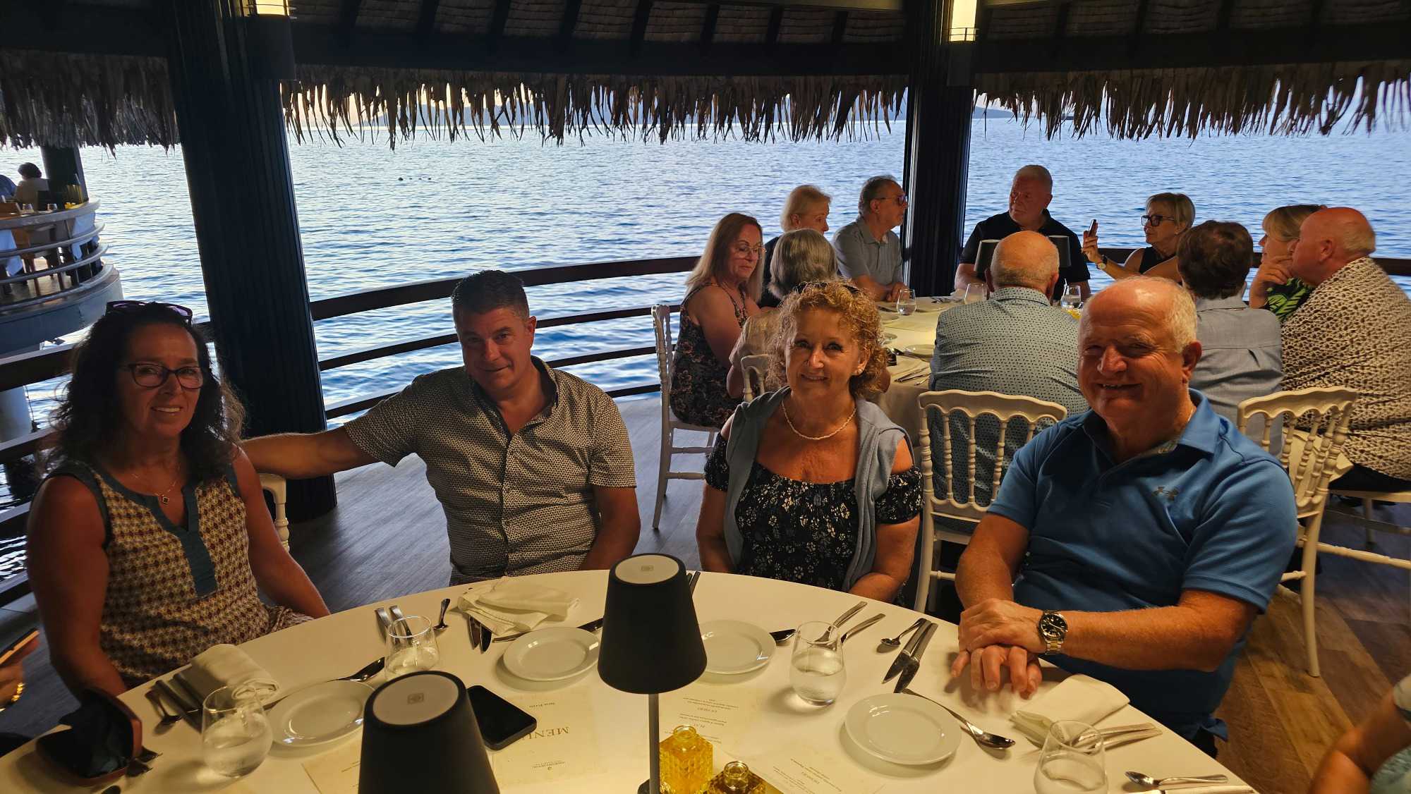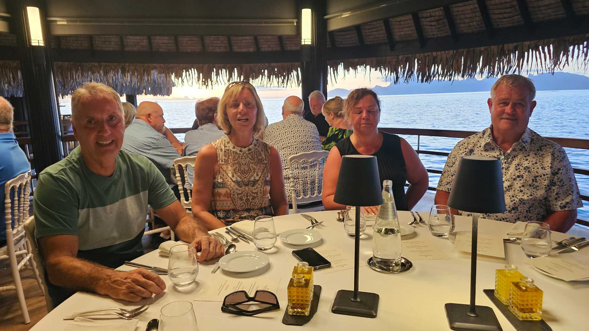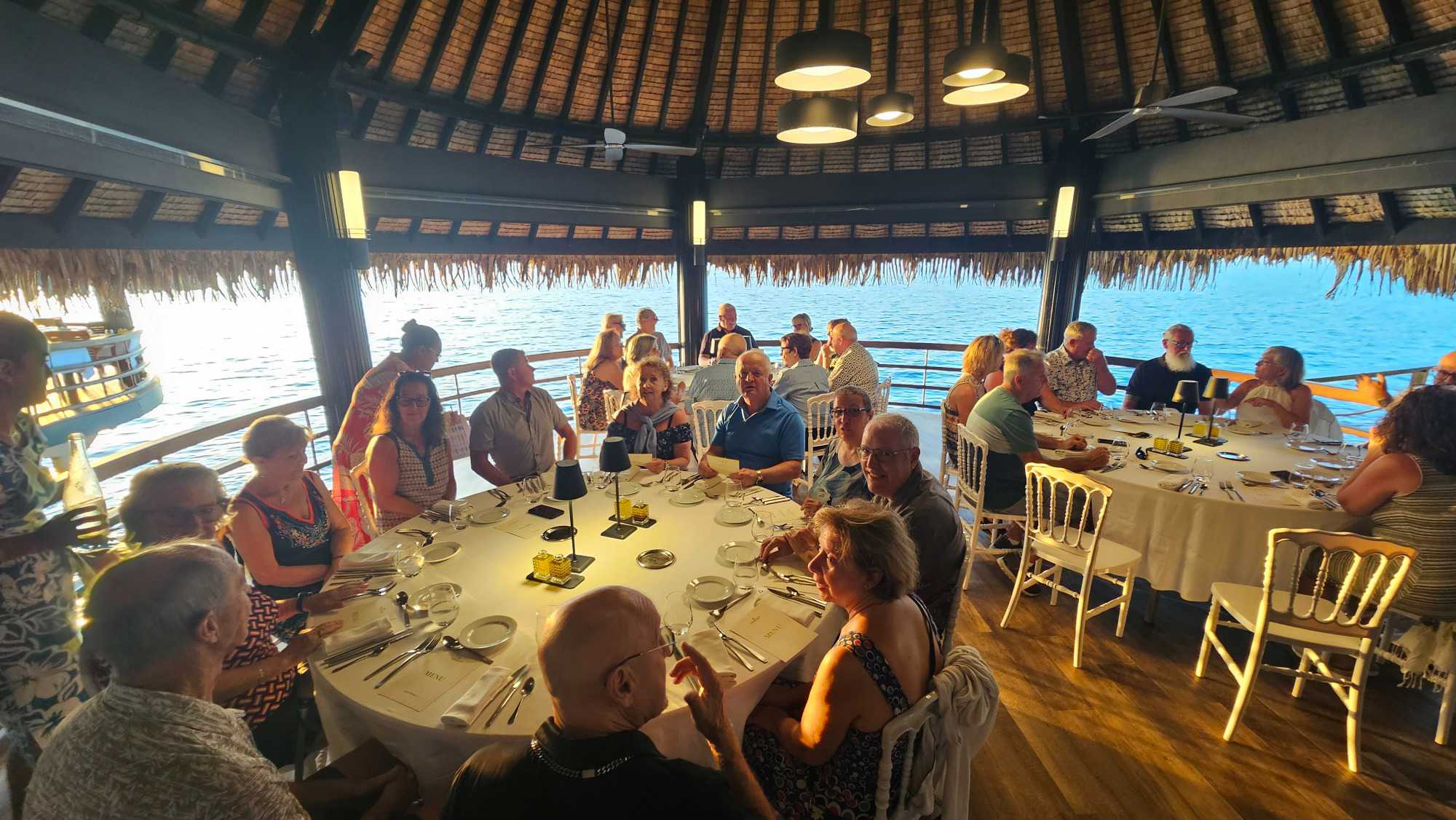 Finalement on aura eu une superbe journée ensoleillée juste assez chaude. Je crois que personne n’a été se promener aujourd’hui. On profite de la mer, nos balcons privé, le lagon ou on peut nager à travers les poissons curieux. Le buffet déjeuner au Te Tiare comme hier est à la hauteur. C’est une journée libre mais on se rencontre ce soir pour souper ensemble au coucher de soleil au resto gastronomique Le Lotus. Belle petite attention, on avait chacun notre petit menu déjà sélectionné la veille, ca fait chic. Nos tables sont sur le bord de mer face a l ouest donc on jase au coucher de soleil, c’est magique. Le repas est succulent. Belle façon de terminer une journée que je qualifierais de parfaite.