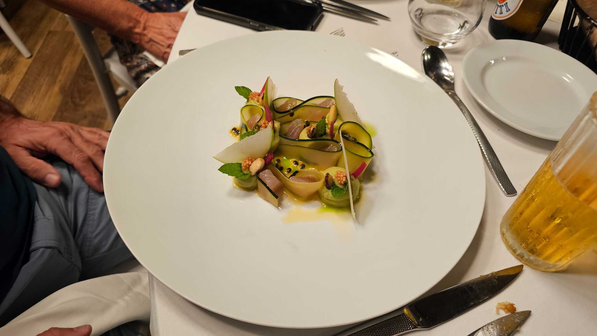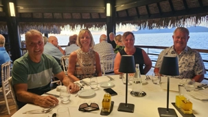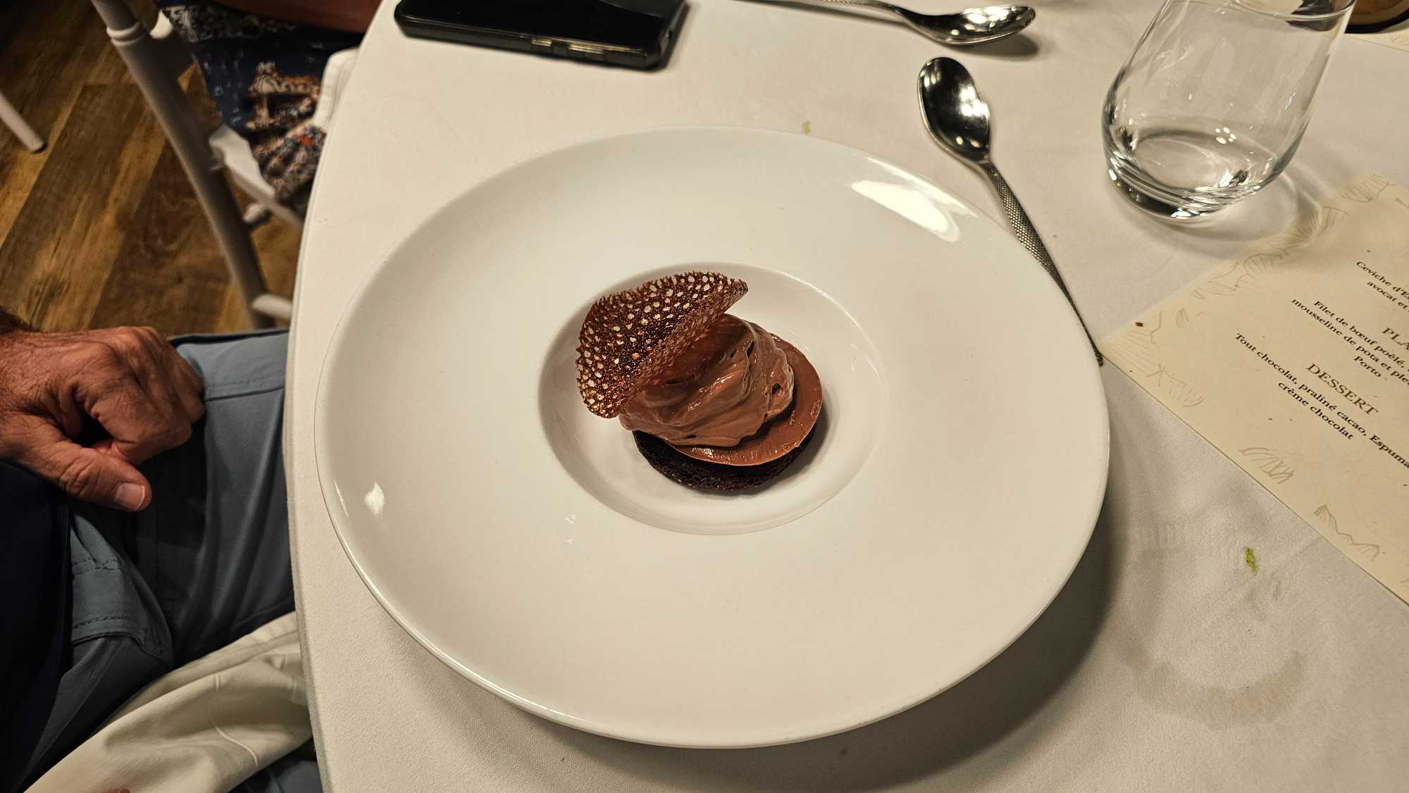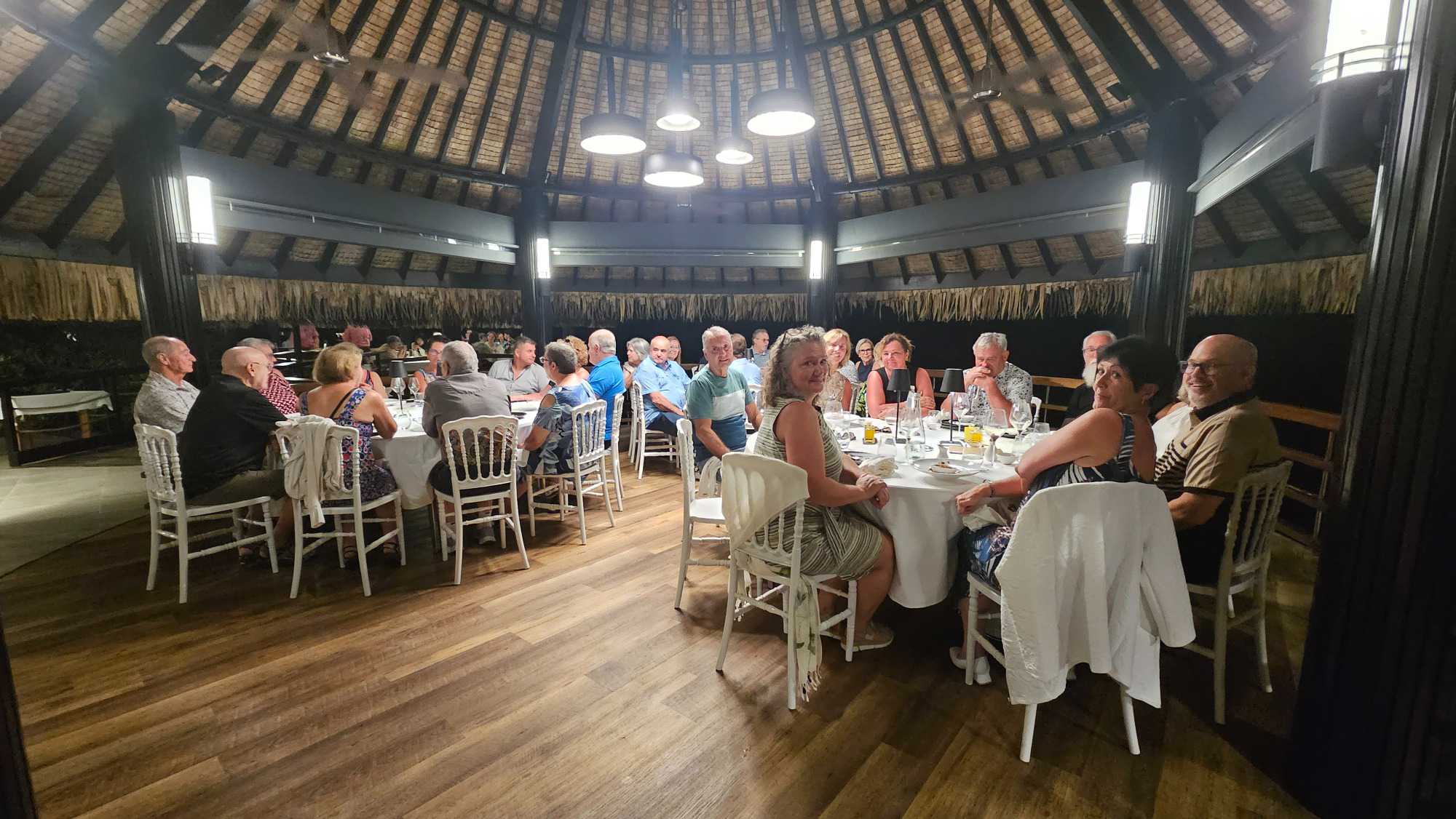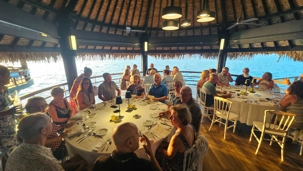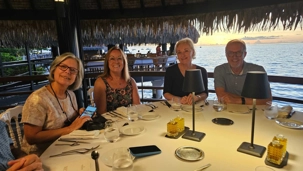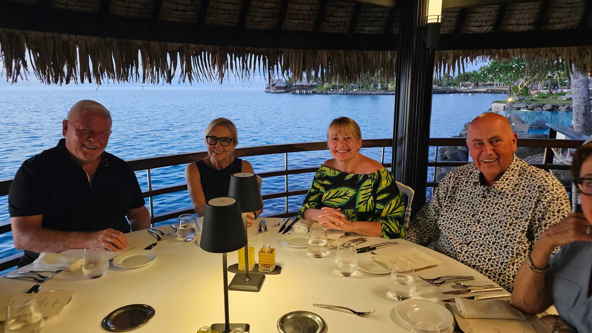 Finalement on aura eu une superbe journée ensoleillée juste assez chaude. Je crois que personne n’a été se promener aujourd’hui. On profite de la mer, nos balcons privé, le lagon ou on peut nager à travers les poissons curieux. Le buffet déjeuner au Te Tiare comme hier est à la hauteur. C’est une journée libre mais on se rencontre ce soir pour souper ensemble au coucher de soleil au resto gastronomique Le Lotus. Belle petite attention, on avait chacun notre petit menu déjà sélectionné la veille, ca fait chic. Nos tables sont sur le bord de mer face a l ouest donc on jase au coucher de soleil, c’est magique. Le repas est succulent. Belle façon de terminer une journée que je qualifierais de parfaite.