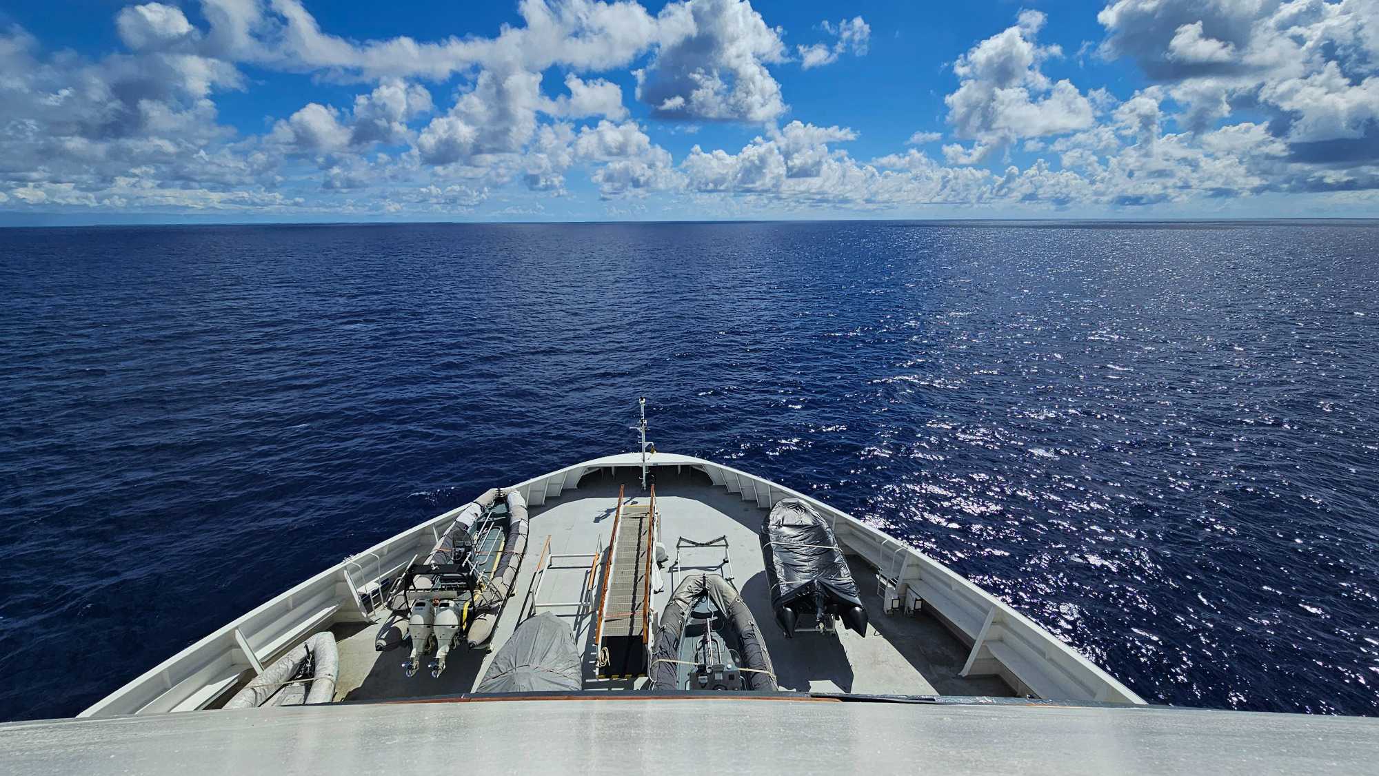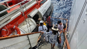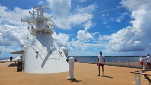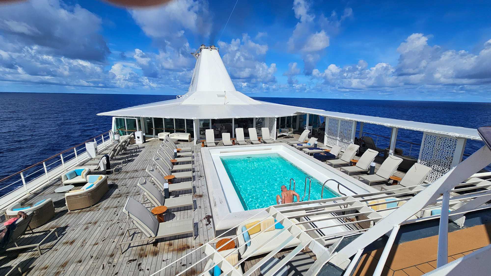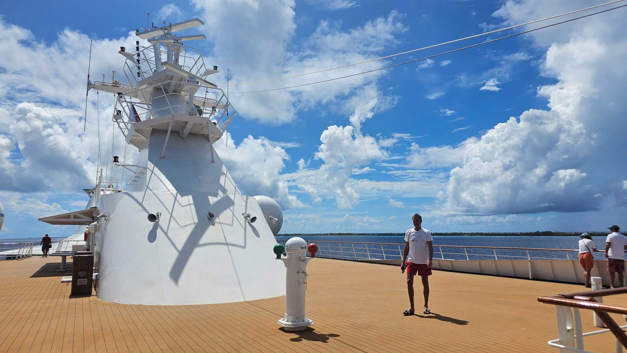La nuit passée a été des plus tranquilles, et j'ai personnellement choisi de laisser la fenêtre de ma porte patio ouverte pour m'endormir au doux bruit des vagues traversant l'océan. Au réveil, la mer était calme, les vagues semblaient minimes, mais on est quand même sur un gros navire, si bien que l'on sentait à peine le tangage. Ce fut véritablement une journée de navigation confortable. Sur les ponts, le vent était peu perceptible, mais nous ressentons tous l'intensité du soleil sur les ponts supérieurs. après quelques instants au soleil, certains cherchent l’ombre….