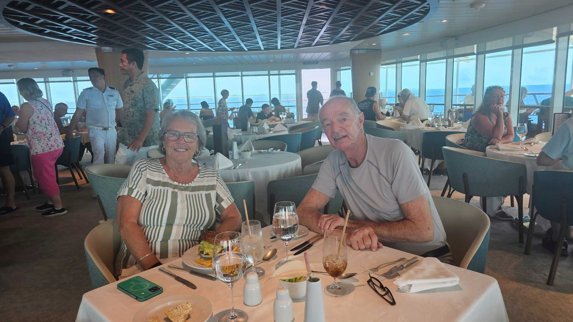 Cette matinée nous a permis de commencer à découvrir la restauration du navire, avec le petit-déjeuner. Au Gril,l au pont supérieur, c' est le beau buffet avec certaines options à la carte. En matinée nous avons pu nous familiariser avec les aires du navire, débogguer notre Wifi, ajuster nos excursions, profiter des conférences offertes et des activités offertes pas « les Gauguines », ces dames polynésiennes chargées des activités sur le navire. Il y avait peu d'adeptes pour aller à la classe de danse polynésienne semble-t-il…