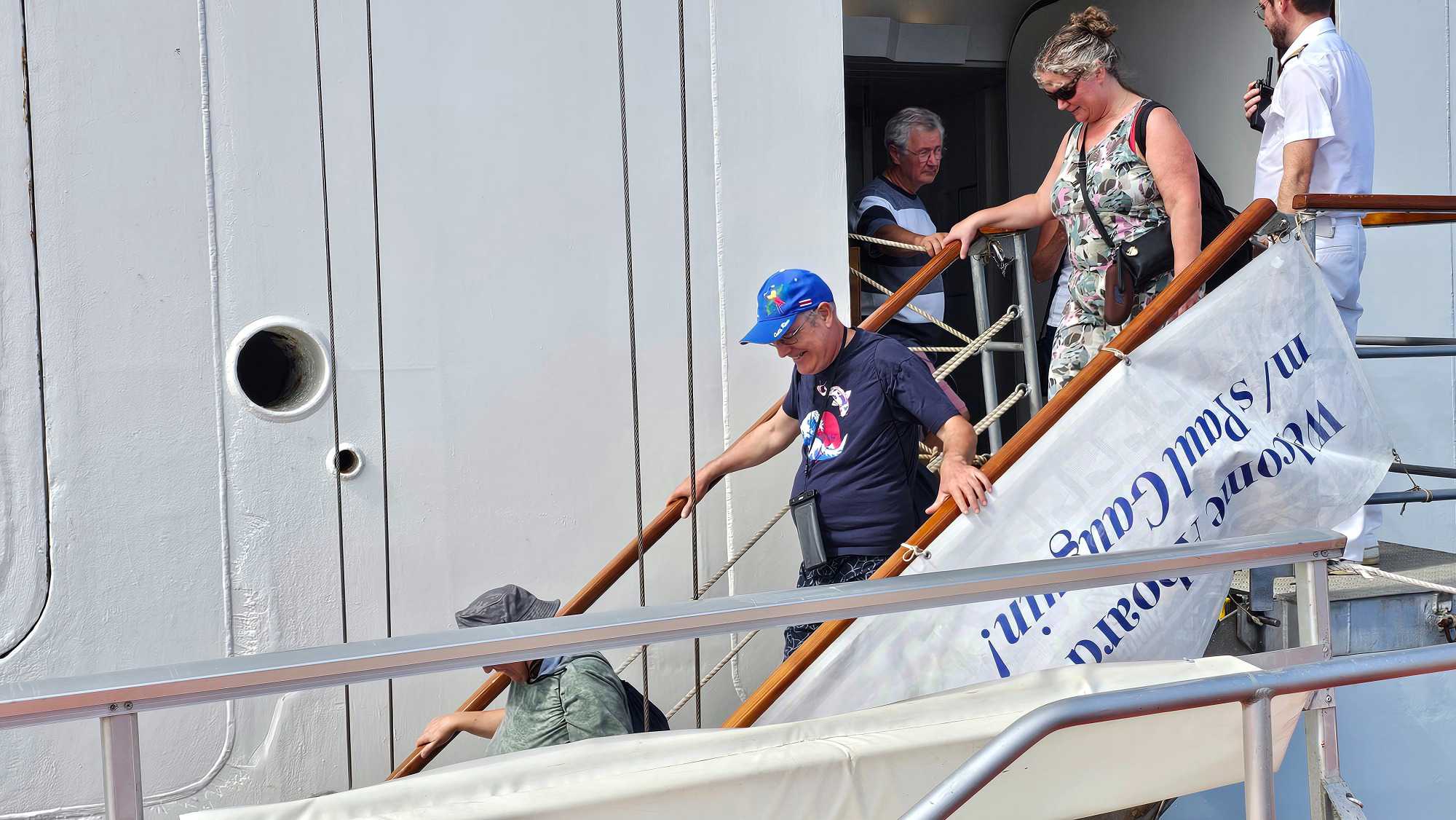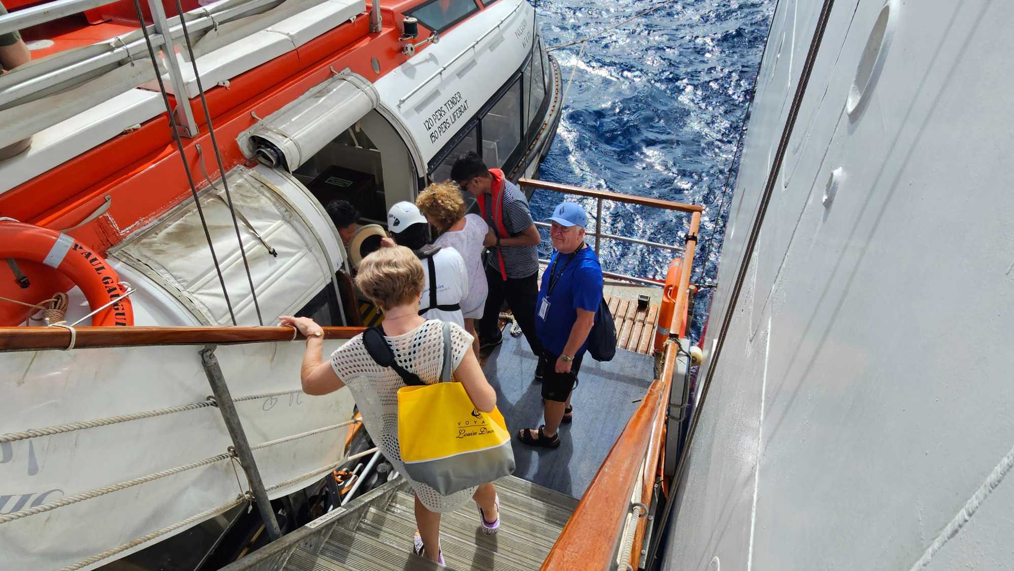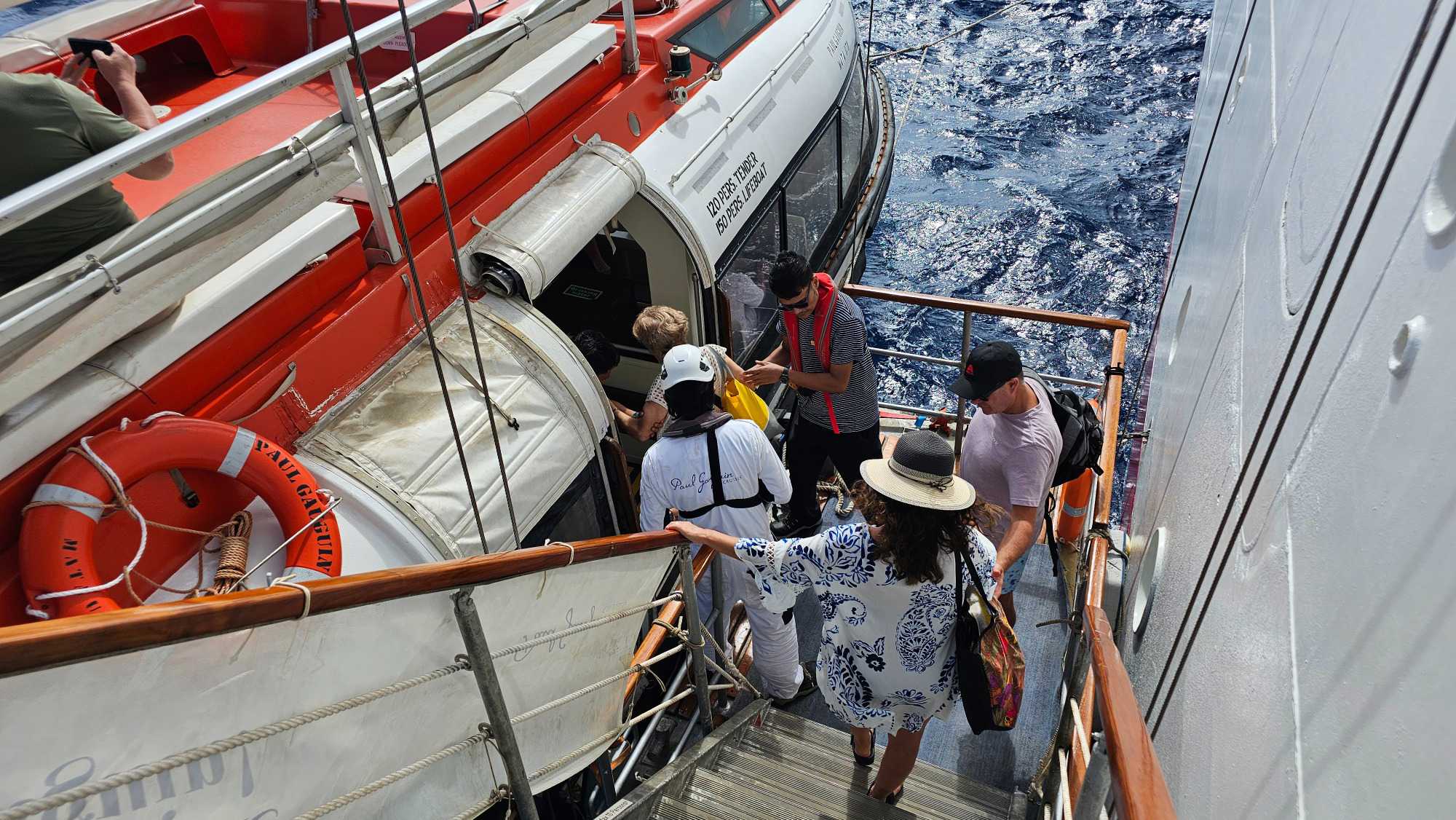 Vers 14h30, nous avons pu utiliser les petites navettes pour descendre à terre, bien que certains amis aient choisi de se prélasser sur le navire. En partant du quai, nous nous sommes rendu compte qu'il ventait en réalité un peu plus fort que la perception que nous avions à bord, où nous devions avoir un vent de dos. Dès que nous avons embarqué dans la navette, nous nous sommes fait pas mal brasser, et le capitaine a même dû changer d'endroit pour accoster, car la navette subissait fortement les soubresauts des vagues et du vent. Il faut dire que les navettes. (Tender et pas Tinder :) ne sont pas très « aérodynamiques »!