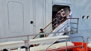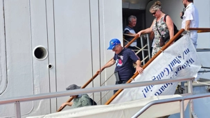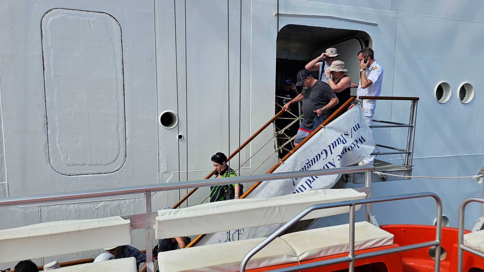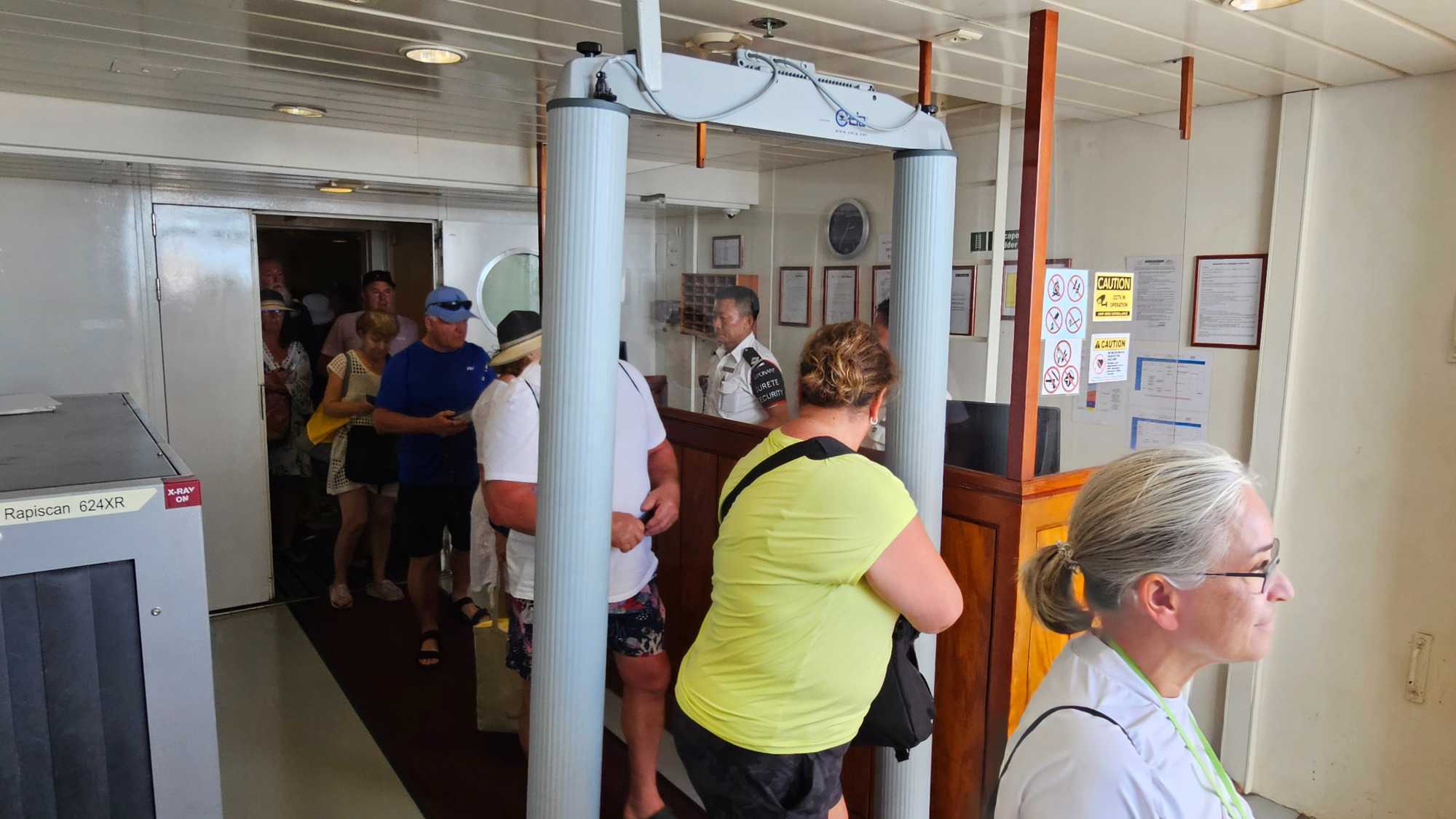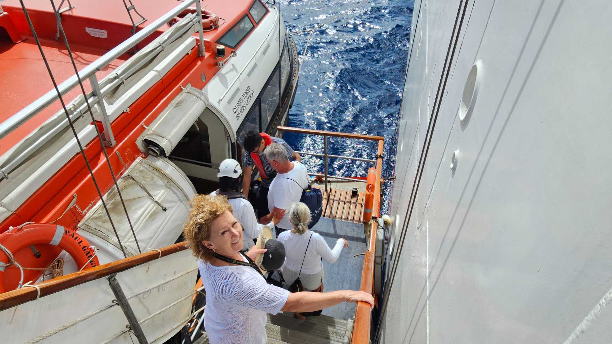 Vers 14h30, nous avons pu utiliser les petites navettes pour descendre à terre, bien que certains amis aient choisi de se prélasser sur le navire. En partant du quai, nous nous sommes rendu compte qu'il ventait en réalité un peu plus fort que la perception que nous avions à bord, où nous devions avoir un vent de dos. Dès que nous avons embarqué dans la navette, nous nous sommes fait pas mal brasser, et le capitaine a même dû changer d'endroit pour accoster, car la navette subissait fortement les soubresauts des vagues et du vent. Il faut dire que les navettes. (Tender et pas Tinder :) ne sont pas très « aérodynamiques »!