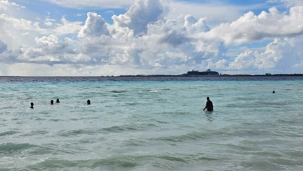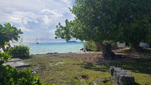 Finalement nous avons abdiqué et avons choisi de nous baigner là où nous étions, sur une belle petite plage, sauvage, pas très large entre la ligne des arbres et la mer. L'entrée dans l'eau fut une expérience particulière, car la température de l'eau était plus chaude que notre température corporelle, ce qui est vraiment impressionnant. On est quand même en mer…. Nous avons pu nous mouiller, même si ce n'était pas pour nous rafraîchir. Le snorkeling était totalement impossible car, avec le vent et la mer agitée, le bord était laiteux et la visibilité nulle.