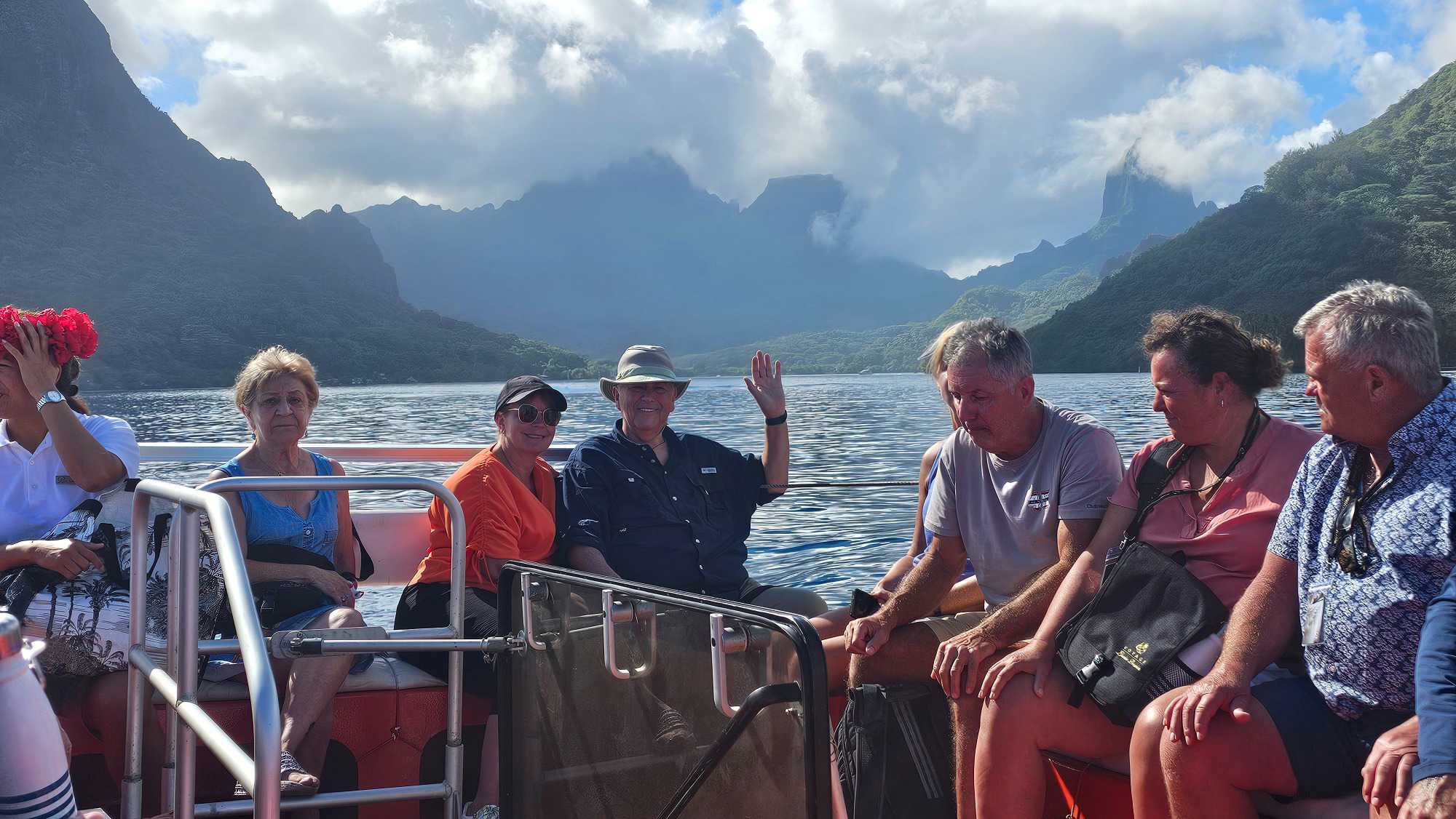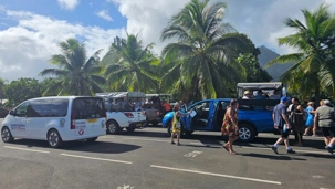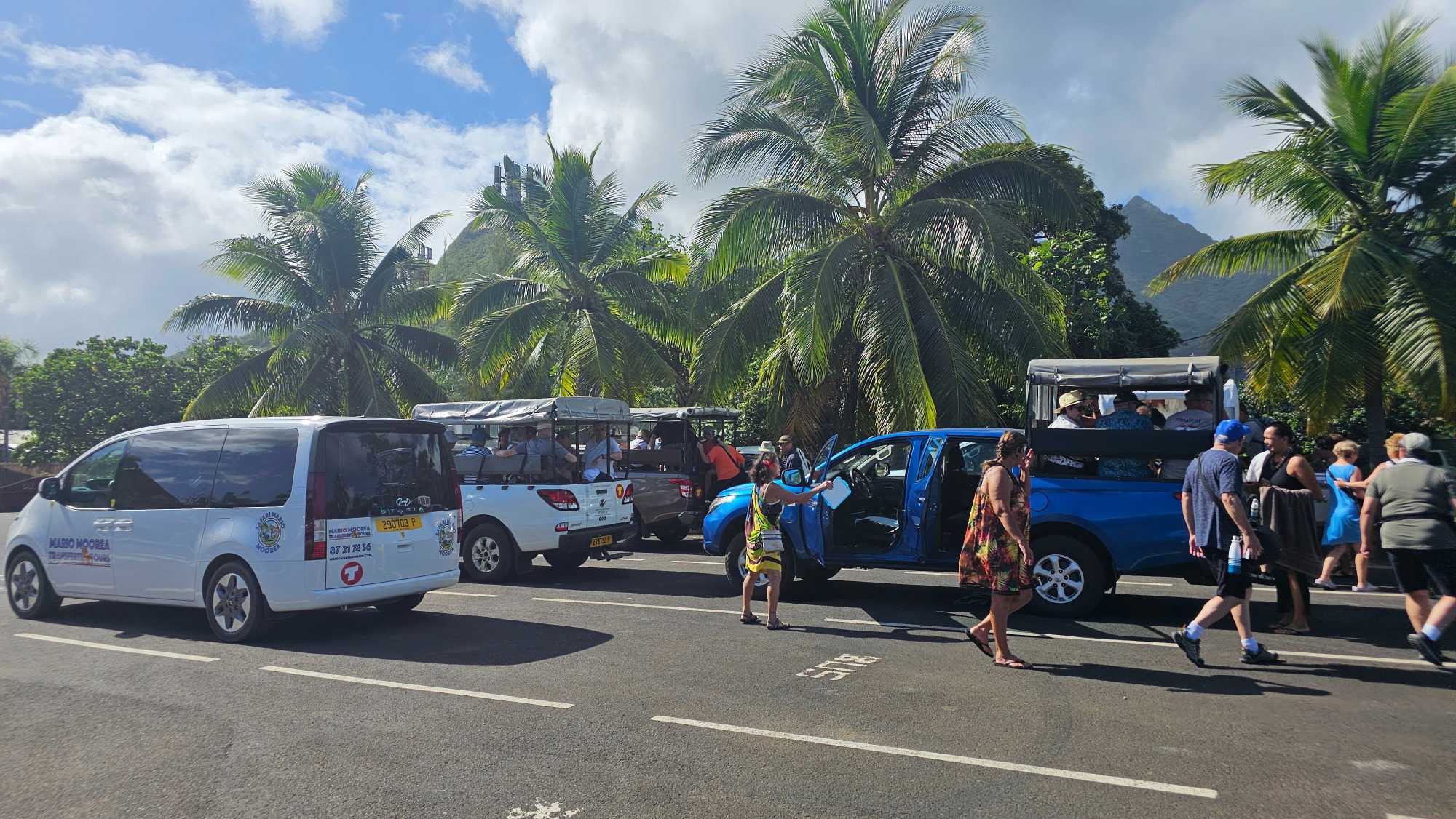 Nous avins 4 camions modifiés pour accueillir des passagers à l' arrière. Nous voilà en route pour découvrir Moorea.