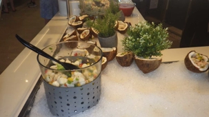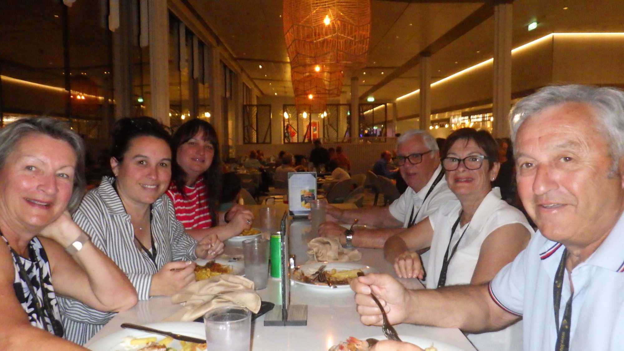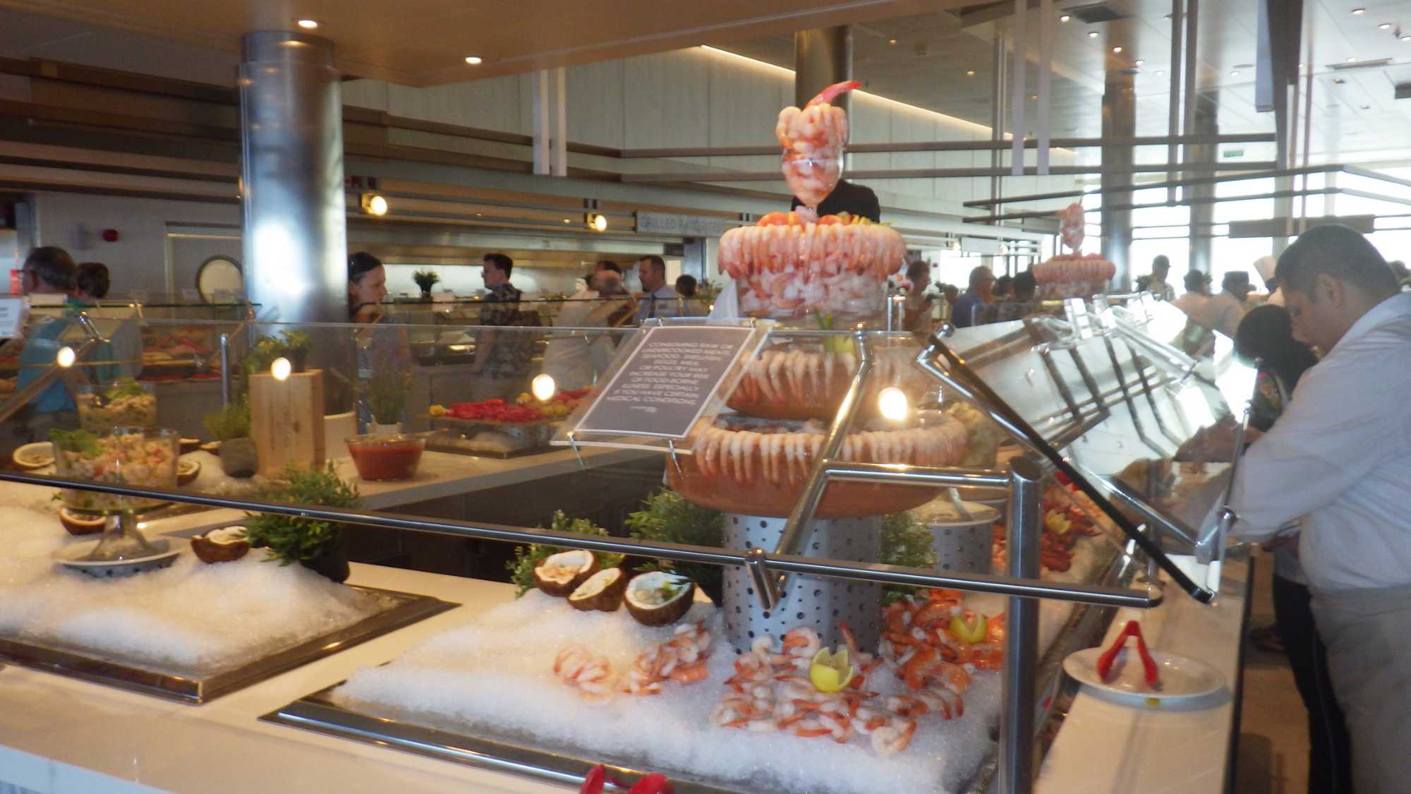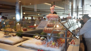 À midi pile, les voyageurs sont allés au buffet où il y avait des tables remplies de denrées plus alléchantes les unes que les autres. Vraiment les cuisines y avaient mis le paquet pour éblouir les passagers et réveiller nos papilles gustatives! Nous avons pu admirer et gouter des entrées toutes spéciales, joliment montées comme des petits chefs-d’œuvre. Puis, nous nous sommes attardés devant des plateaux de fruits de mer à profusion, déclinés sous forme d’huitres, crustacés, mollusques, calmars, scampis, homards, etc.! Mes voyageurs, tous plus futés les uns que les autres, se sont bien évidemment gardé de la place pour se régaler avec des desserts tous plus alléchants les uns que les autres, wow! wow! wow! Un régal!
