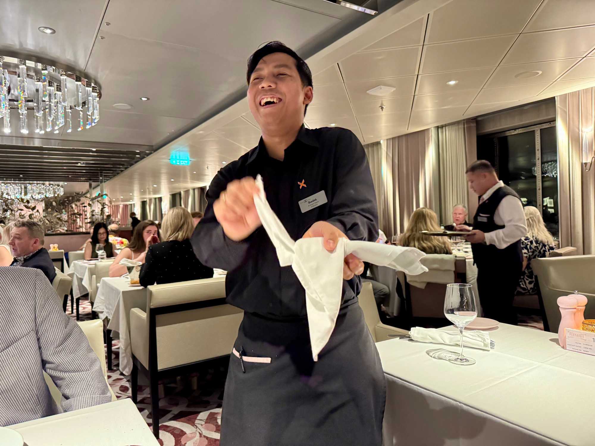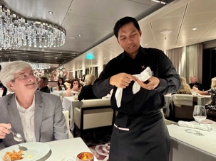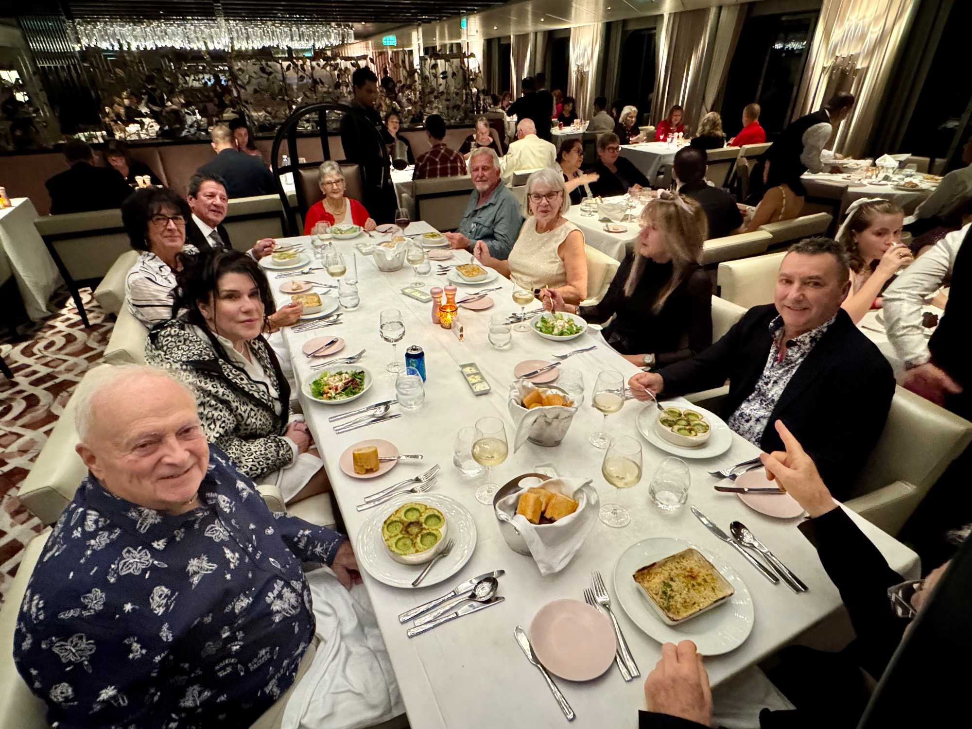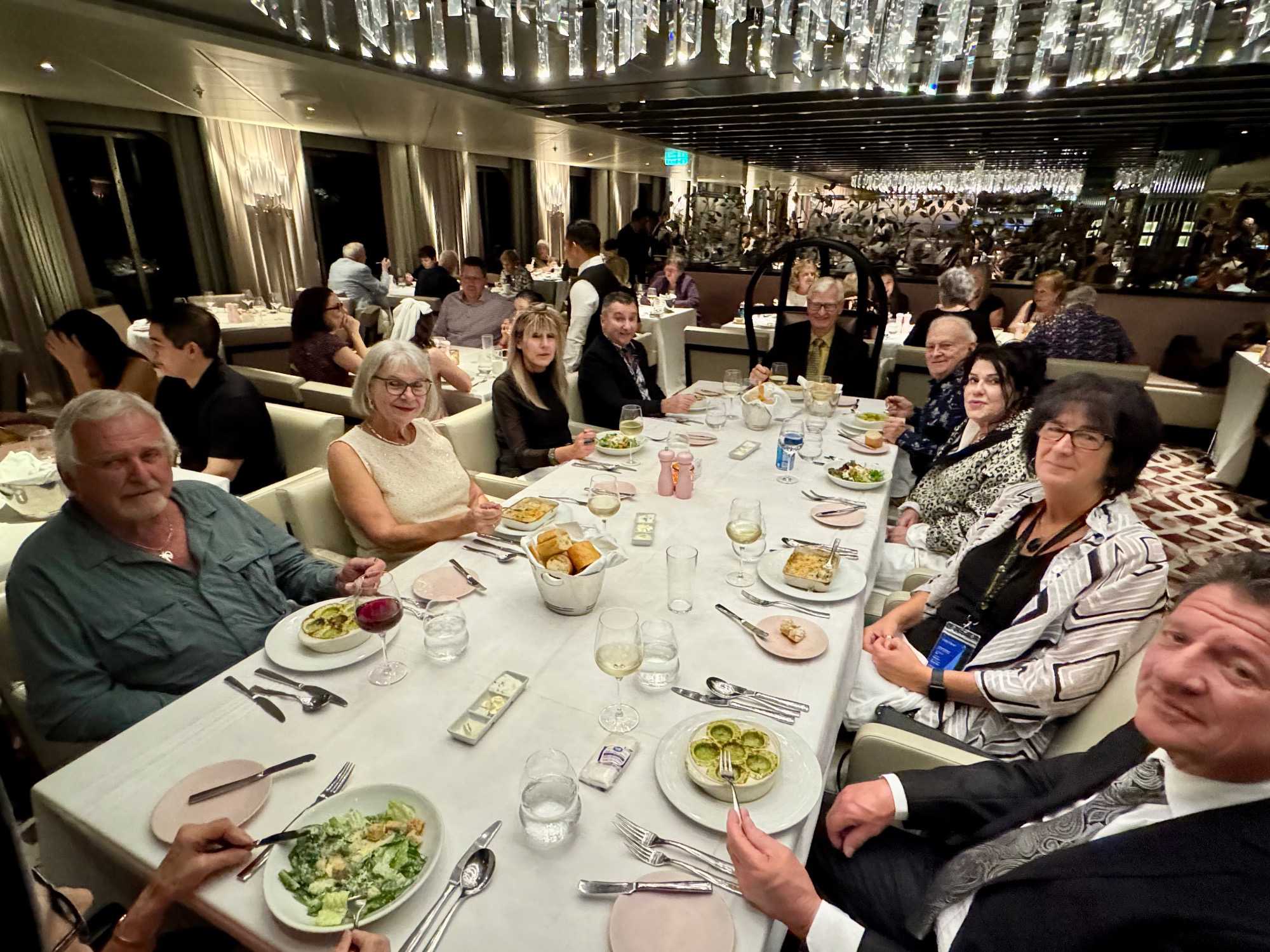 Pour le dîner, nous proposons à ceux qui le désirent un repas collectif à la salle à manger Cosmopolitan, offrant un menu à la carte délicieux. Les conversations vont bon train et de nouvelles amitiés se tissent déjà entre les voyageurs, même après seulement quelques jours ensemble.