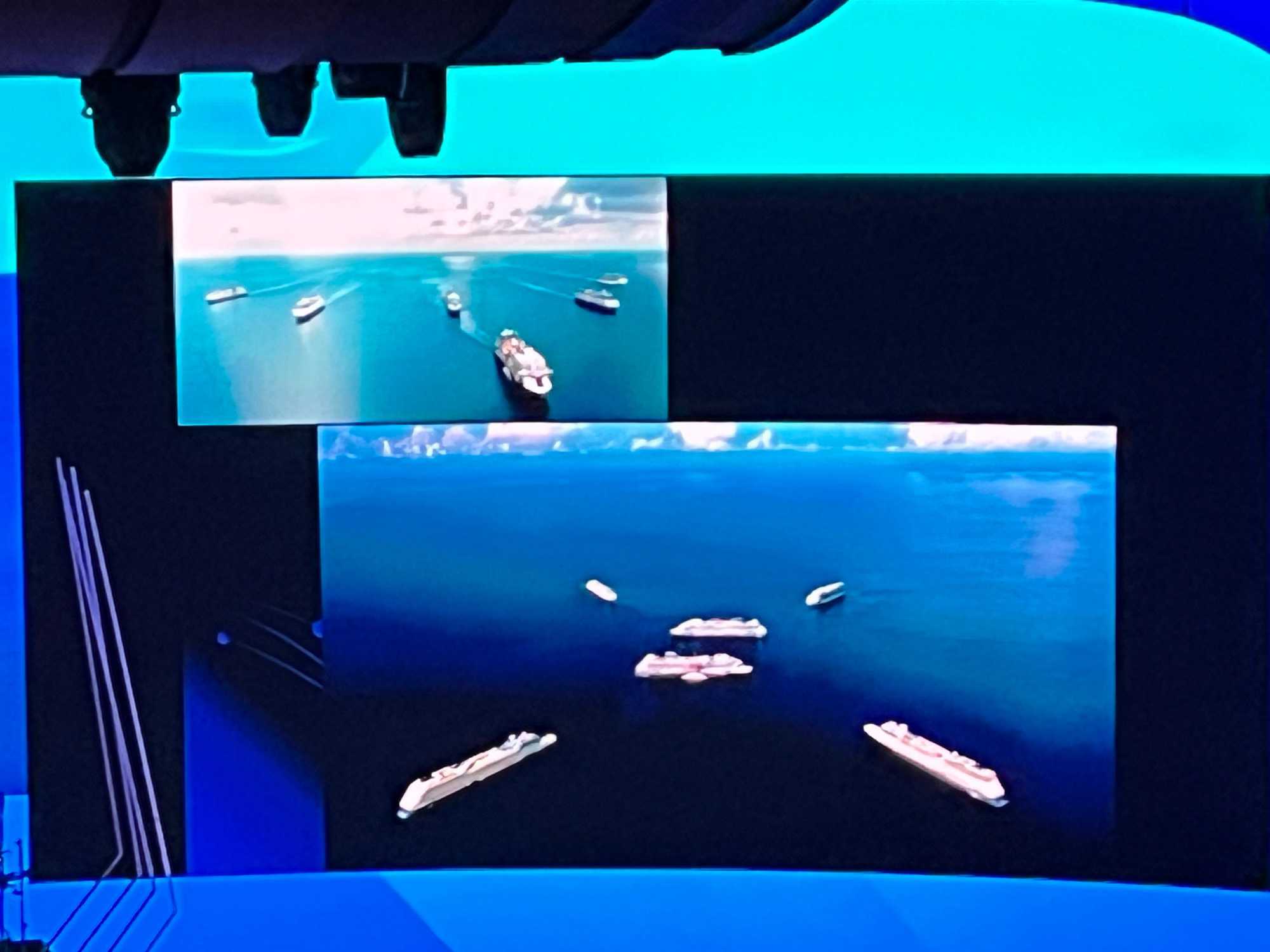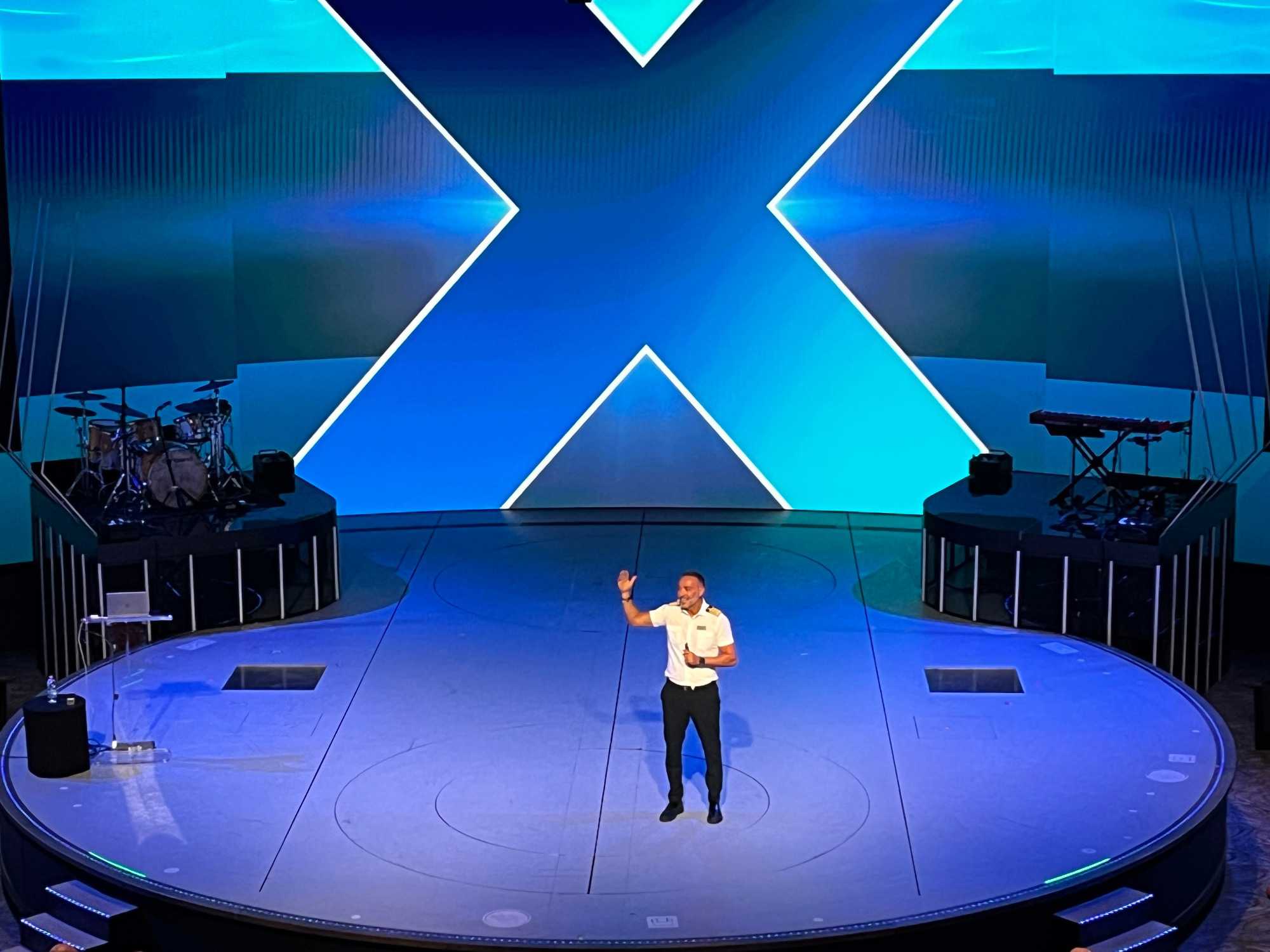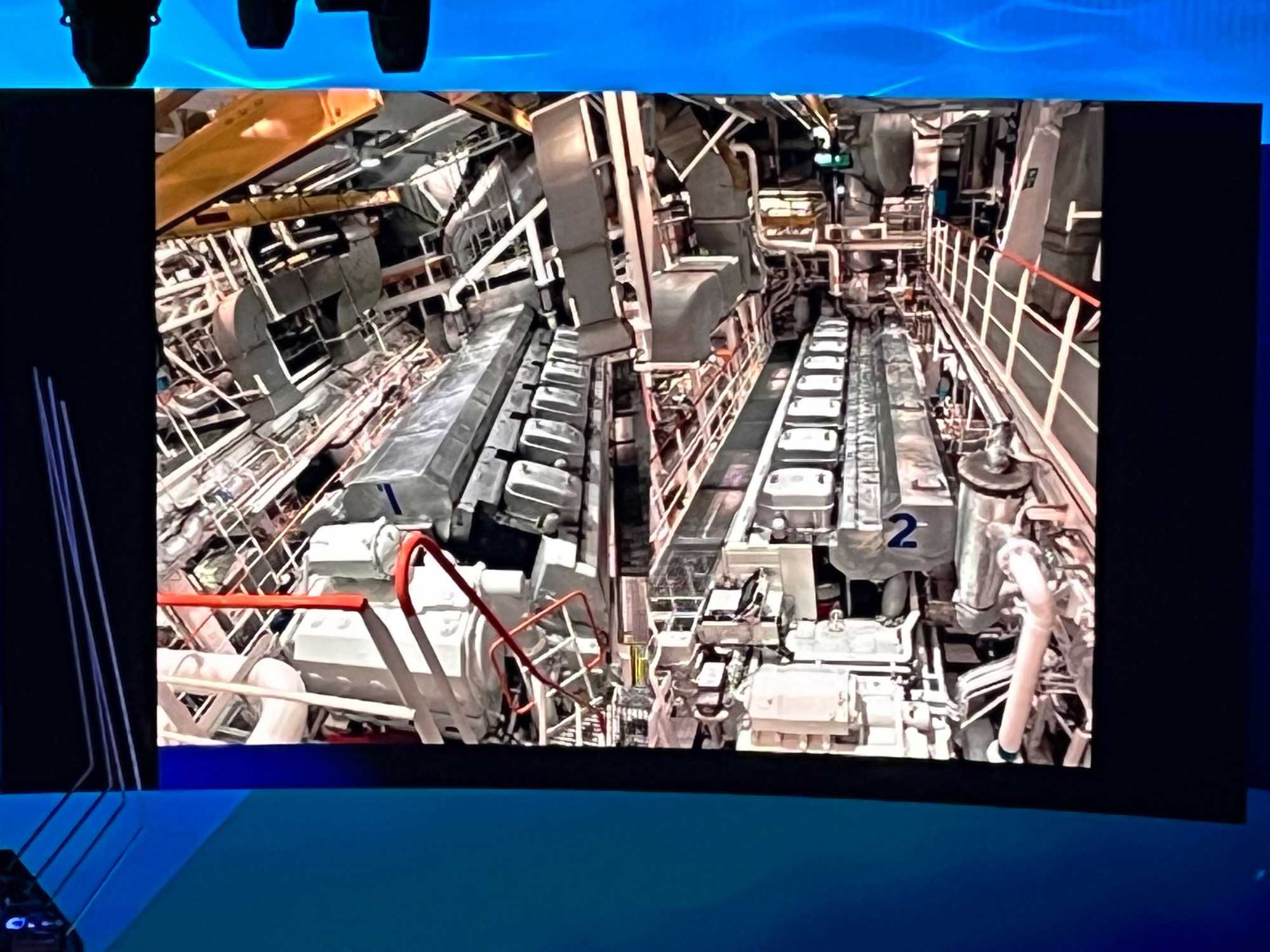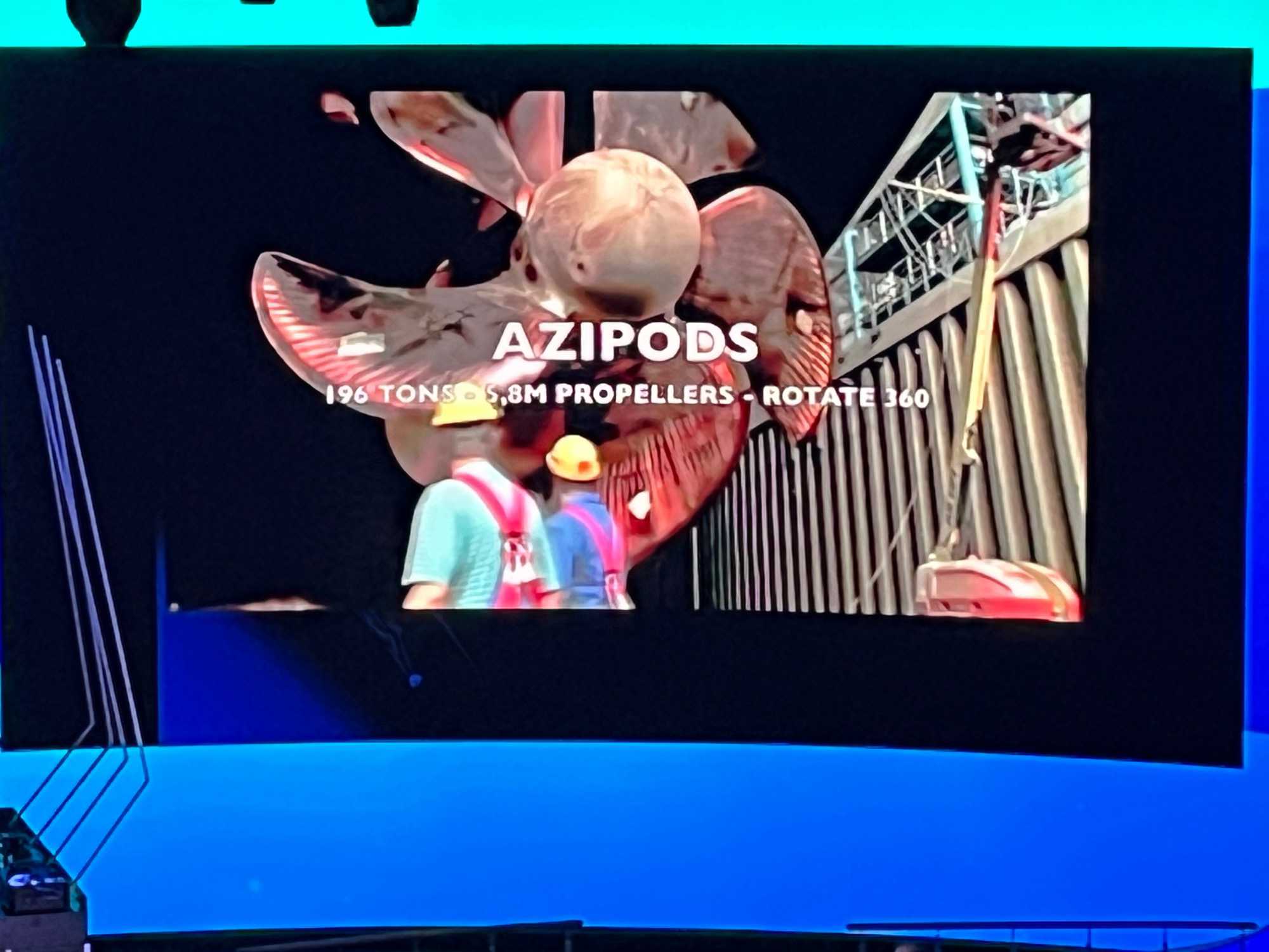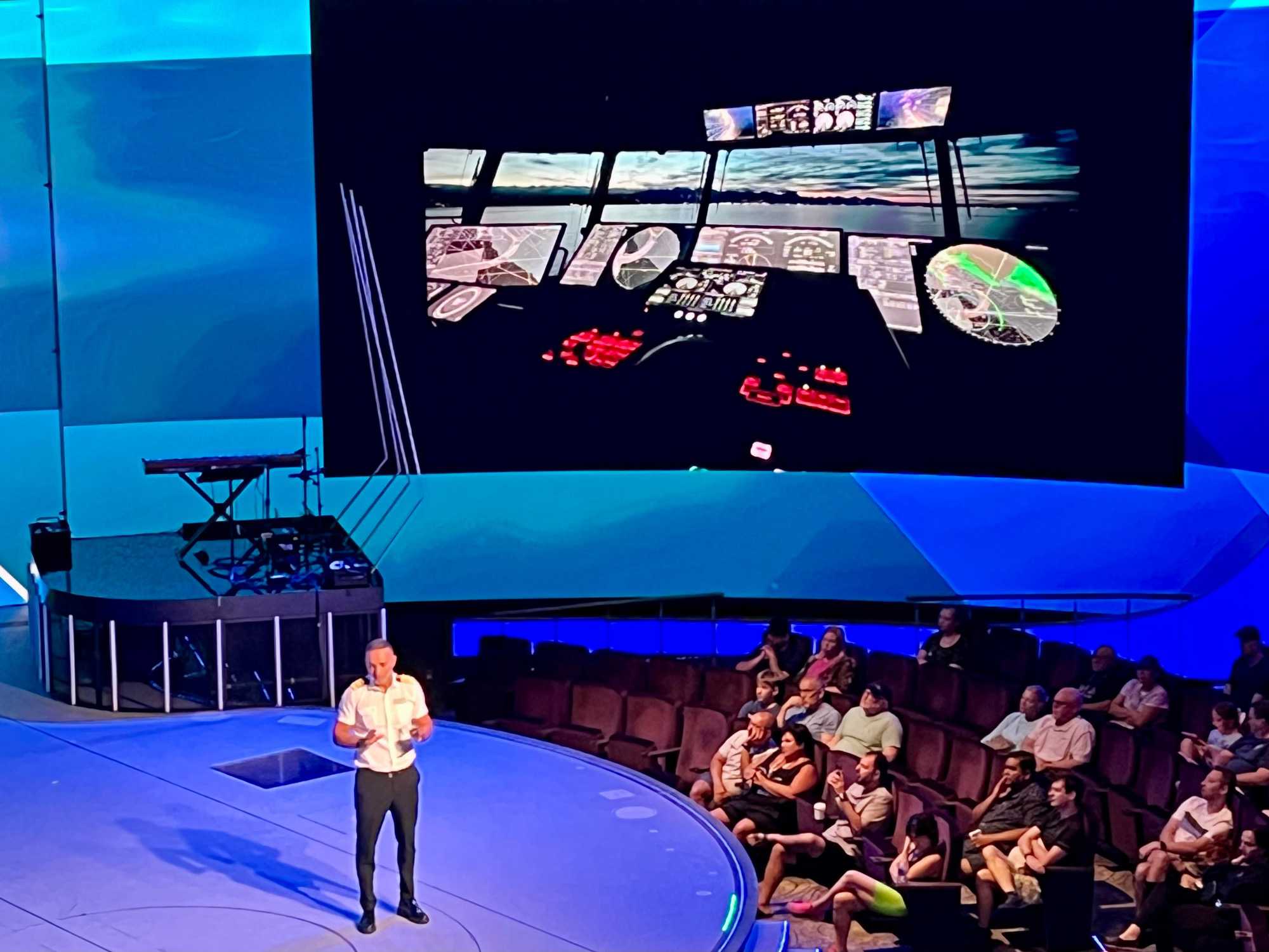 En avant-midi, nous assistons à une présentation passionnante du capitaine Tasos dans le grand théâtre. Il nous parle avec fierté de la construction du Celebrity Ascent, des innovations technologiques et environnementales qui en font l’un des navires les plus modernes au monde. On ressent toute sa passion pour la navigation et son attachement à son équipage. Il nous explique avoir été impliqué dans les différentes phases d’inspection lors de la construction de cet immense paquebot ayant coûté plus de 1,2 milliard de dollars US. Ce navire a été construit aux Chantiers de l’Atlantique à St-Nazaire en France. Il est équipé de plusieurs génératrices d’électricité desservant tous les besoins en énergie. Son système électrique peut même être raccordé par des câbles électriques de très gros calibres au port de Fort Lauderdale lorsque nous y sommes amarrés. Ceci lui permet d’arrêter certaines génératrices en attendant son prochain départ. La propulsion du navire est assurée par deux moteurs électriques couplés à deux immenses hélices de trois mètres de diamètre. Ces deux moteurs peuvent pivoter de 360 degrés et ils sont contrôlés de manière indépendante l’un de l’autre, en marche avant et en marche arrière. En les activant judicieusement, il est possible de manoeuvrer le navire dans toutes les directions et c’est pour cela qu’il n’a pas de gouvernail. Le capitaine peut aussi positionner le navire à l’aide des hélices transversales situées en avant dans la coque; elles sont utilisées seulement à très basse vitesse comme lors des approches d’un quai dans les ports. L’avant du navire est comme une lame de couteau et c’est vraiment pour fendre l’eau qu’il est ainsi dessiné. Ceci a pour effet de donner plus de stabilité au navire et aussi permettre une économie de carburant en ayant un profil plus aérodynamique.