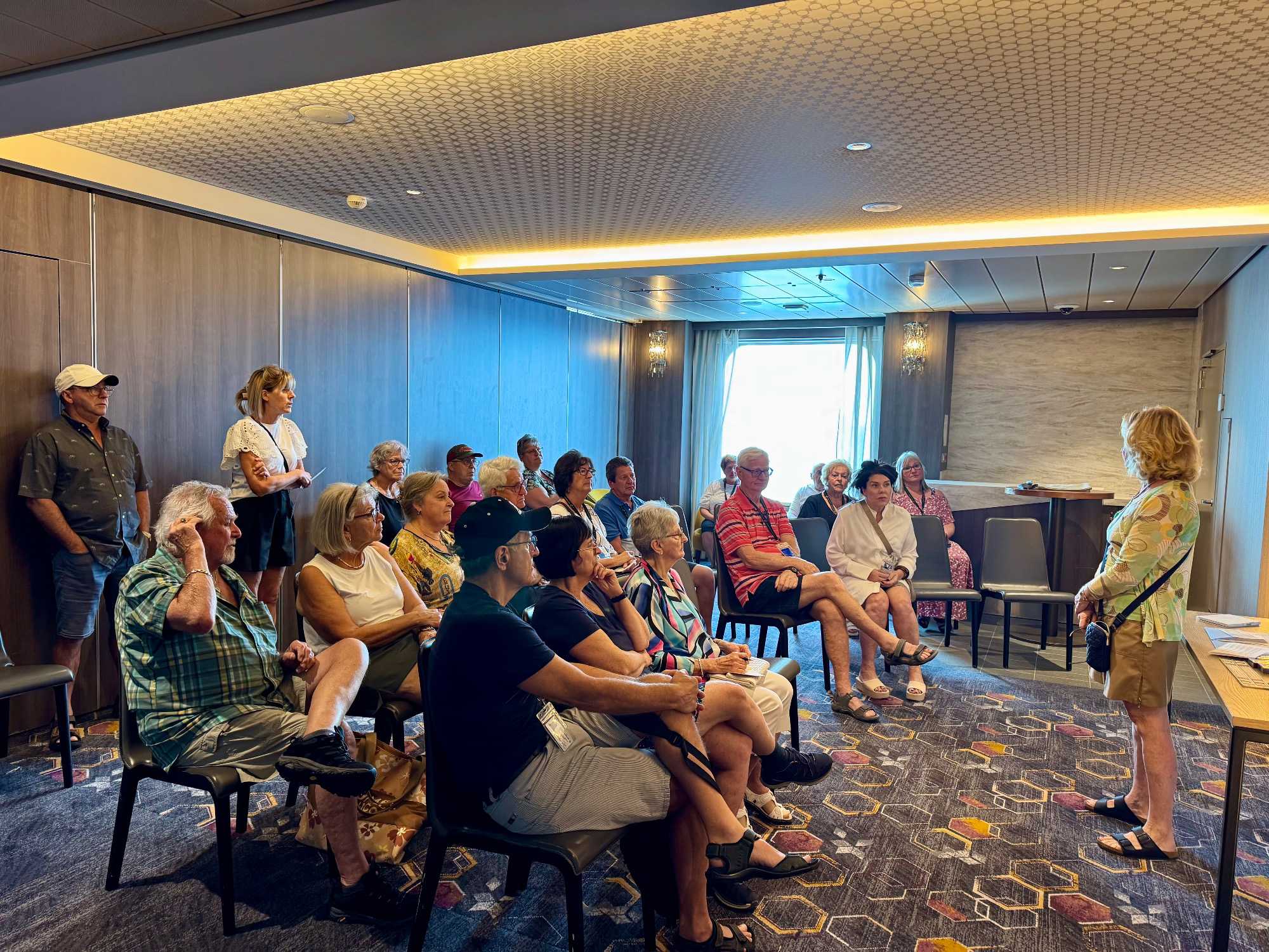 À 11 h, le groupe se retrouve pour la rencontre de débarquement dans une salle de conférence. Les consignes d’usage sont expliquées afin de faciliter les procédures de retour à la maison. Un moment plus pratique, mais nécessaire, qui nous rappelle que le voyage avance.