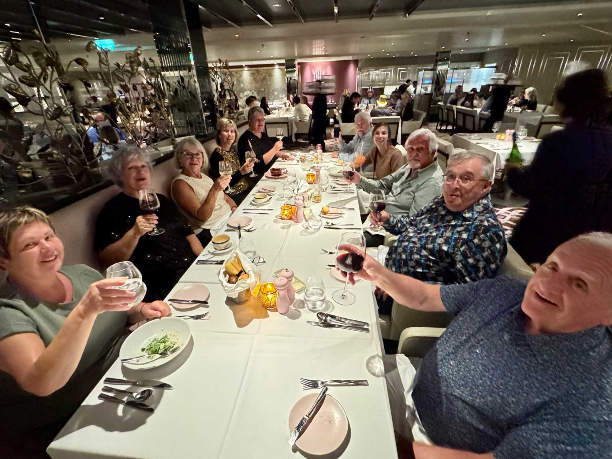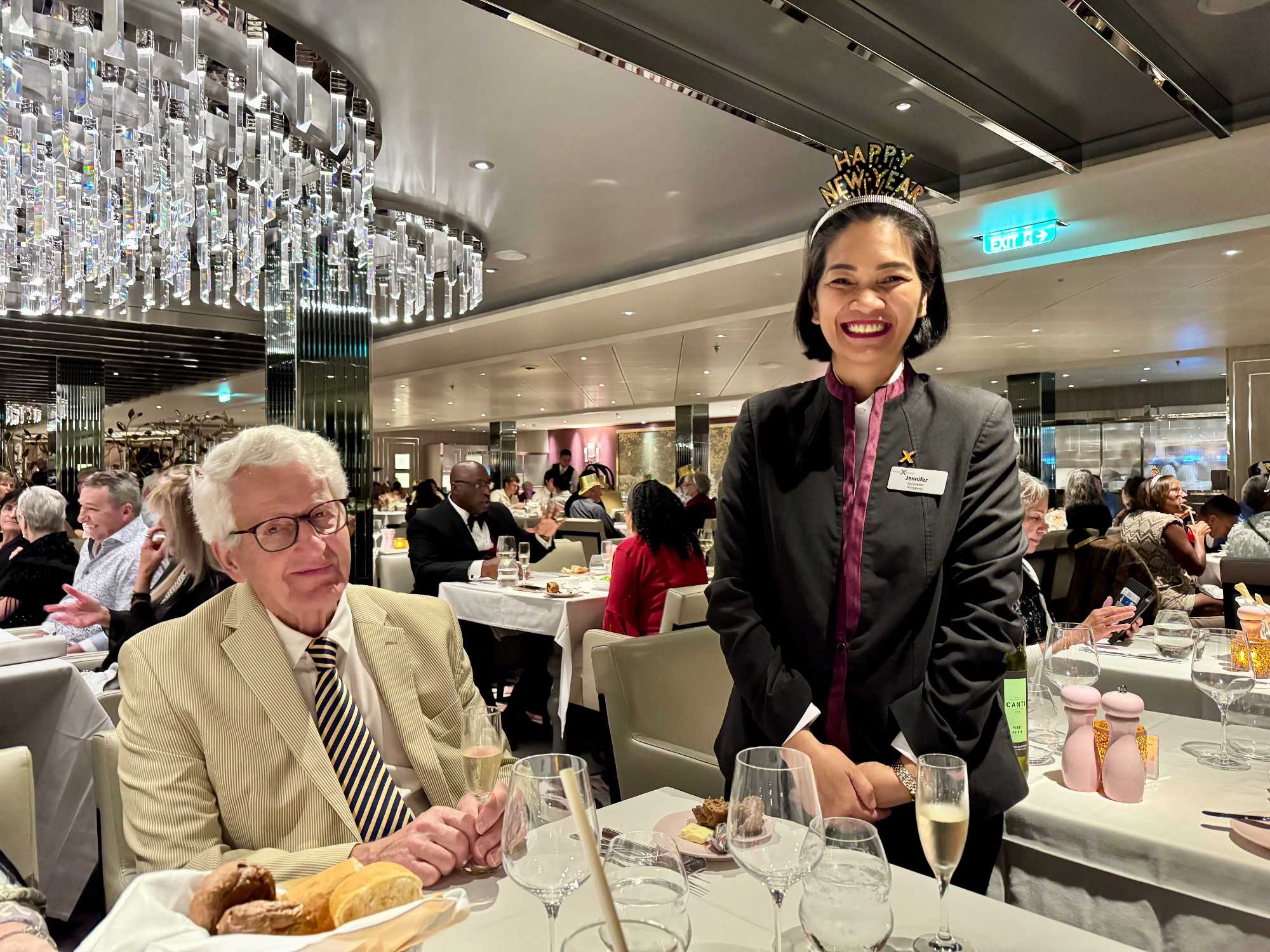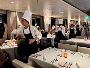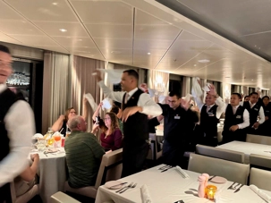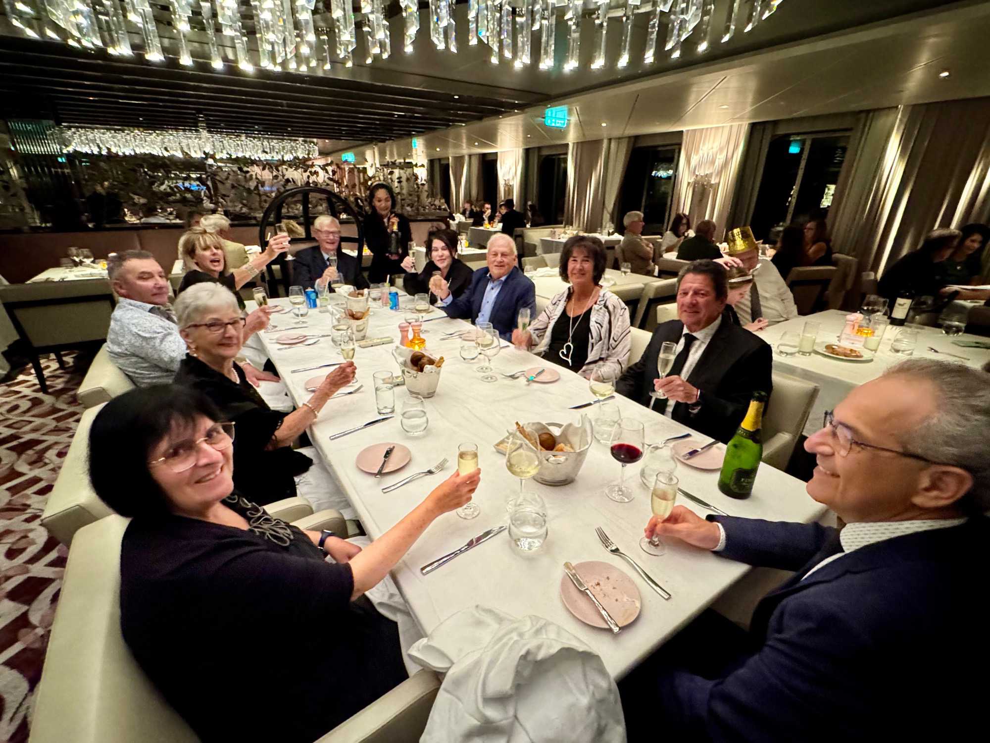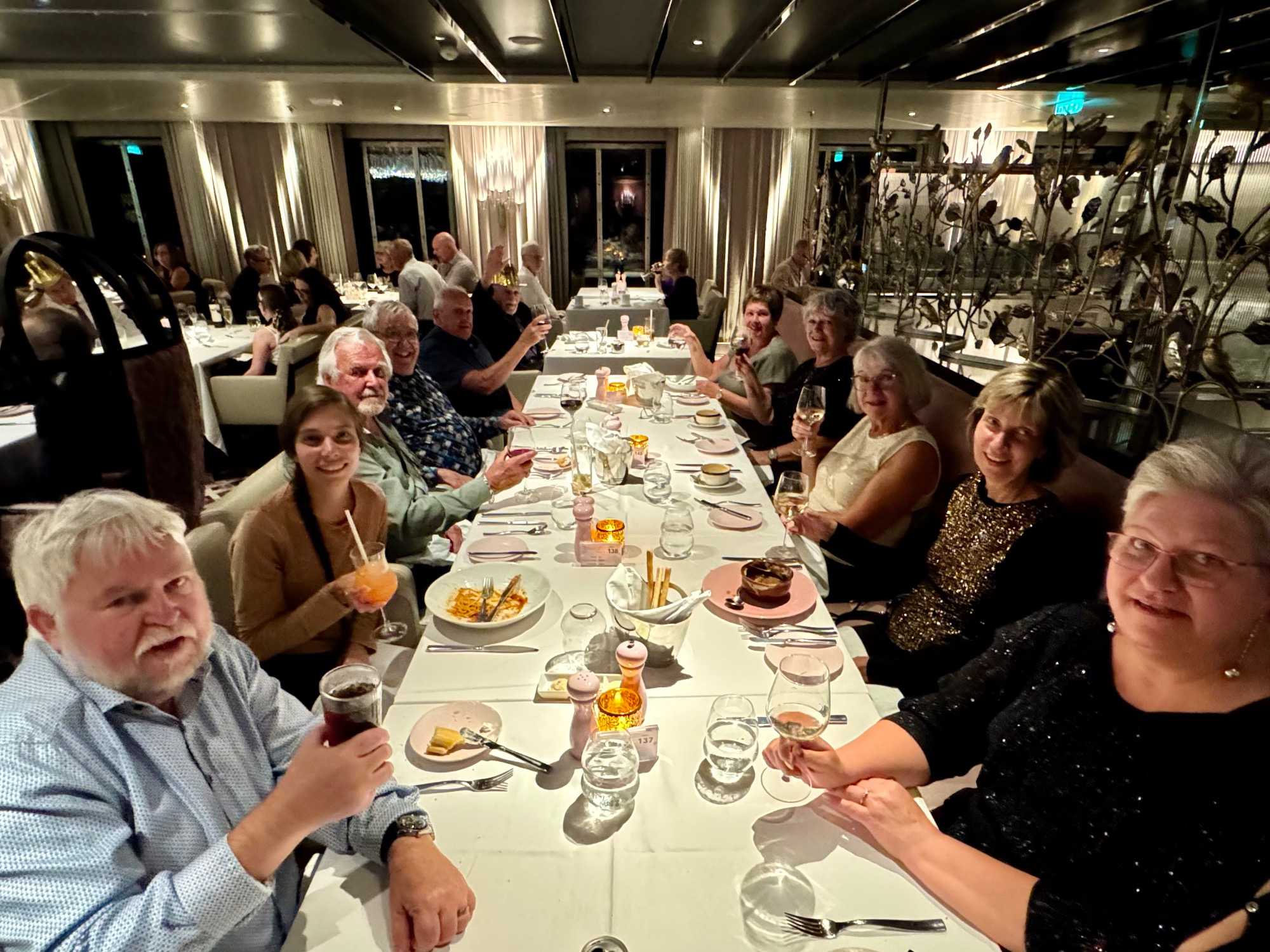 Ce soir, c’est la soirée du capitaine, notre deuxième soirée chic. Les voyageurs se prêtent avec enthousiasme au jeu de l’élégance. Les dames sont resplendissantes, les hommes impeccables, et l’atmosphère est à la fête en cette dernière soirée de l’année 2025. La joie, l’élégance et l’excitation flottent dans l’air. Nous décidons d’immortaliser le moment par une séance photo dans le majestueux escalier menant au restaurant. Allez voir nos photos au bas de ce récit : de magnifiques souvenirs figés dans le temps.