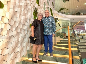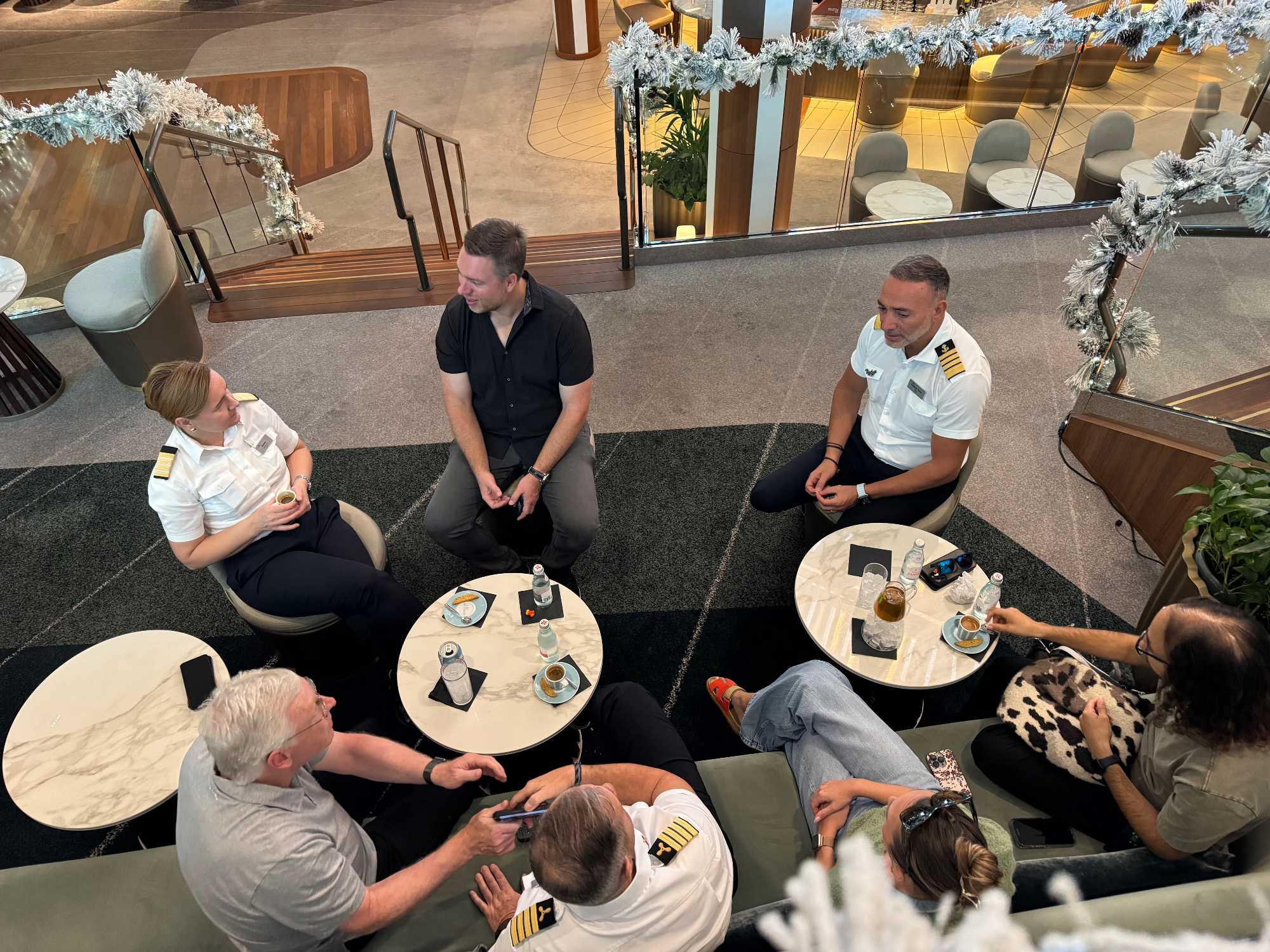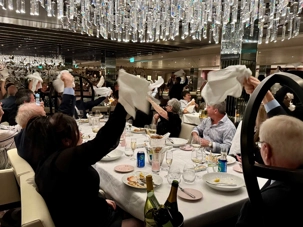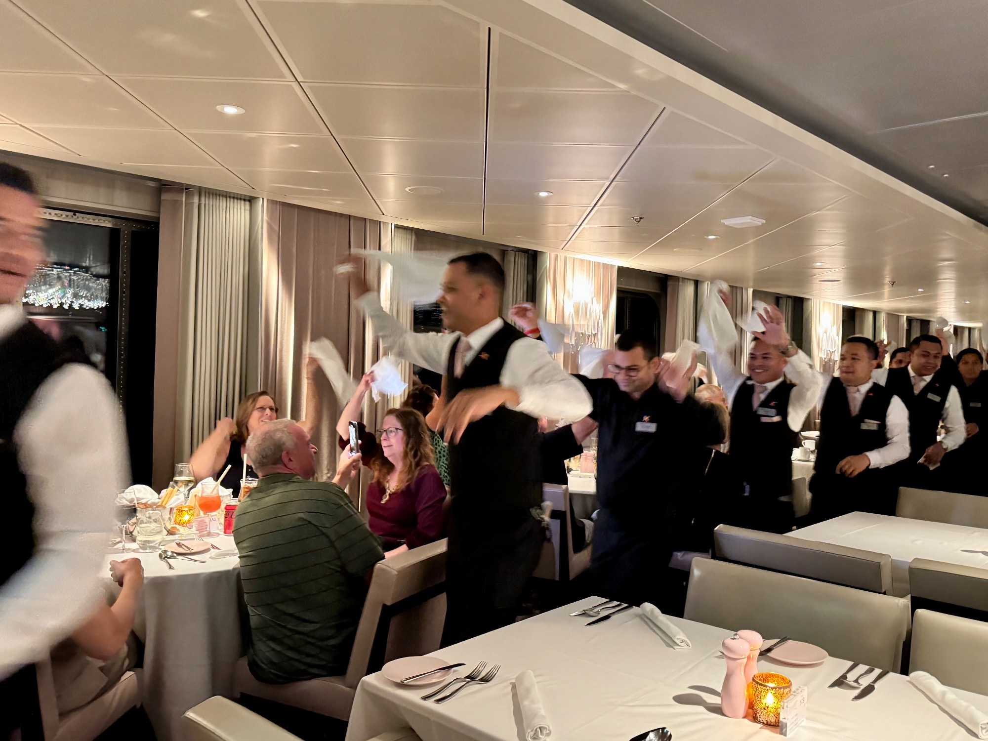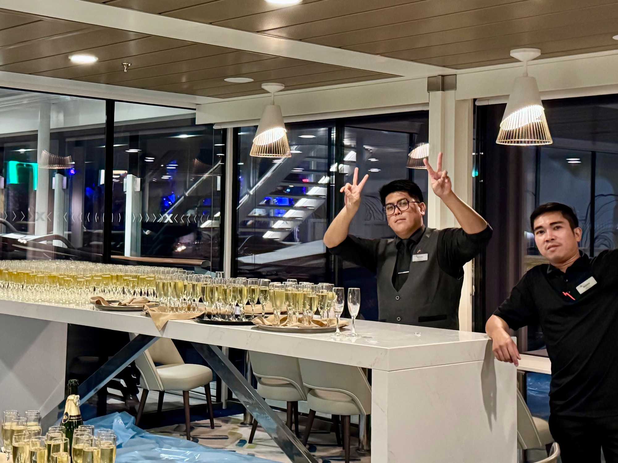 Ce soir, c’est la soirée du capitaine, notre deuxième soirée chic. Les voyageurs se prêtent avec enthousiasme au jeu de l’élégance. Les dames sont resplendissantes, les hommes impeccables, et l’atmosphère est à la fête en cette dernière soirée de l’année 2025. La joie, l’élégance et l’excitation flottent dans l’air. Nous décidons d’immortaliser le moment par une séance photo dans le majestueux escalier menant au restaurant. Allez voir nos photos au bas de ce récit : de magnifiques souvenirs figés dans le temps.