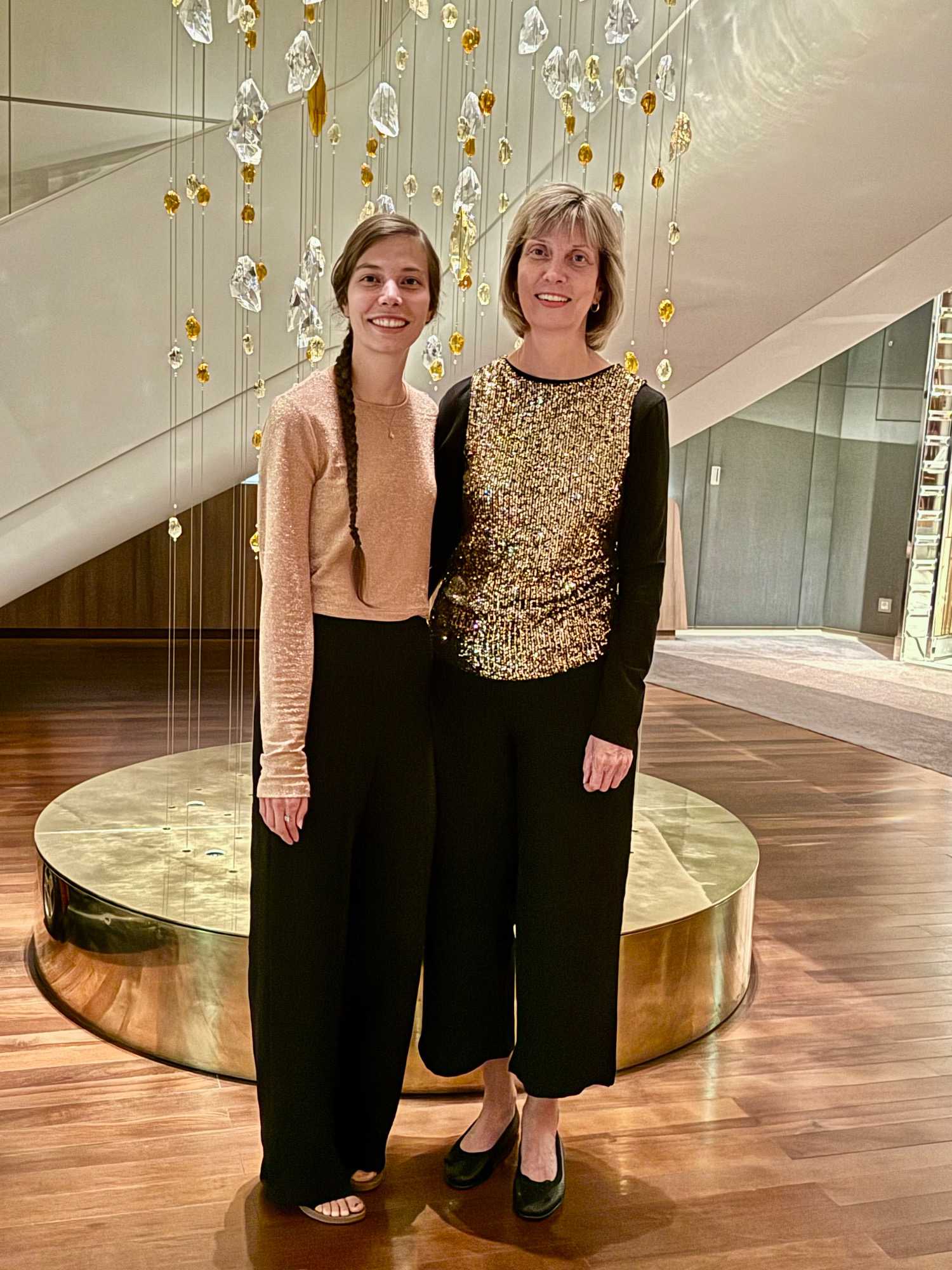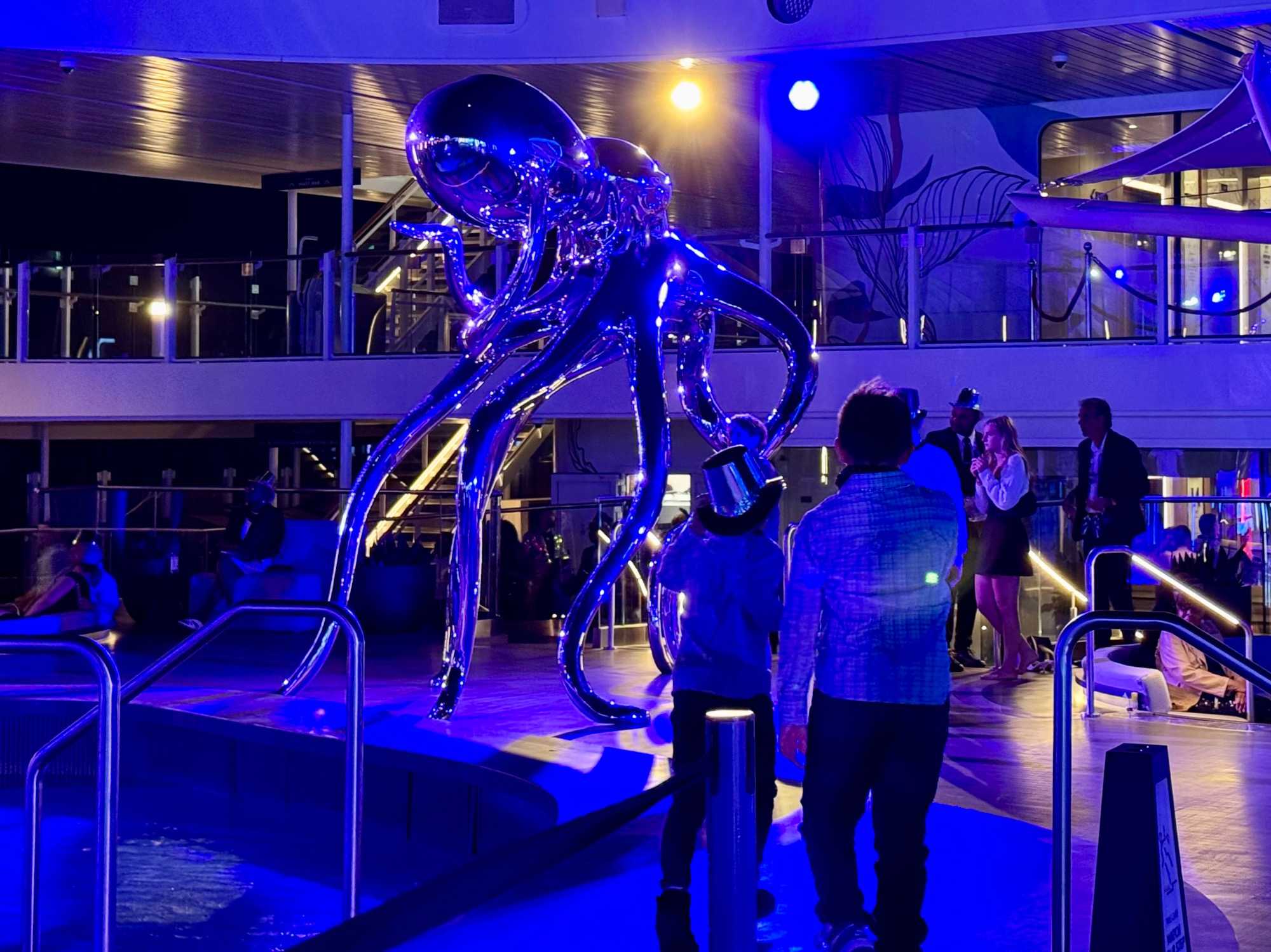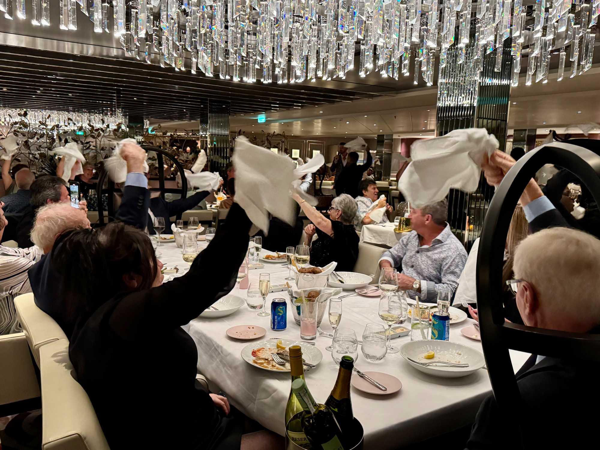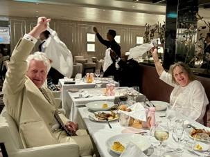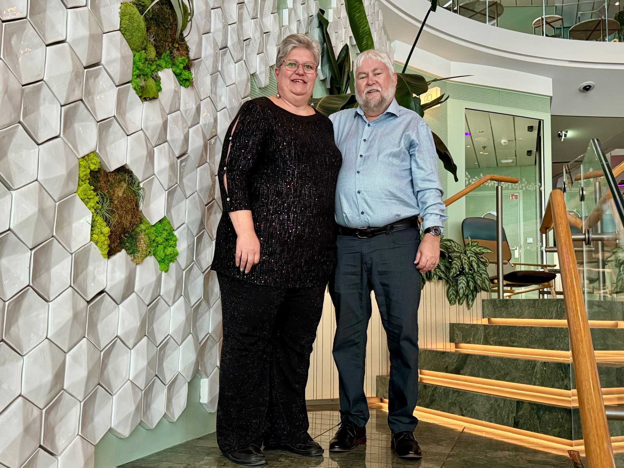 Ce soir, c’est la soirée du capitaine, notre deuxième soirée chic. Les voyageurs se prêtent avec enthousiasme au jeu de l’élégance. Les dames sont resplendissantes, les hommes impeccables, et l’atmosphère est à la fête en cette dernière soirée de l’année 2025. La joie, l’élégance et l’excitation flottent dans l’air. Nous décidons d’immortaliser le moment par une séance photo dans le majestueux escalier menant au restaurant. Allez voir nos photos au bas de ce récit : de magnifiques souvenirs figés dans le temps.