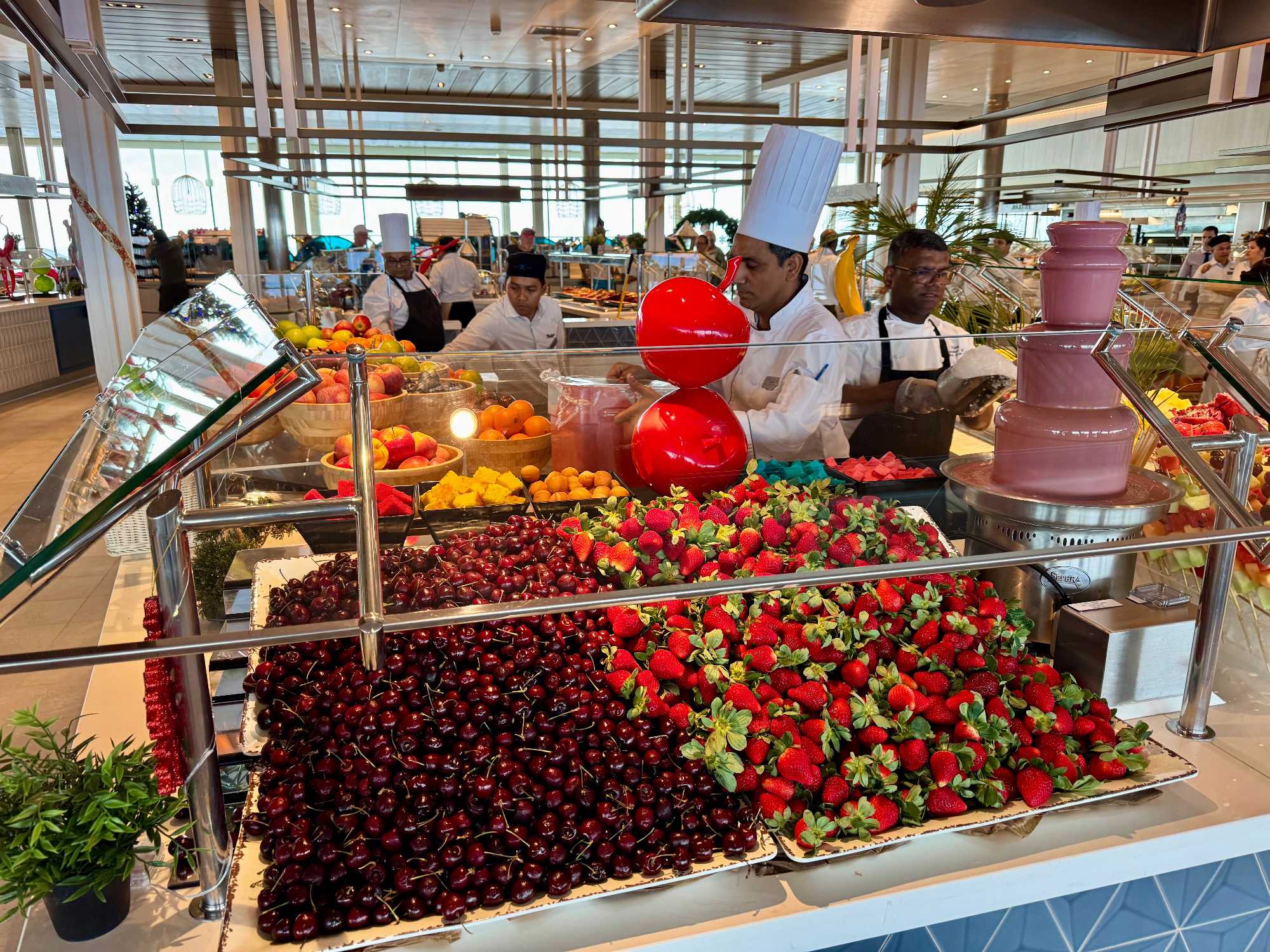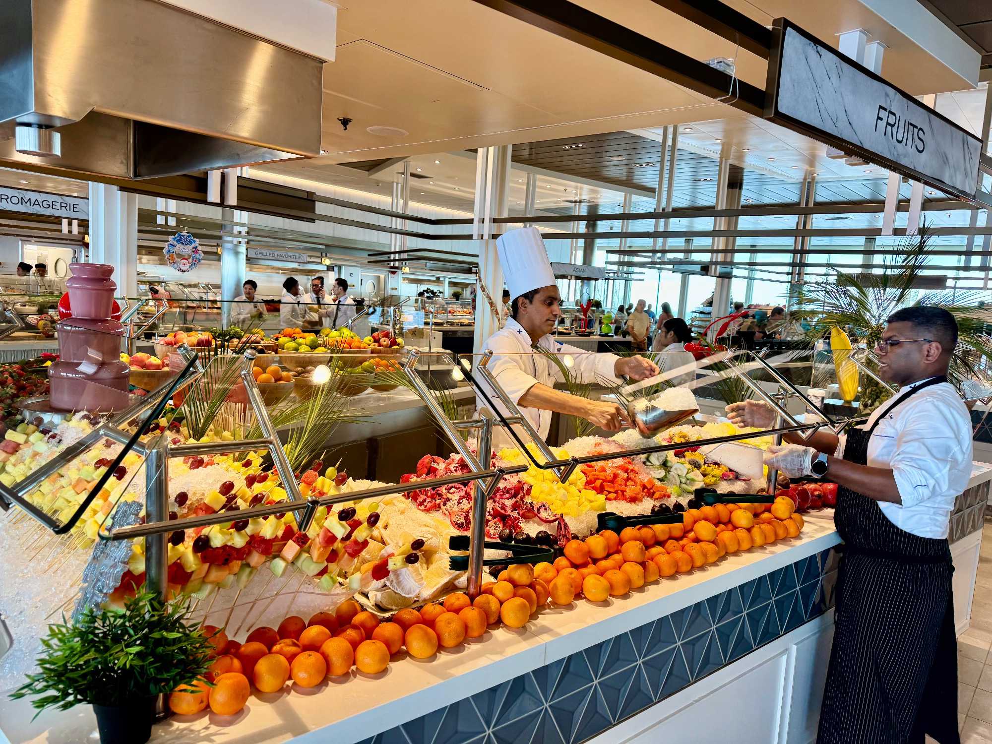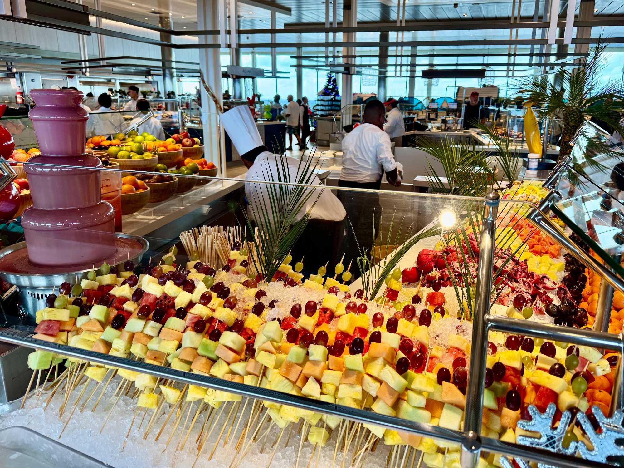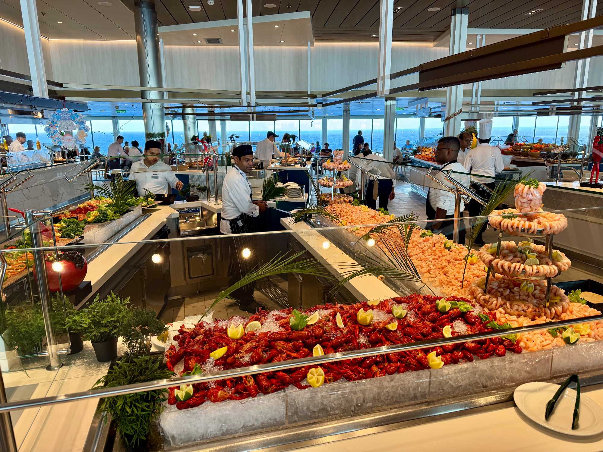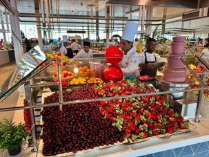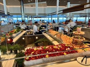 À l’heure du midi, direction l’Oceanview Café pour le fameux Buffet Extravaganza. Une véritable explosion de saveurs nous attend : poissons grillés, crevettes, salades colorées, fromages fins, fruits tropicaux et desserts absolument irrésistibles. Installés près des grandes baies vitrées, nous savourons le repas tout en admirant l’océan scintillant sous le soleil.