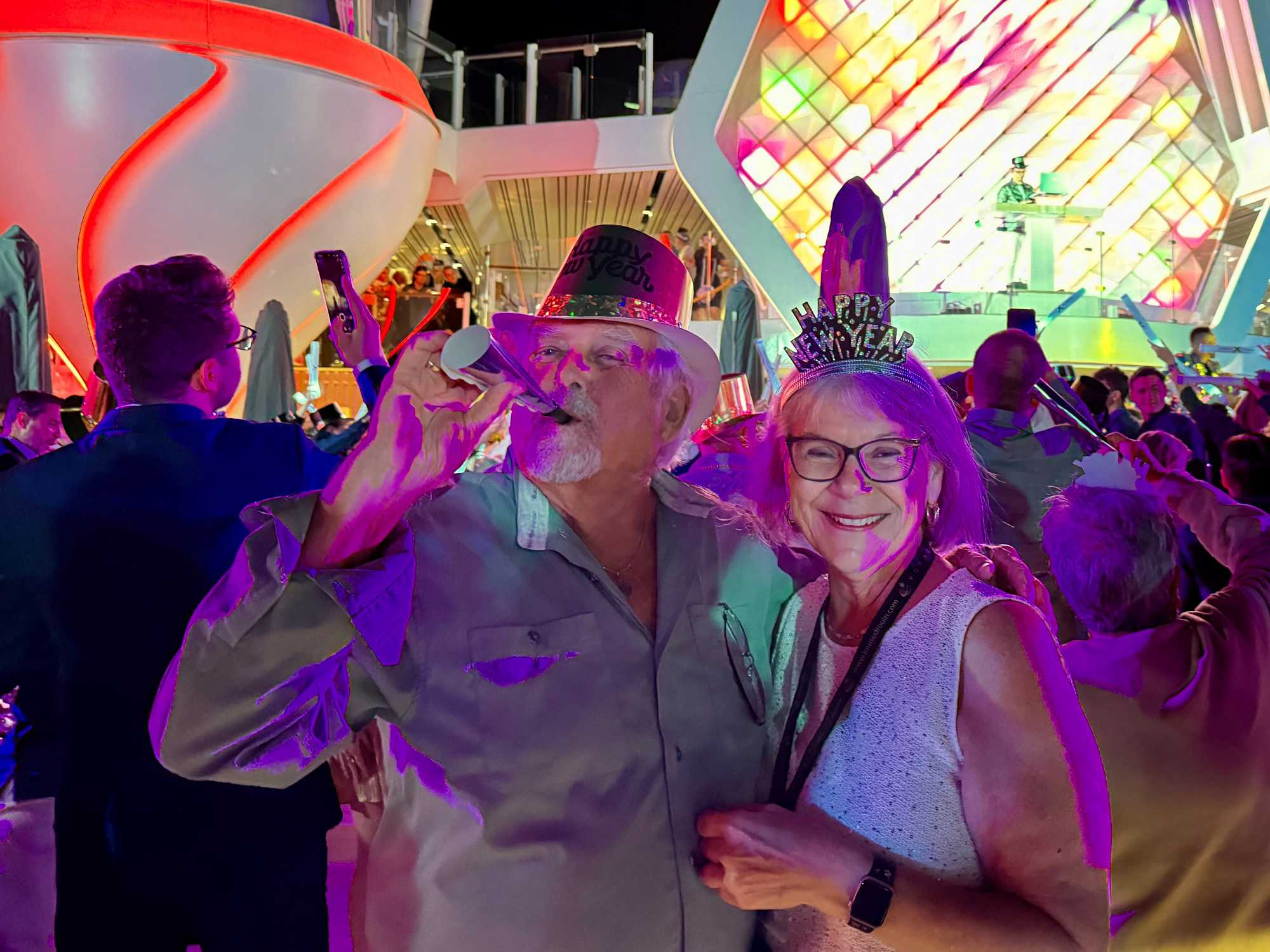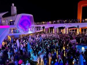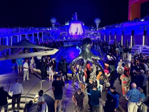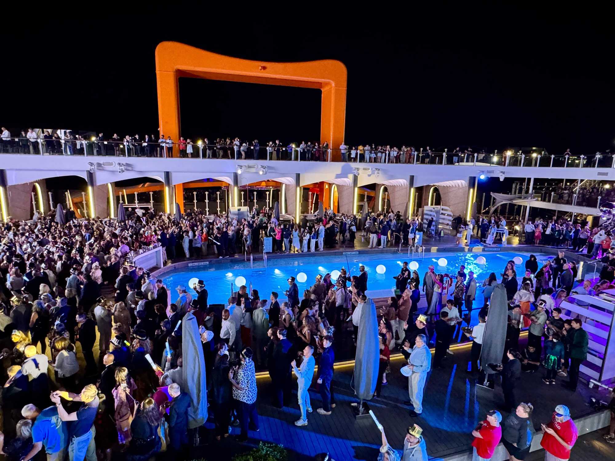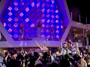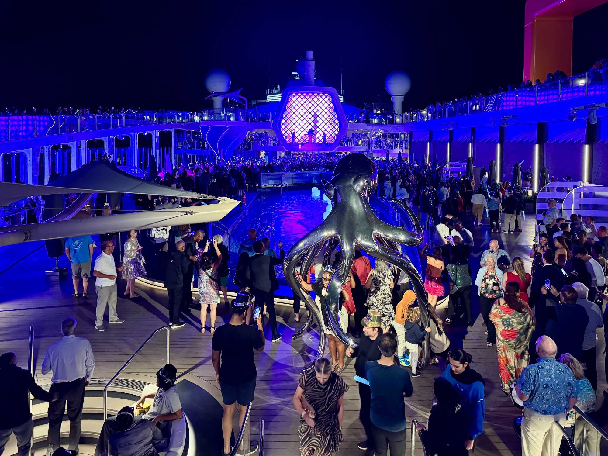 Puis arrive le moment tant attendu. Au pont 14, autour de la piscine, l’ambiance est électrisante. La musique bat son plein, les lumières scintillent et les sourires sont partout. À l’approche de minuit, les verres se remplissent et le champagne coule à flot. Lorsque l’horloge sonne les douze coups, une explosion de joie envahit le pont : on s’embrasse, on se souhaite la santé, le bonheur et de nouvelles aventures. 2025 s’efface doucement, laissant place à 2026, sous les étoiles des Caraïbes, bercés par la mer et entourés de gens formidables. Un moment magique, gravé à jamais dans nos mémoires.