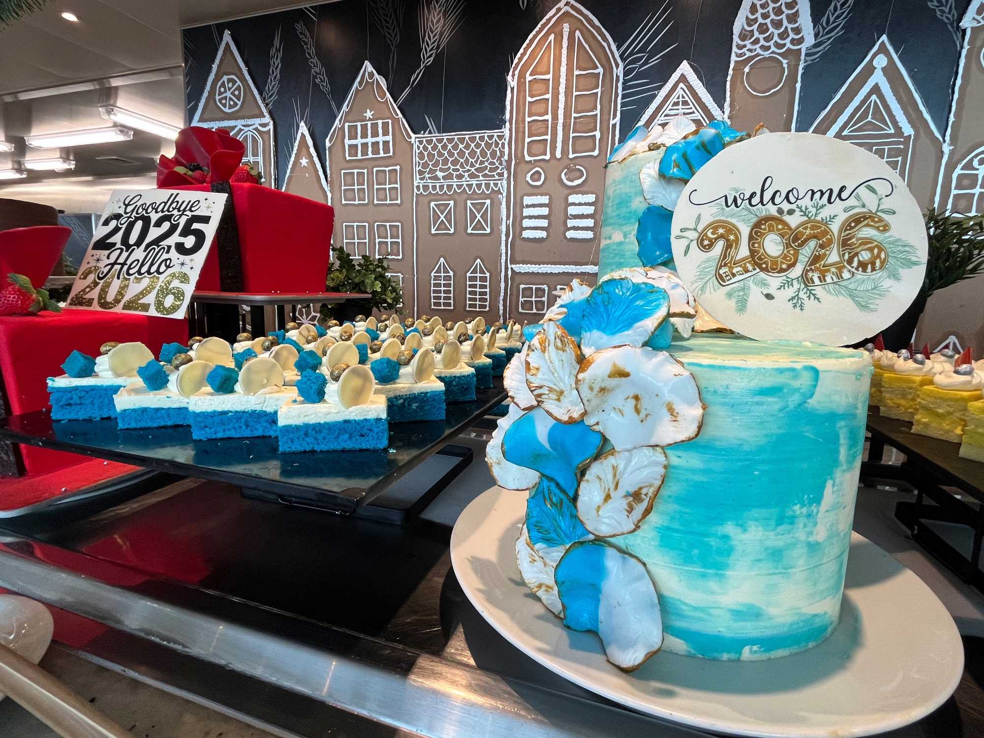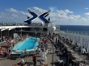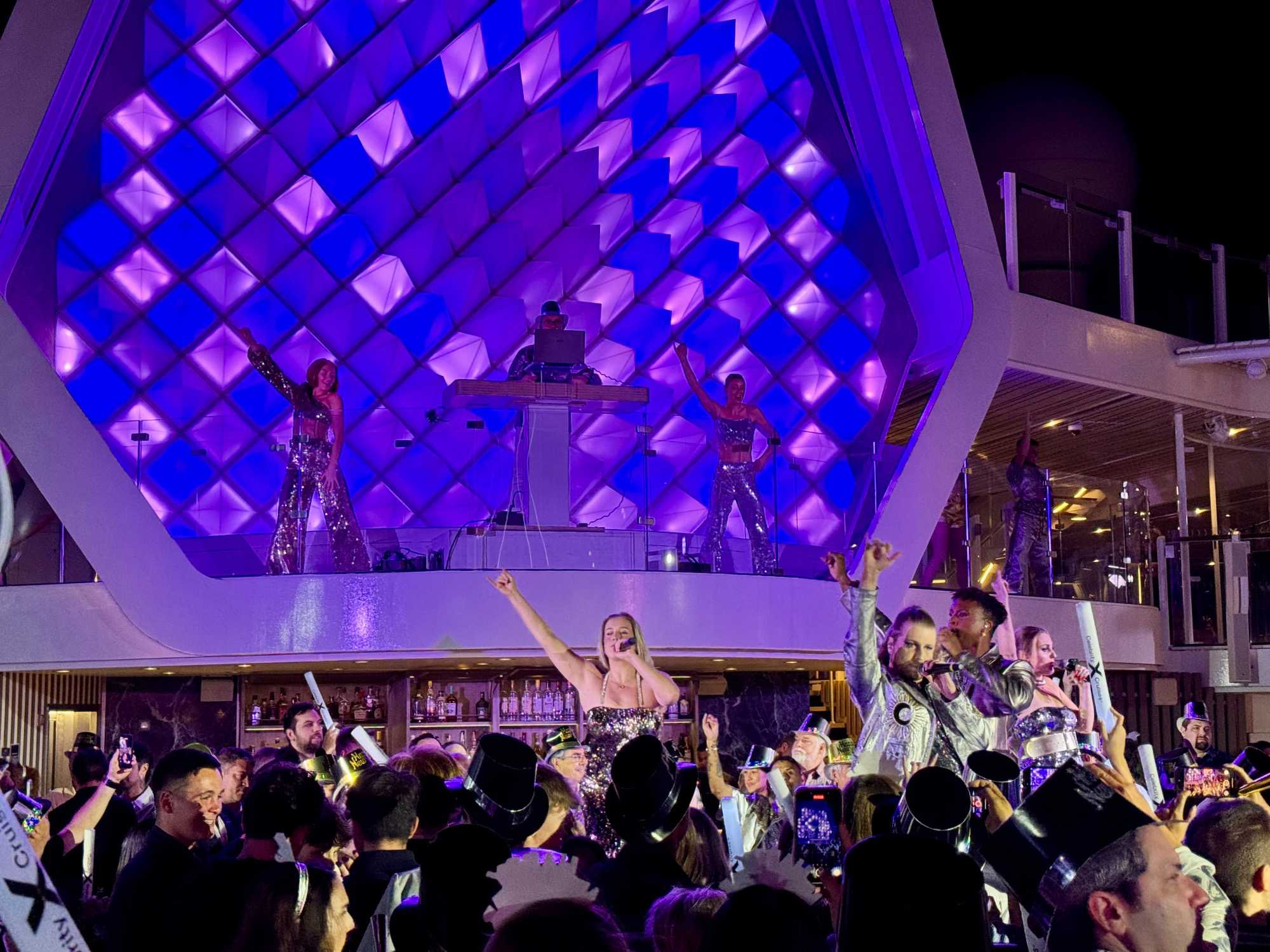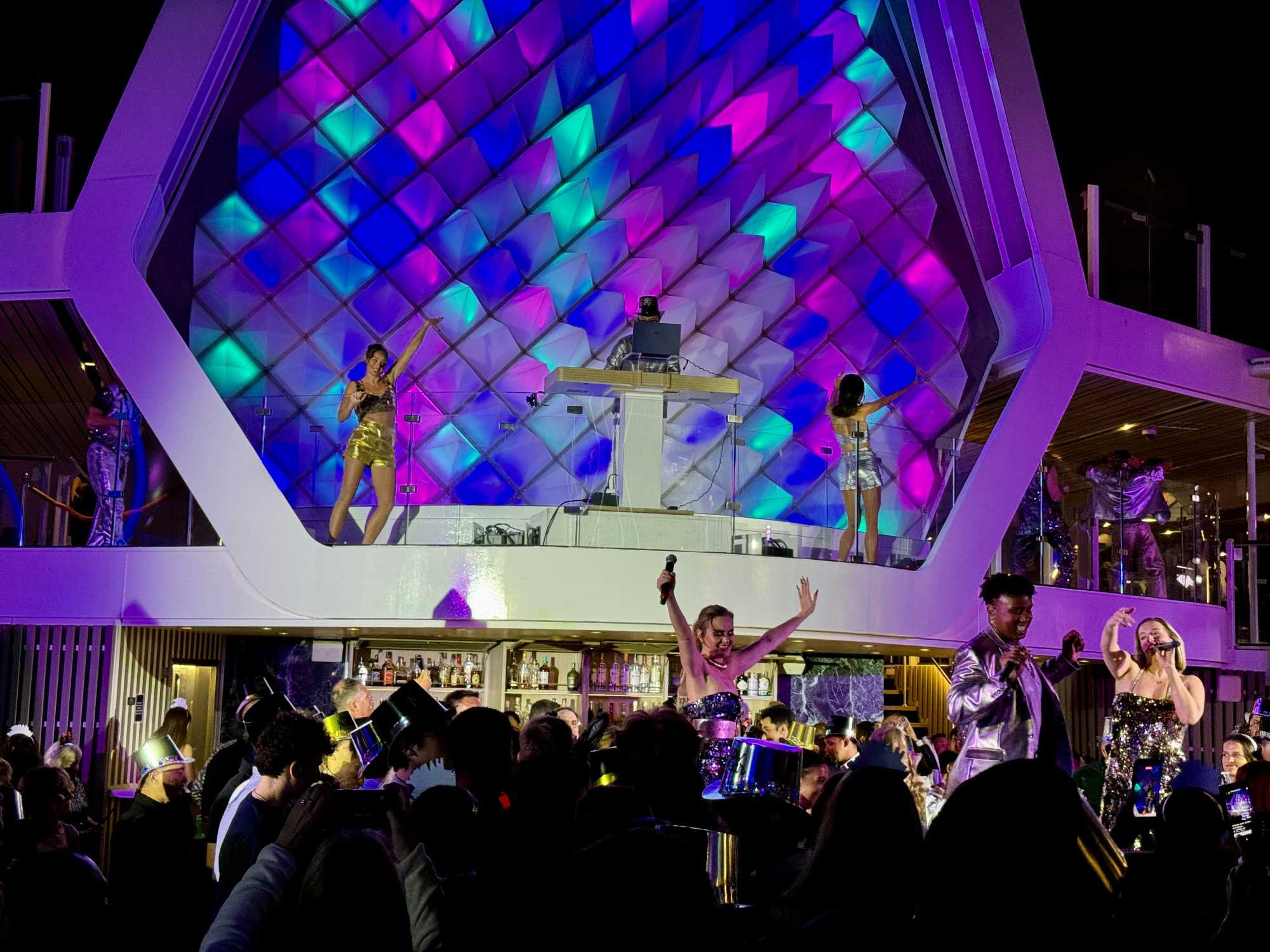 Puis arrive le moment tant attendu. Au pont 14, autour de la piscine, l’ambiance est électrisante. La musique bat son plein, les lumières scintillent et les sourires sont partout. À l’approche de minuit, les verres se remplissent et le champagne coule à flot. Lorsque l’horloge sonne les douze coups, une explosion de joie envahit le pont : on s’embrasse, on se souhaite la santé, le bonheur et de nouvelles aventures. 2025 s’efface doucement, laissant place à 2026, sous les étoiles des Caraïbes, bercés par la mer et entourés de gens formidables. Un moment magique, gravé à jamais dans nos mémoires.
