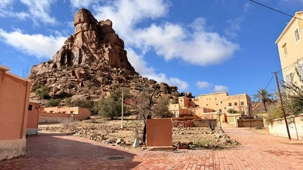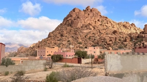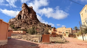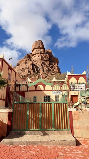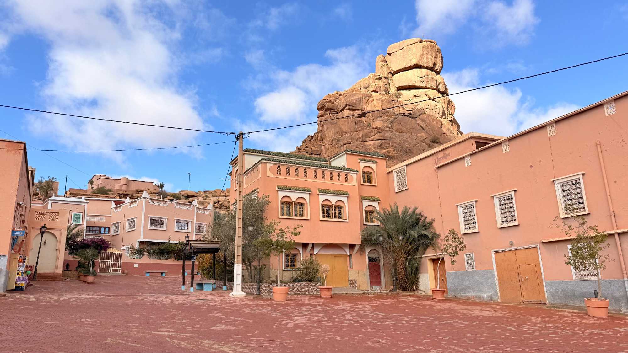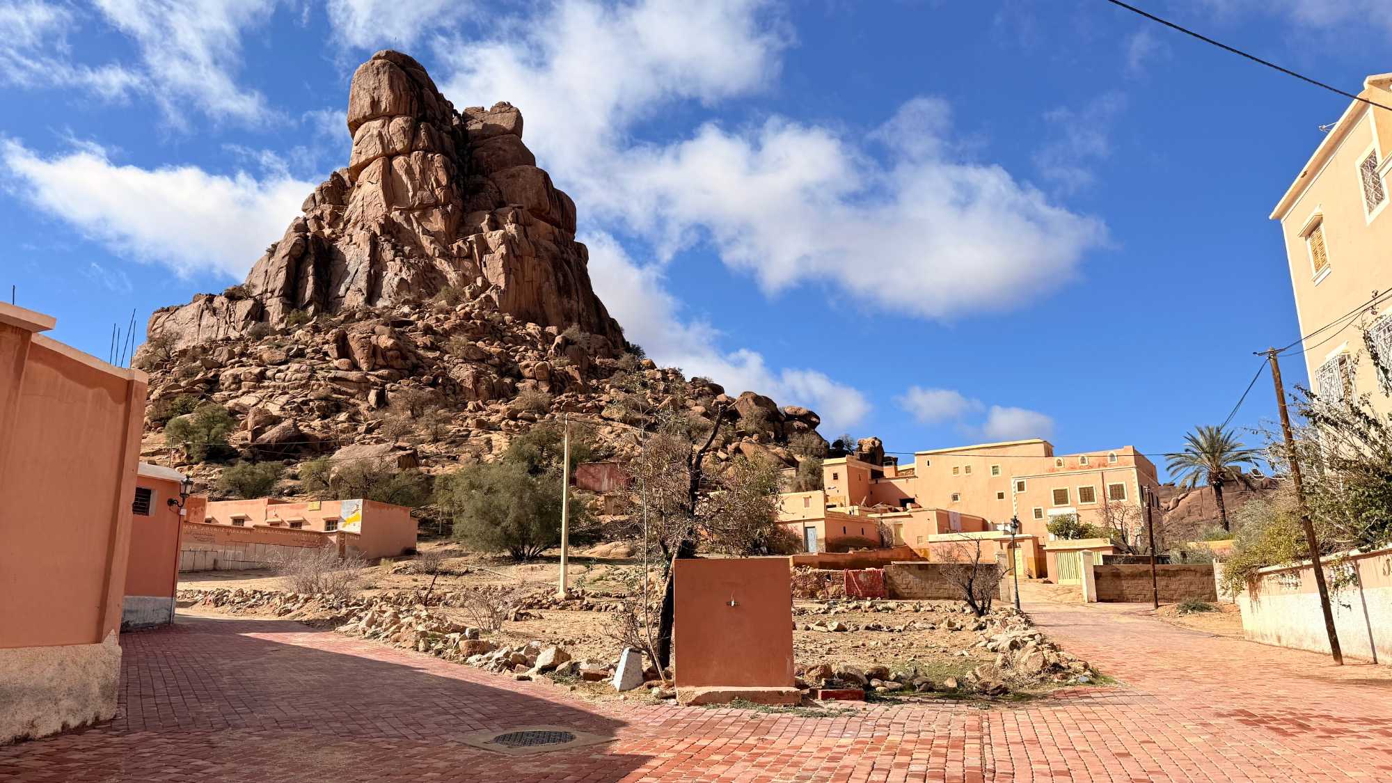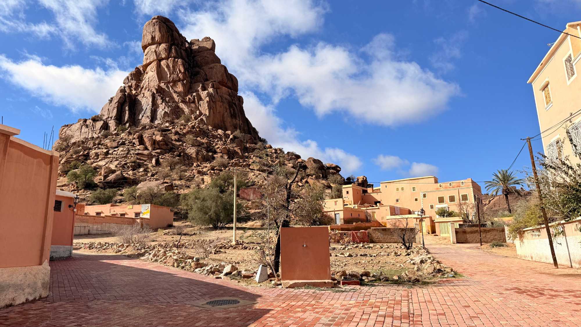 La route nous mène ensuite vers un village rattaché à Tafraoute, dominé par un immense rocher incliné que l’érosion a patiemment façonné au fil des siècles, lui donnant la forme surprenante d’un chapeau de Napoléon. Autour, les rochers semblent raconter des histoires : visages, silhouettes animales, formes mystérieuses. Un lieu qui, depuis toujours, inspire poètes et chanteurs berbères.