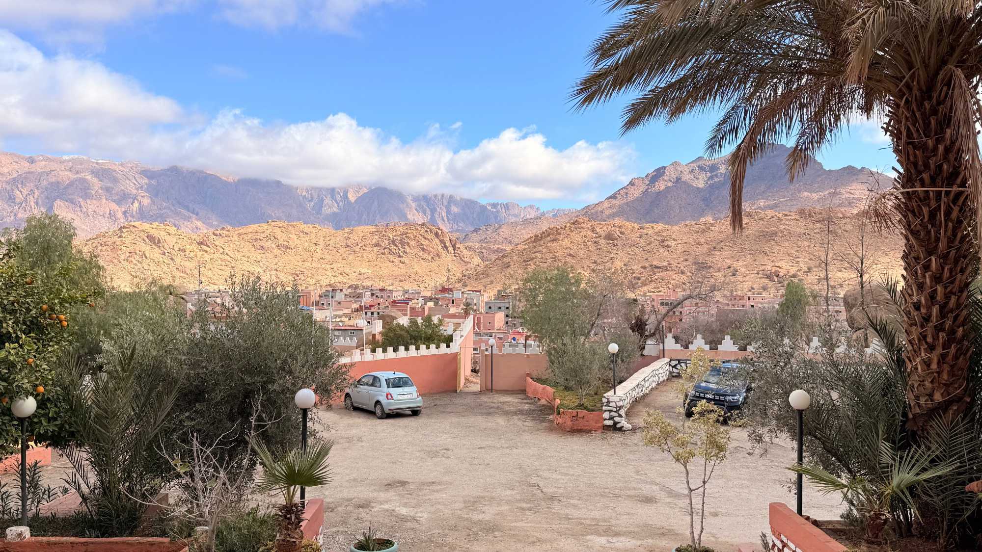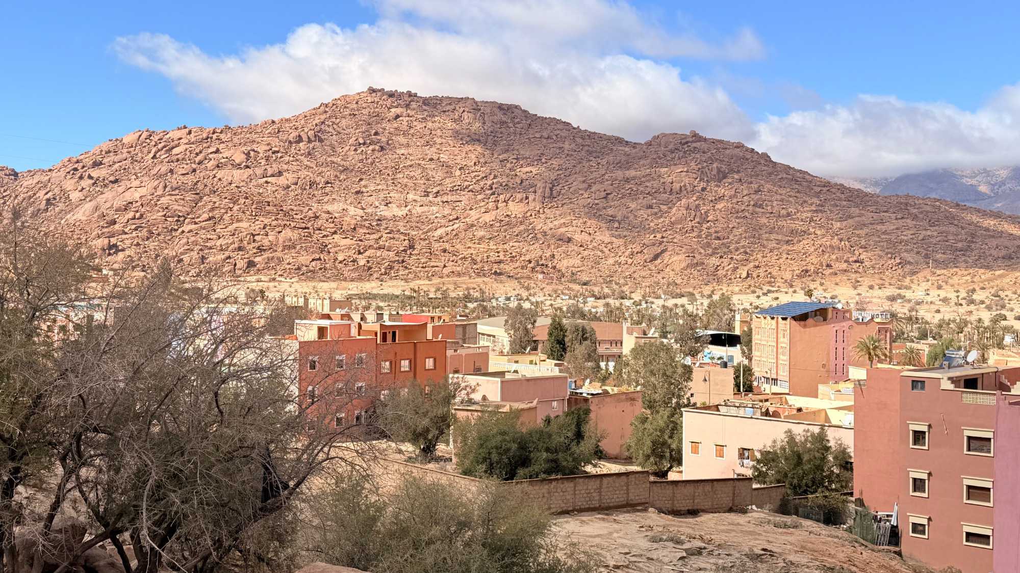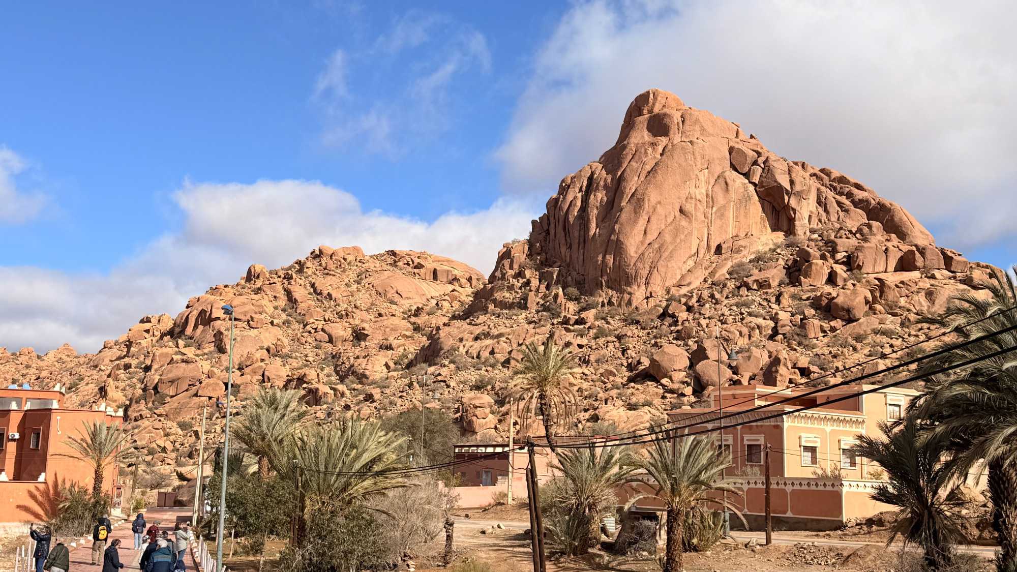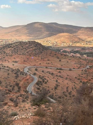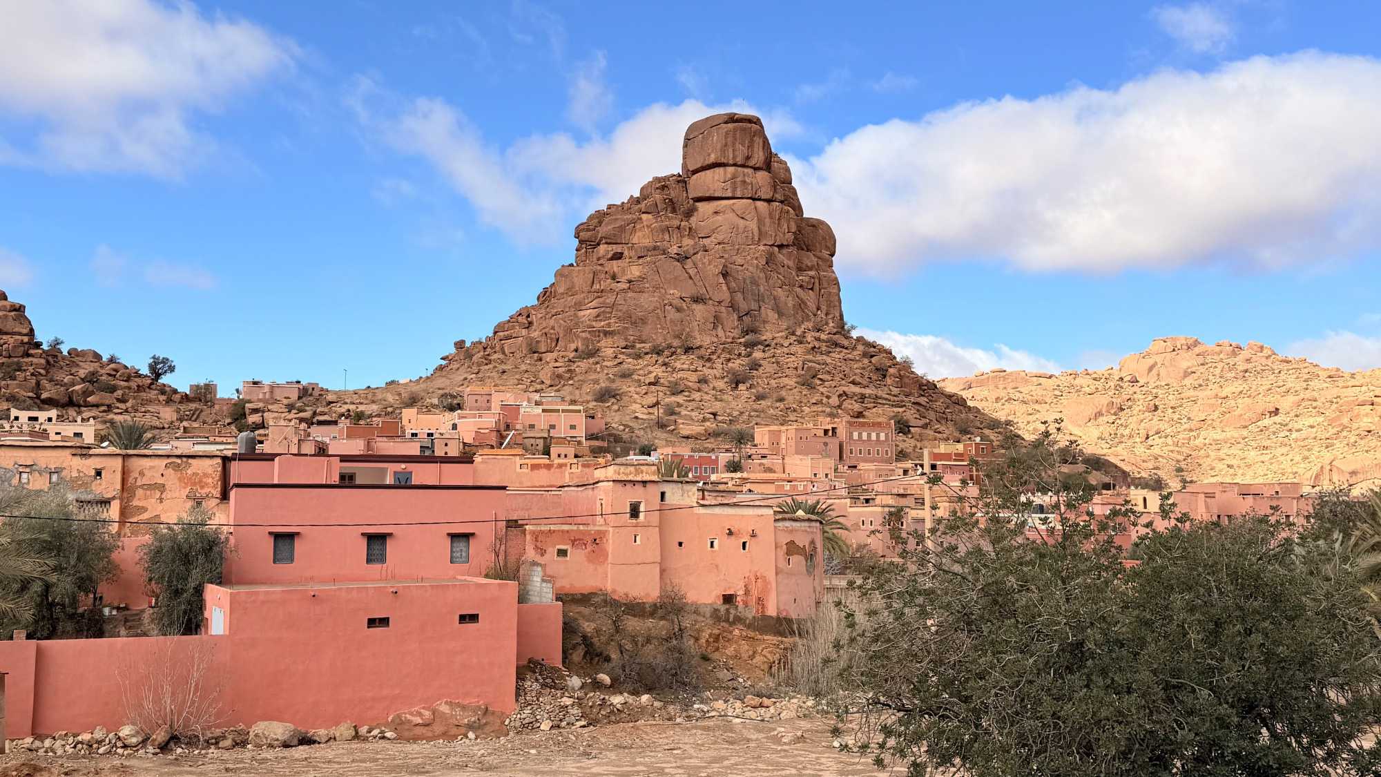 Puis, l’appel de la route s’est fait sentir. Frais et dispos, levés dès l’aube et réchauffés par un petit déjeuner, nous avons pris la direction de Tafraoute et Tiout. Les 165 kilomètres à parcourir se sont vite effacés devant la beauté des paysages. Routes sinueuses, montagnes arides, horizons à perte de vue… Le Maroc se dévoile lentement, majestueux, rappelant par son immensité le Québec, mais avec une âme et des couleurs bien à lui.