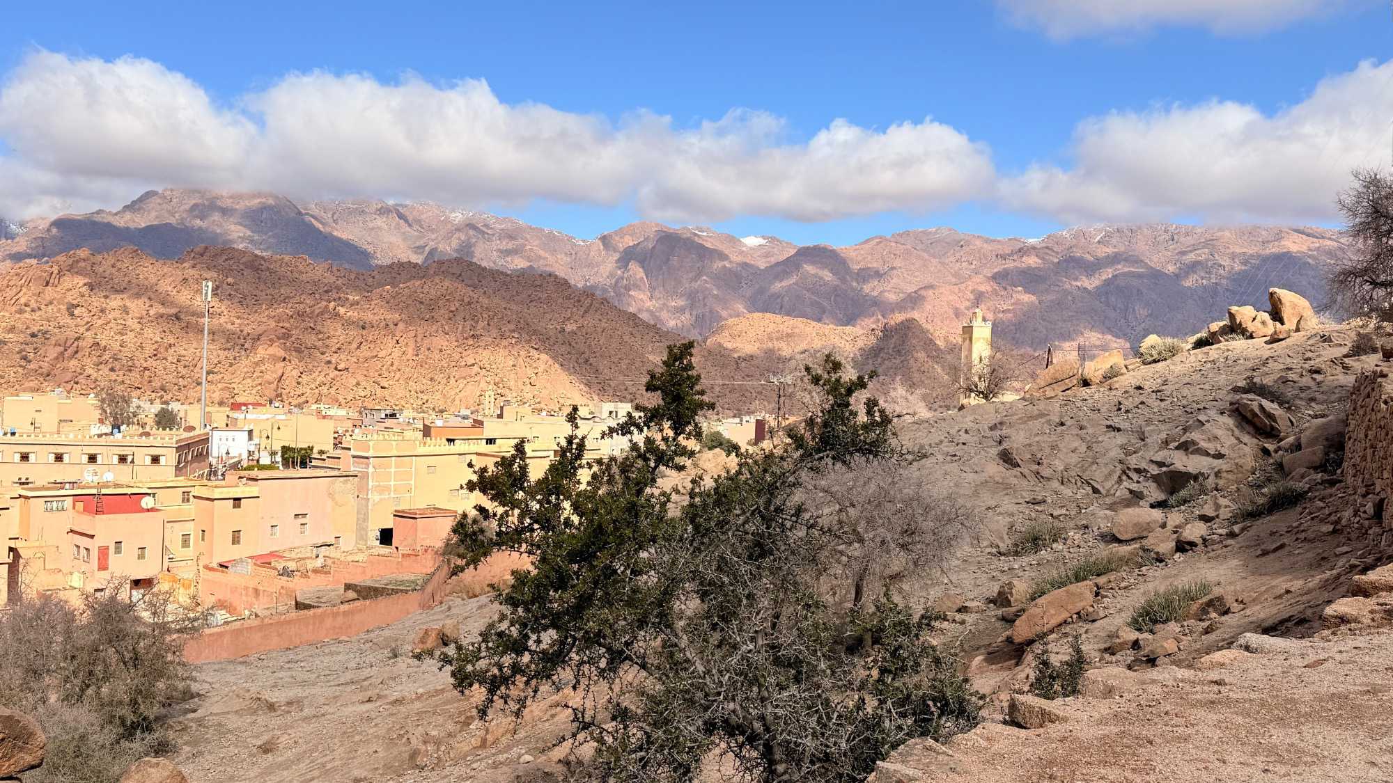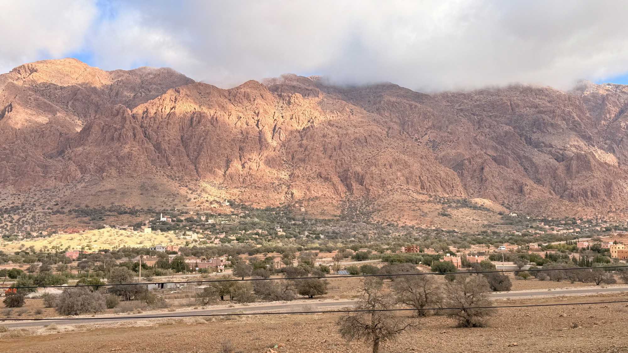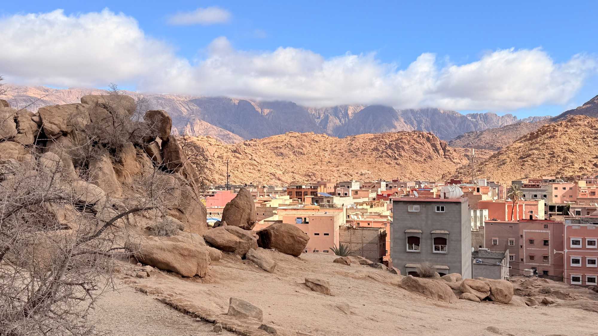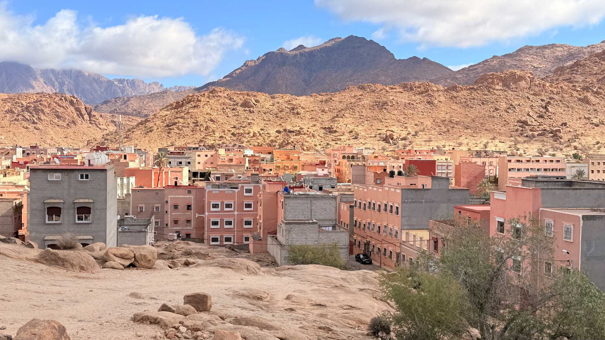 Puis, l’appel de la route s’est fait sentir. Frais et dispos, levés dès l’aube et réchauffés par un petit déjeuner, nous avons pris la direction de Tafraoute et Tiout. Les 165 kilomètres à parcourir se sont vite effacés devant la beauté des paysages. Routes sinueuses, montagnes arides, horizons à perte de vue… Le Maroc se dévoile lentement, majestueux, rappelant par son immensité le Québec, mais avec une âme et des couleurs bien à lui.