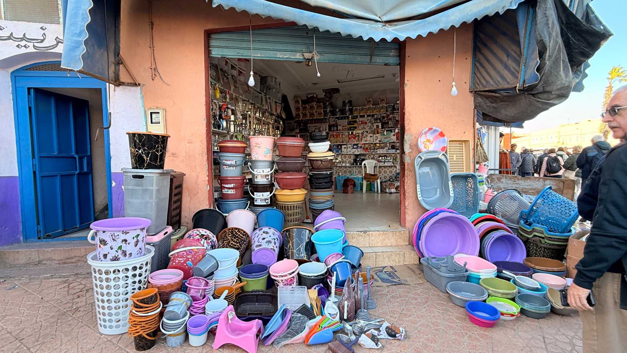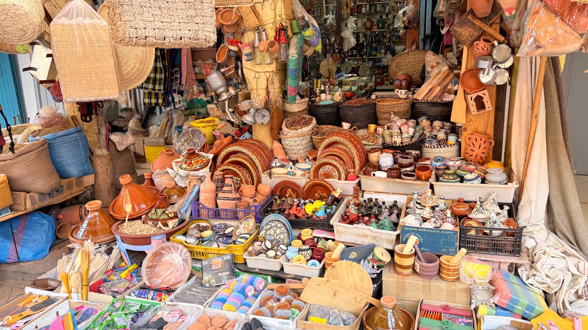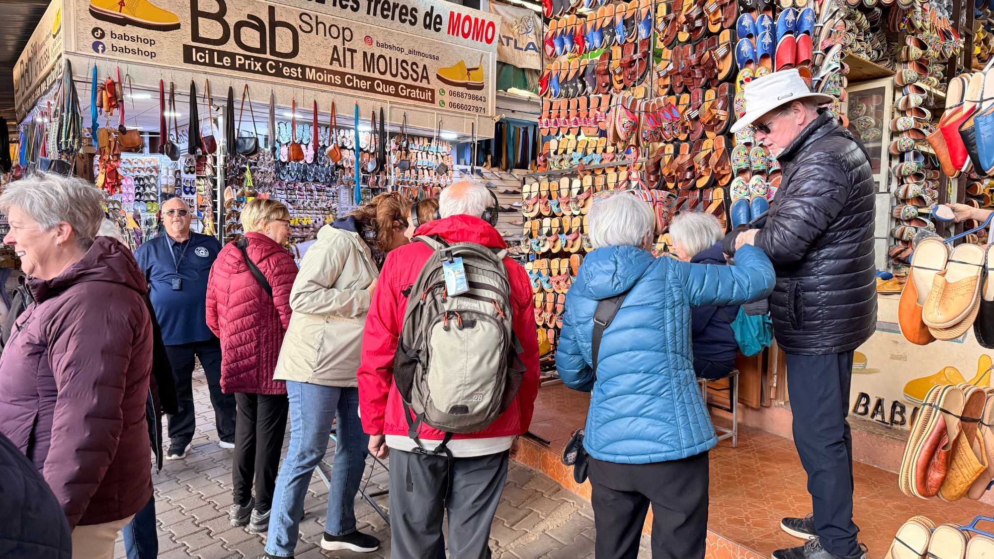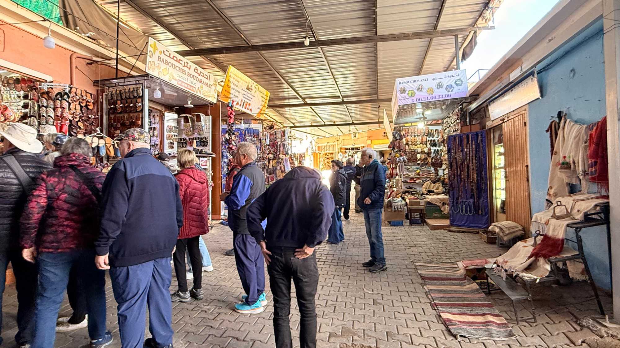Une pause bien attendue s’impose à l’heure du dîner. Au menu : salade marocaine, tajine de bœuf et des fruits pour conclure le repas. Revigorés, nous partons ensuite à la découverte du centre-ville, où artisans et marchands nous accueillent avec chaleur. Les négociations s’animent, les sourires fusent, et grâce à notre guide Houcine, véritable maître de l’art du marchandage, plusieurs repartent avec des babouches et des bijoux.