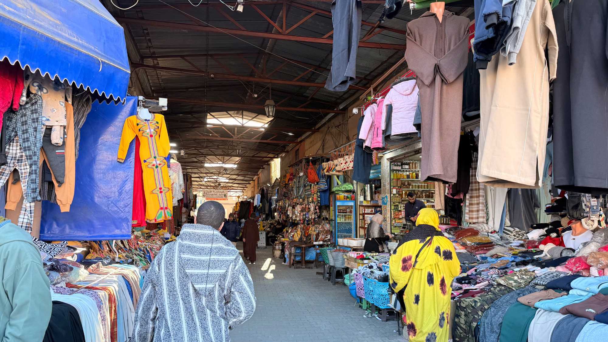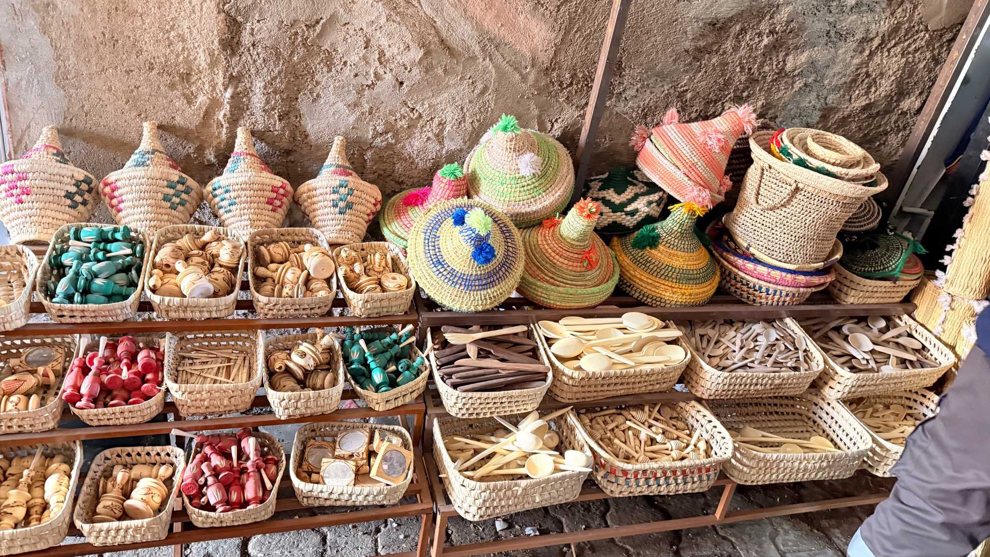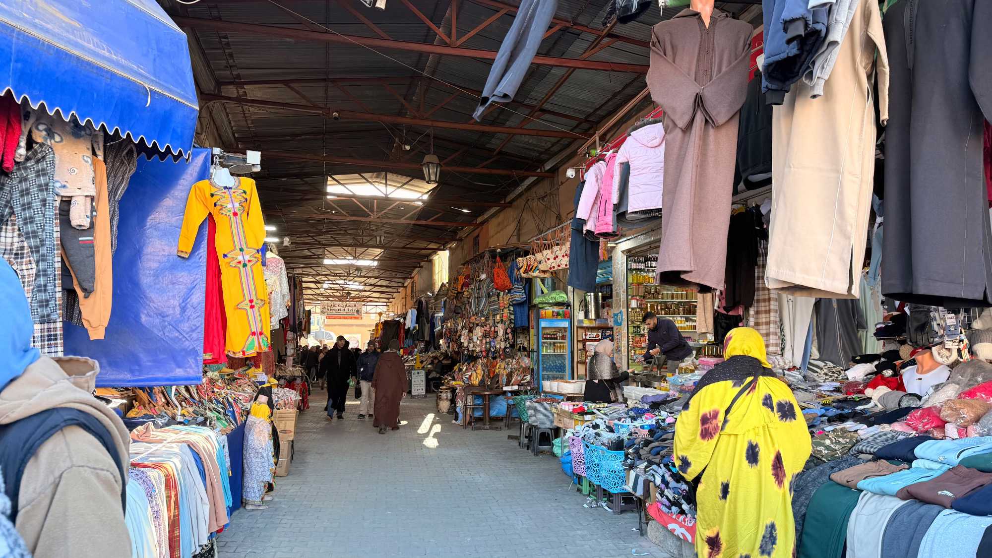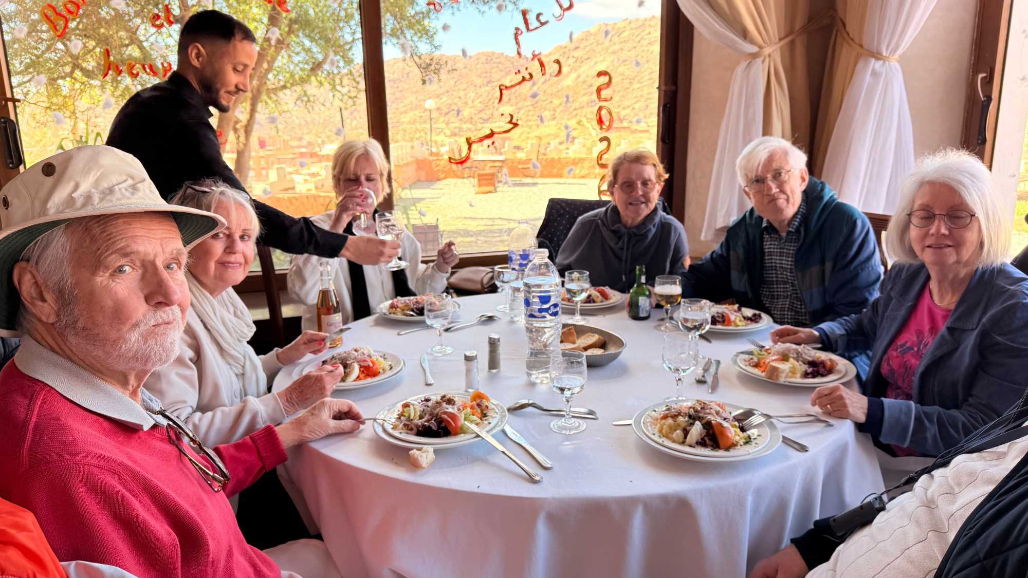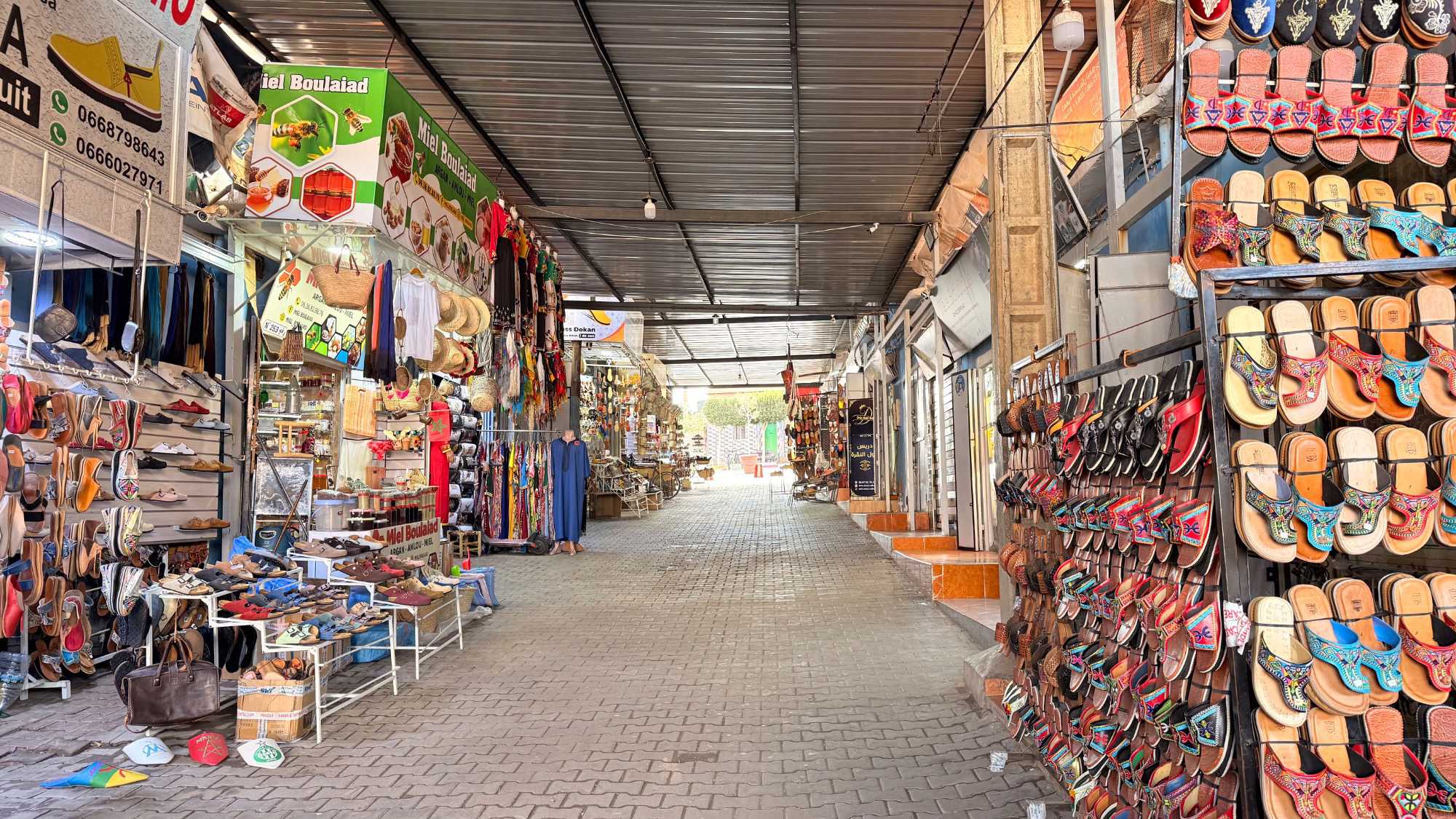 Une pause bien attendue s’impose à l’heure du dîner. Au menu : salade marocaine, tajine de bœuf et des fruits pour conclure le repas. Revigorés, nous partons ensuite à la découverte du centre-ville, où artisans et marchands nous accueillent avec chaleur. Les négociations s’animent, les sourires fusent, et grâce à notre guide Houcine, véritable maître de l’art du marchandage, plusieurs repartent avec des babouches et des bijoux.