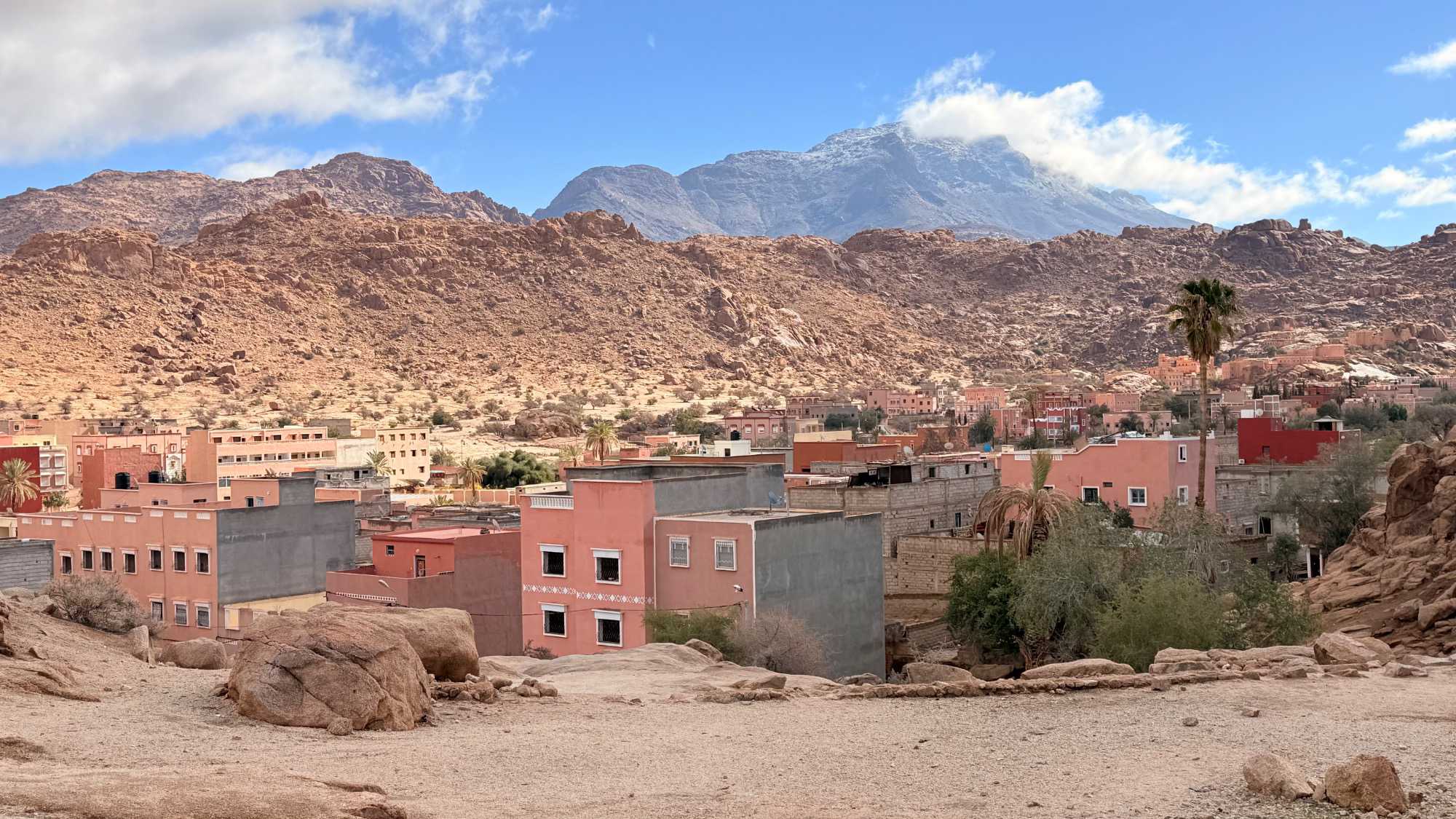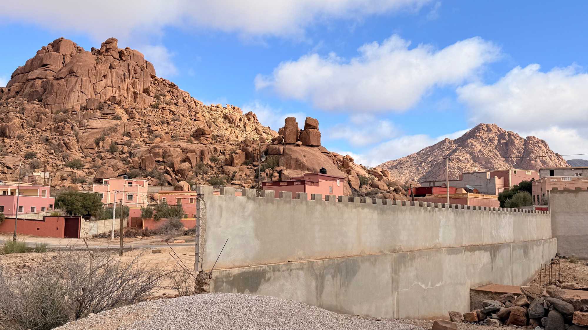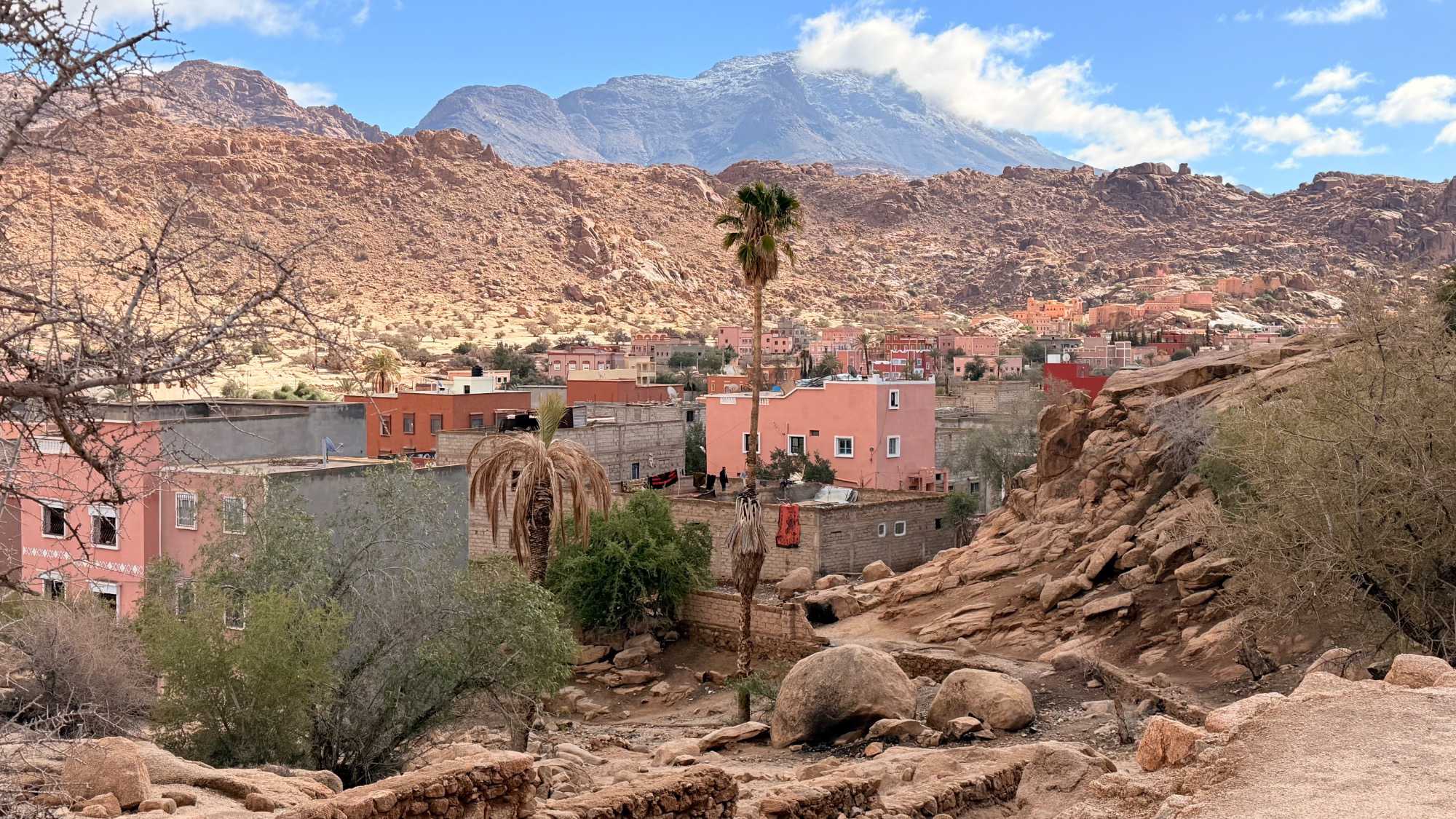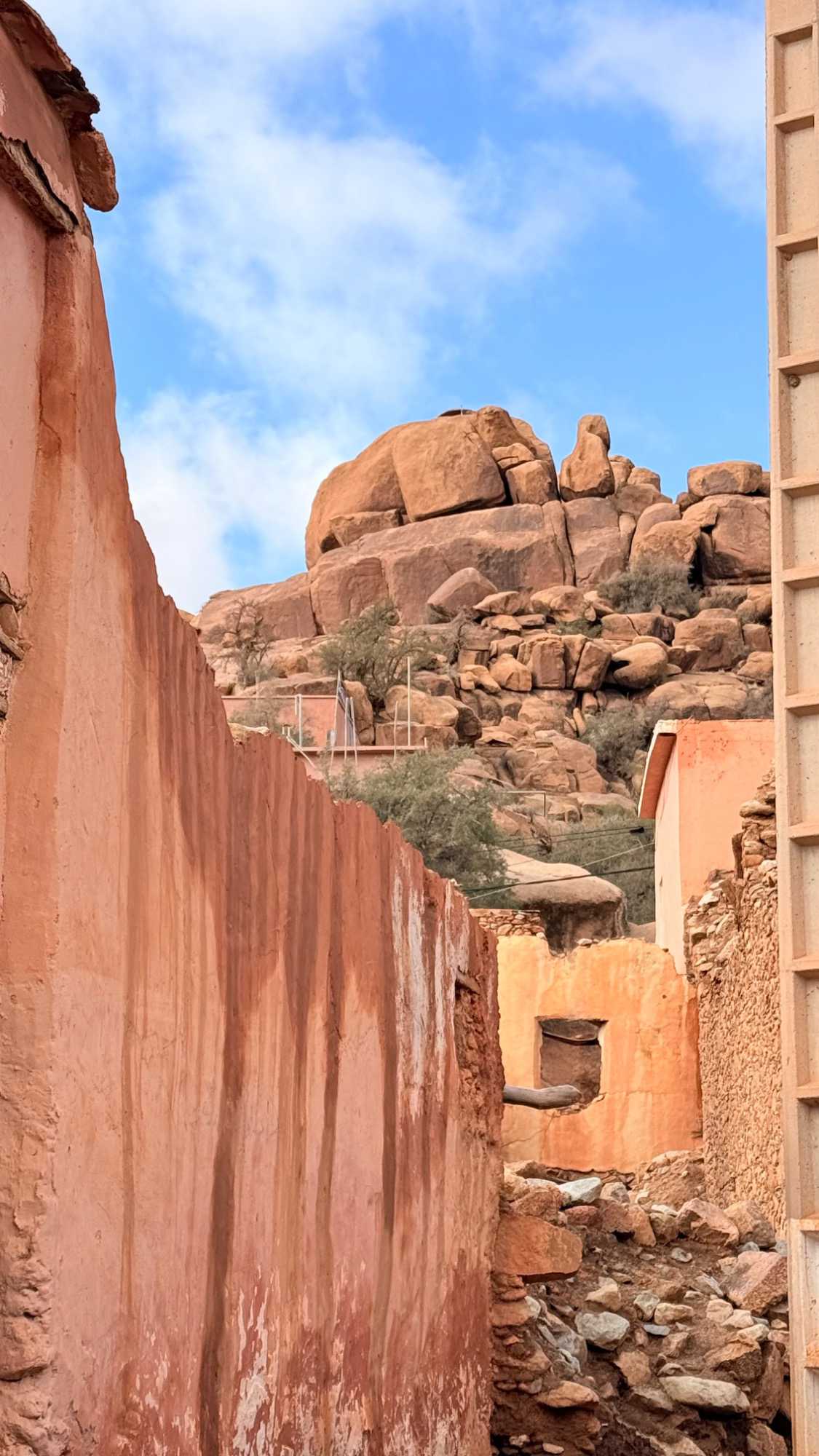 L’arrivée à Tafraoute est un véritable choc visuel. Blottie à 1 200 mètres d’altitude, la ville semble se cacher entre les montagnes de l’Anti-Atlas, comme le suggère si bien son nom. Le granit rose qui l’entoure embrase le paysage, et l’on devine sans peine pourquoi le coucher du soleil y est réputé magique. Les maisons ocre, harmonieusement fondues dans la montagne, se dispersent entre amandiers, arganiers et palmiers, donnant à la ville une douceur presque irréelle.