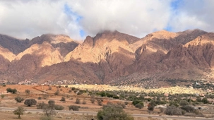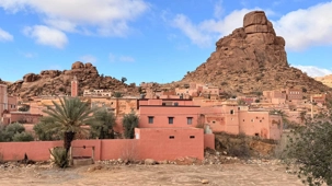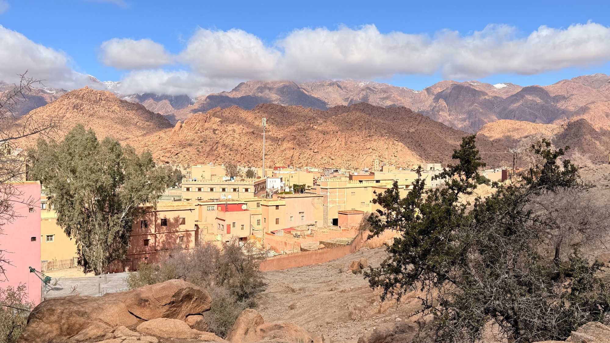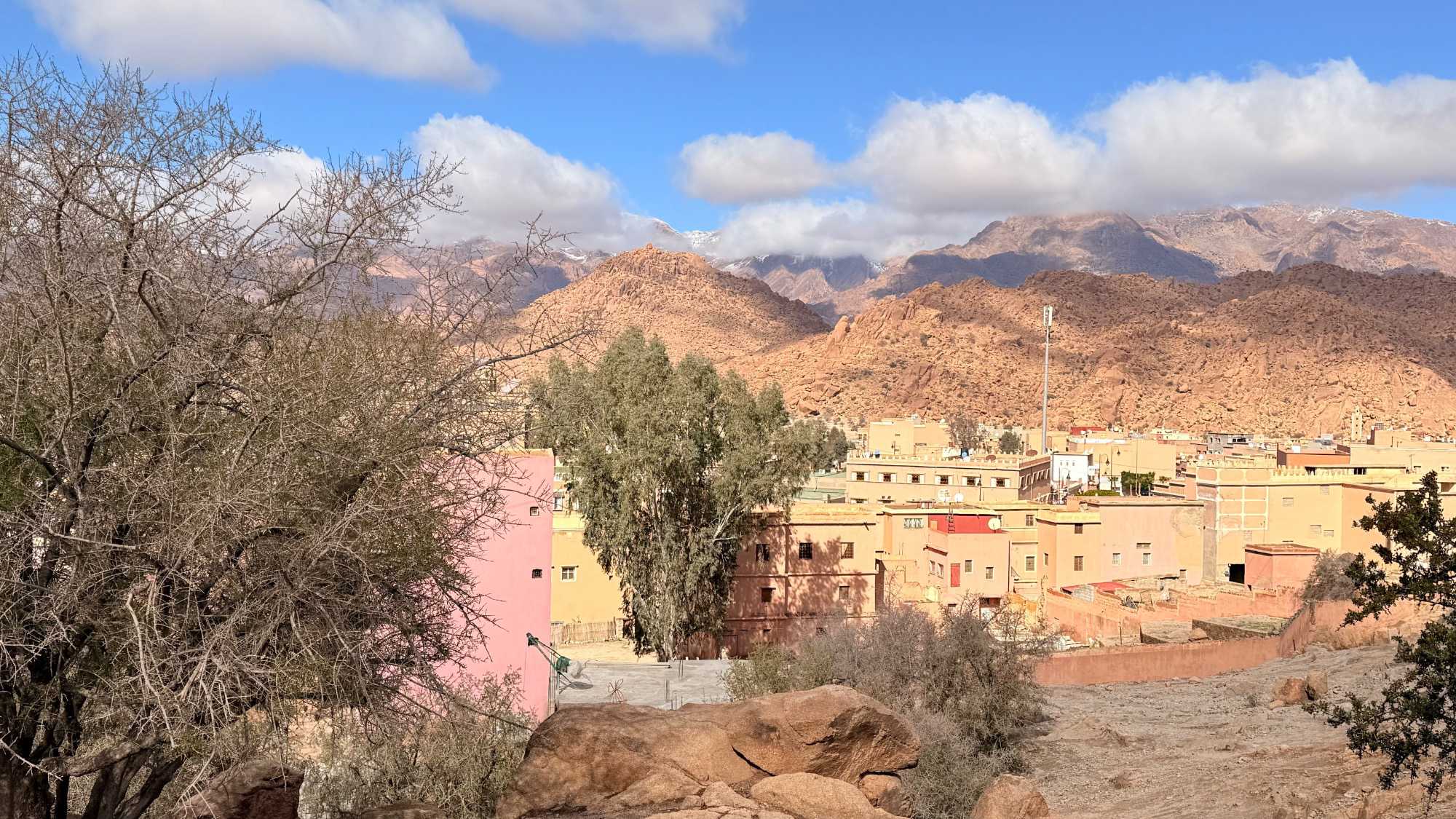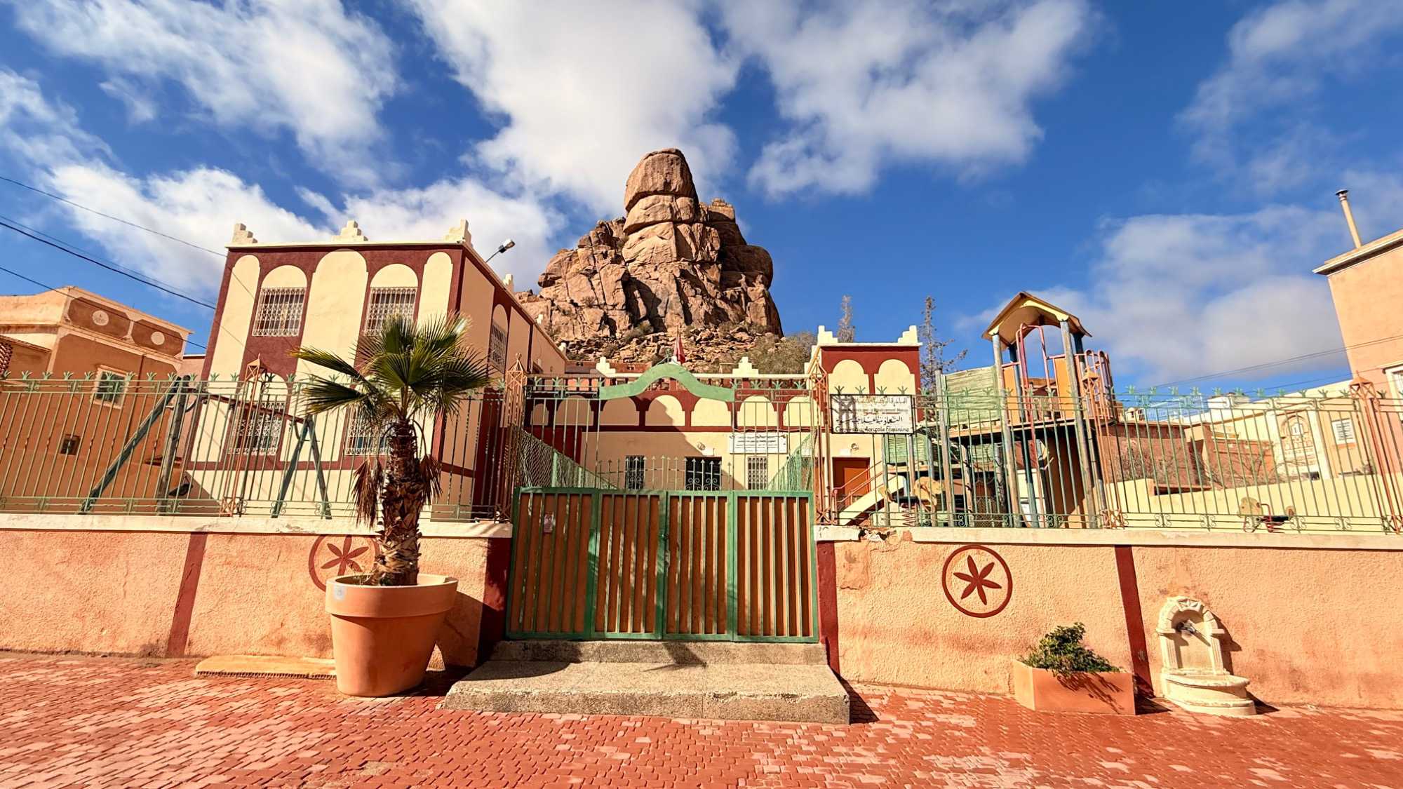 L’arrivée à Tafraoute est un véritable choc visuel. Blottie à 1 200 mètres d’altitude, la ville semble se cacher entre les montagnes de l’Anti-Atlas, comme le suggère si bien son nom. Le granit rose qui l’entoure embrase le paysage, et l’on devine sans peine pourquoi le coucher du soleil y est réputé magique. Les maisons ocre, harmonieusement fondues dans la montagne, se dispersent entre amandiers, arganiers et palmiers, donnant à la ville une douceur presque irréelle.