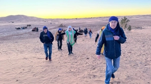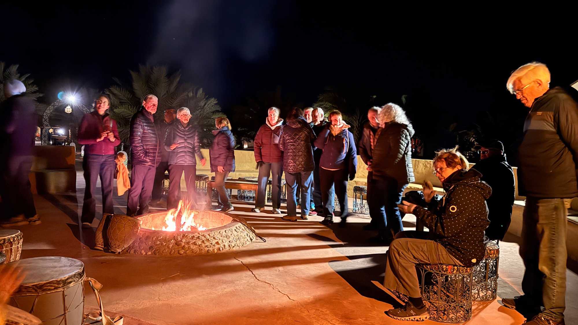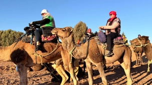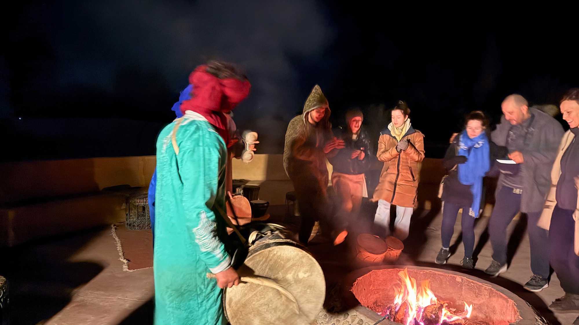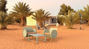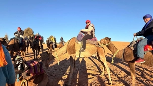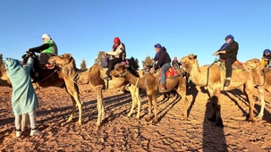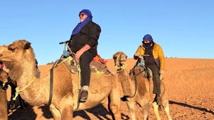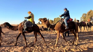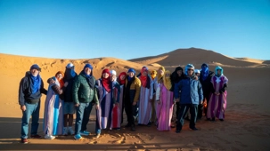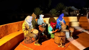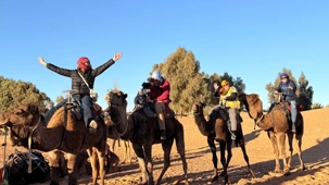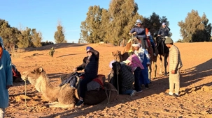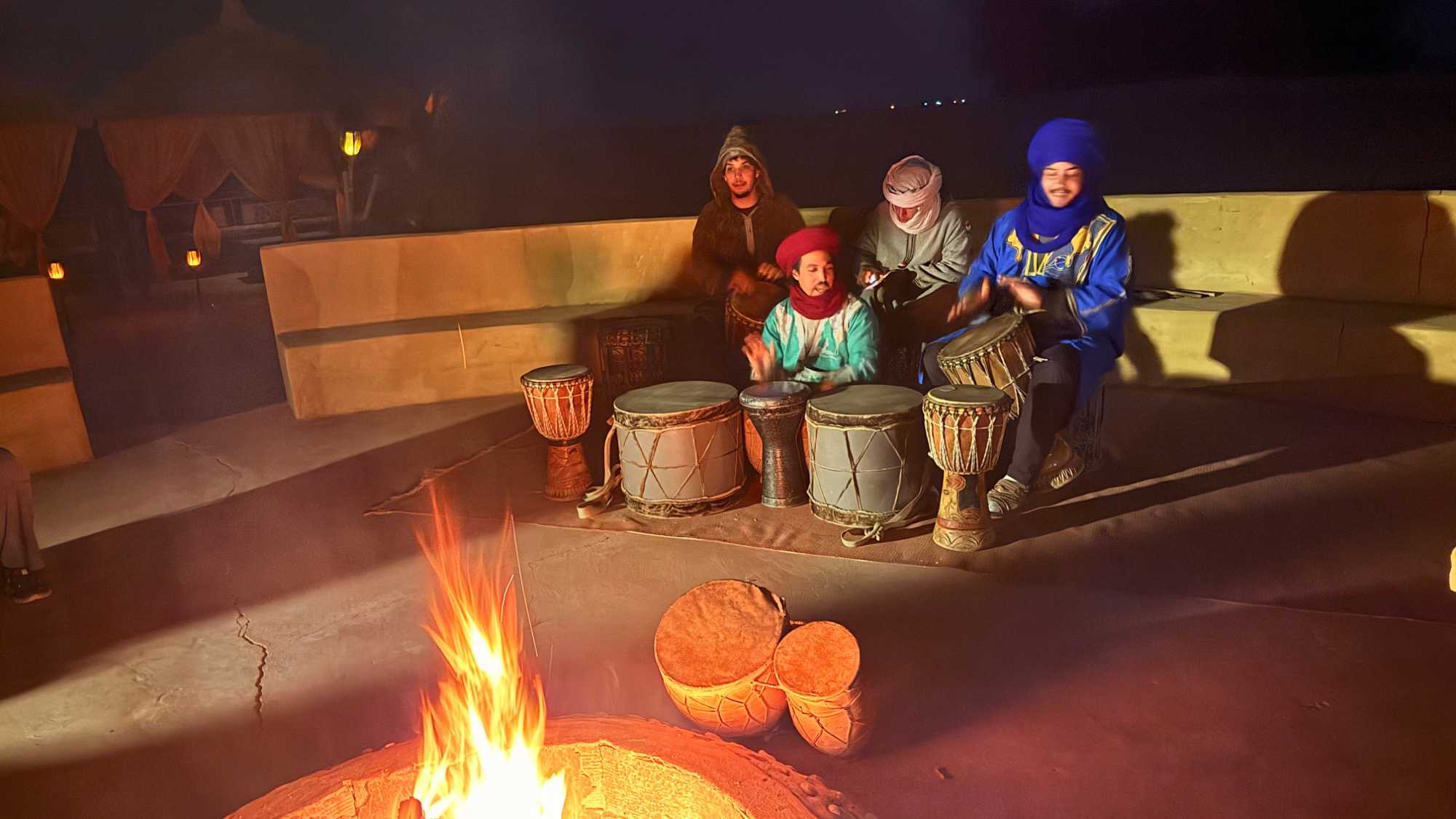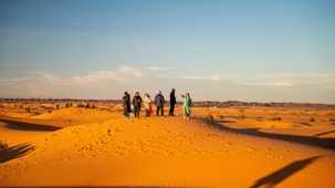 Les voyageurs partent ensuite en expédition à dos de dromadaire, traversant les dunes pour admirer un magnifique coucher de soleil, avant de partager un souper festif au cœur du désert. À la tombée du jour, le sable se fait plus doux, le désert s’apaise, le ciel s’illumine d’étoiles, et la musique saharienne accompagne les voyageurs autour du feu, comme un écho venu du fond des âges.