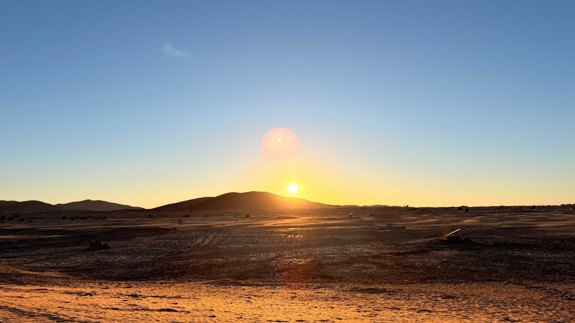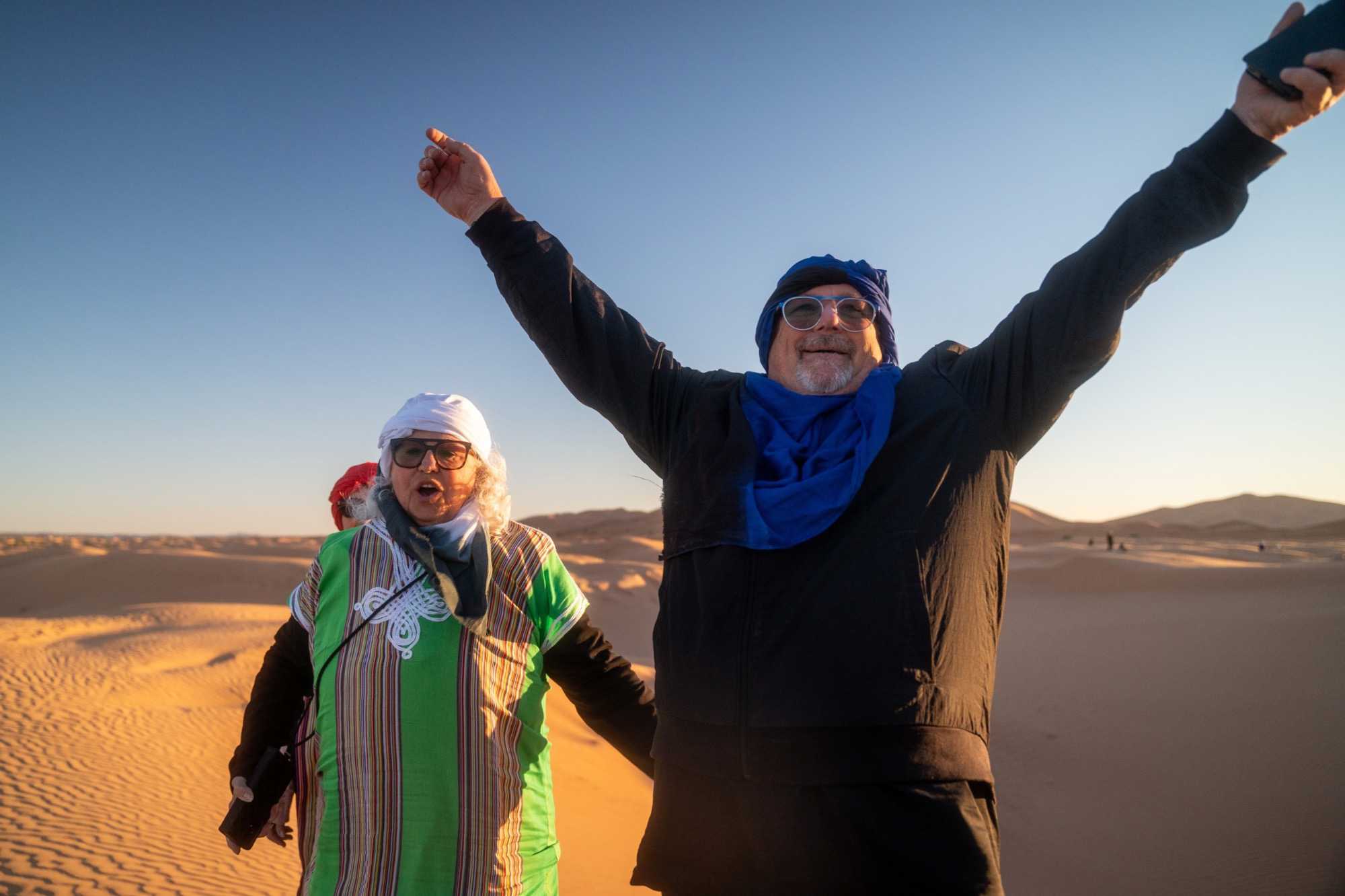 La route continue vers un petit arrêt surprise, qui nous permet de revêtir robes et chèche afin de nous glisser dans la peau de véritables passionnés du désert. Devant nous, les dunes de l’Erg Chebbi ondulent à l’infini, dorées au lever du soleil et embrasées au crépuscule. Jadis traversée par les caravanes chargées d’or, d’épices et de rêves, Merzouga demeure aujourd’hui un espace de silence, de liberté et de profonde déconnexion.