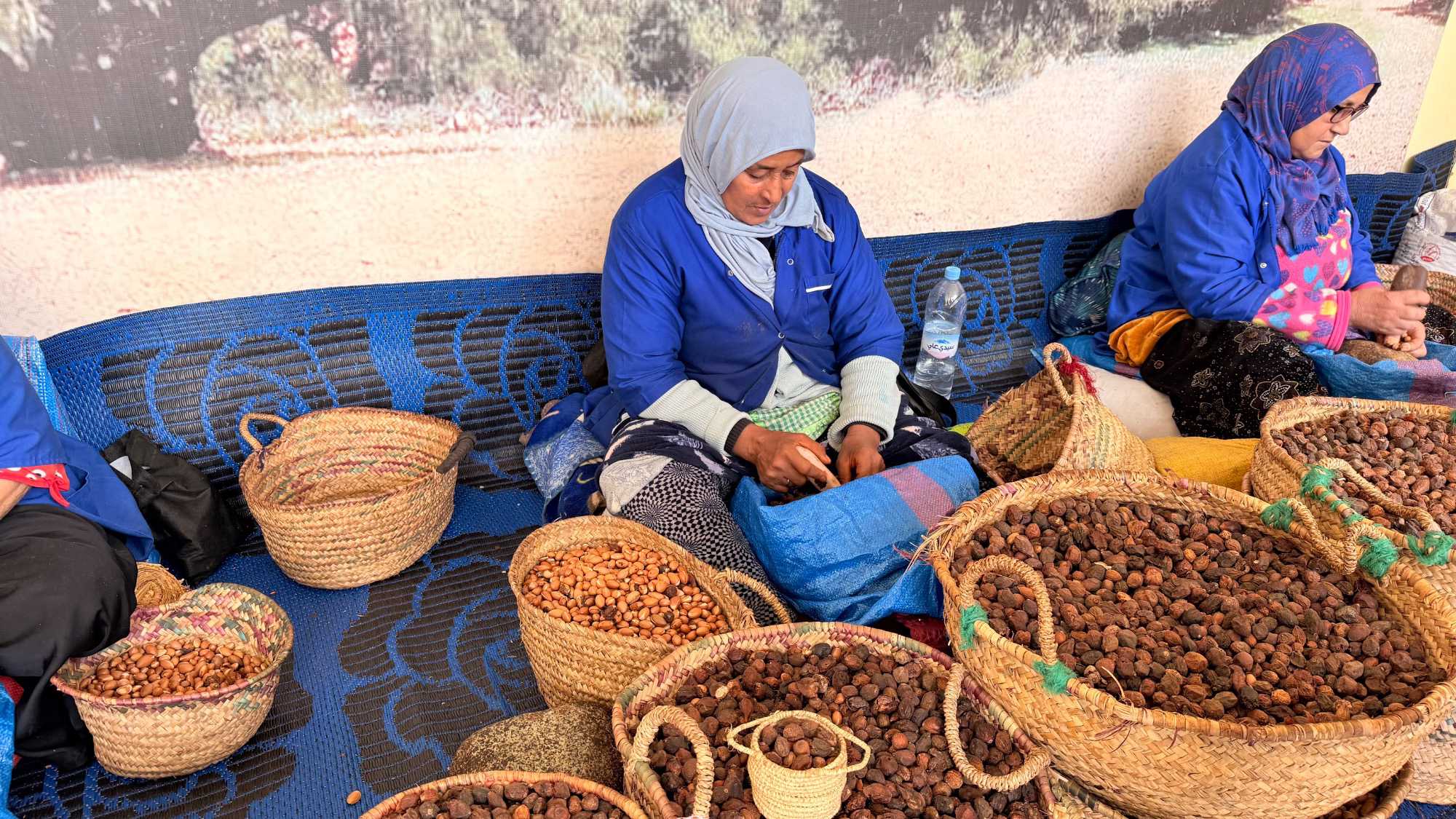 Peu après, nous visitons une coopérative d’argan, symbole du savoir-faire berbère et de l’économie locale. Ici, les femmes transforment les noix d’argan en huile, en pâte cosmétique et en produits alimentaires. Nous découvrons leur travail minutieux, leur patience et leur fierté, tout en ayant l’occasion de goûter à l’huile fraîche et de ramener quelques souvenirs artisanaux.
