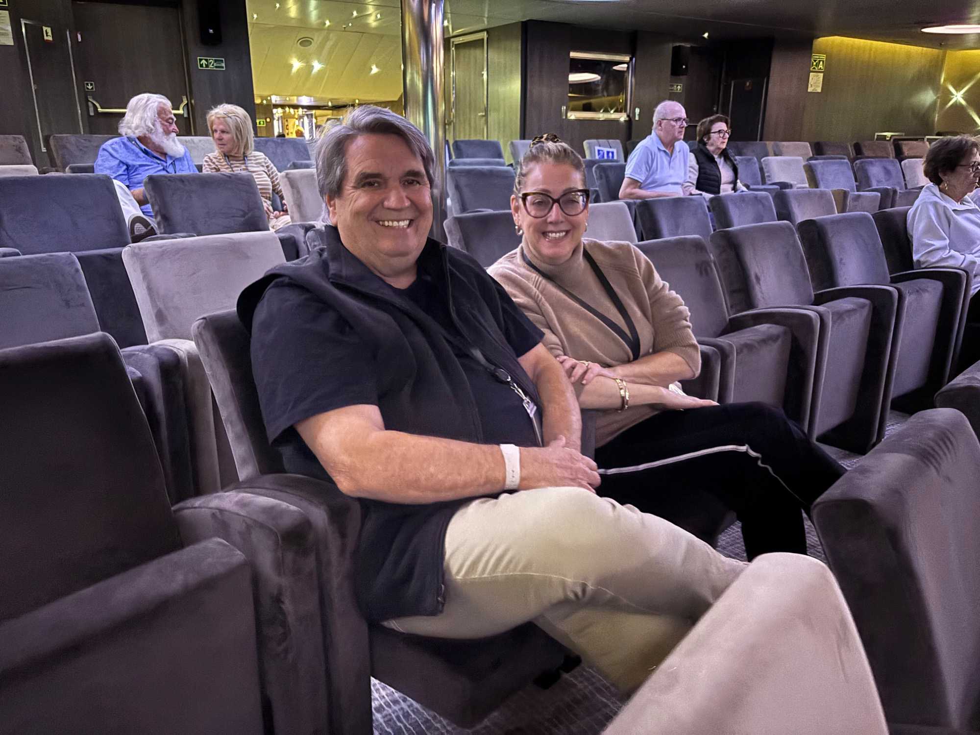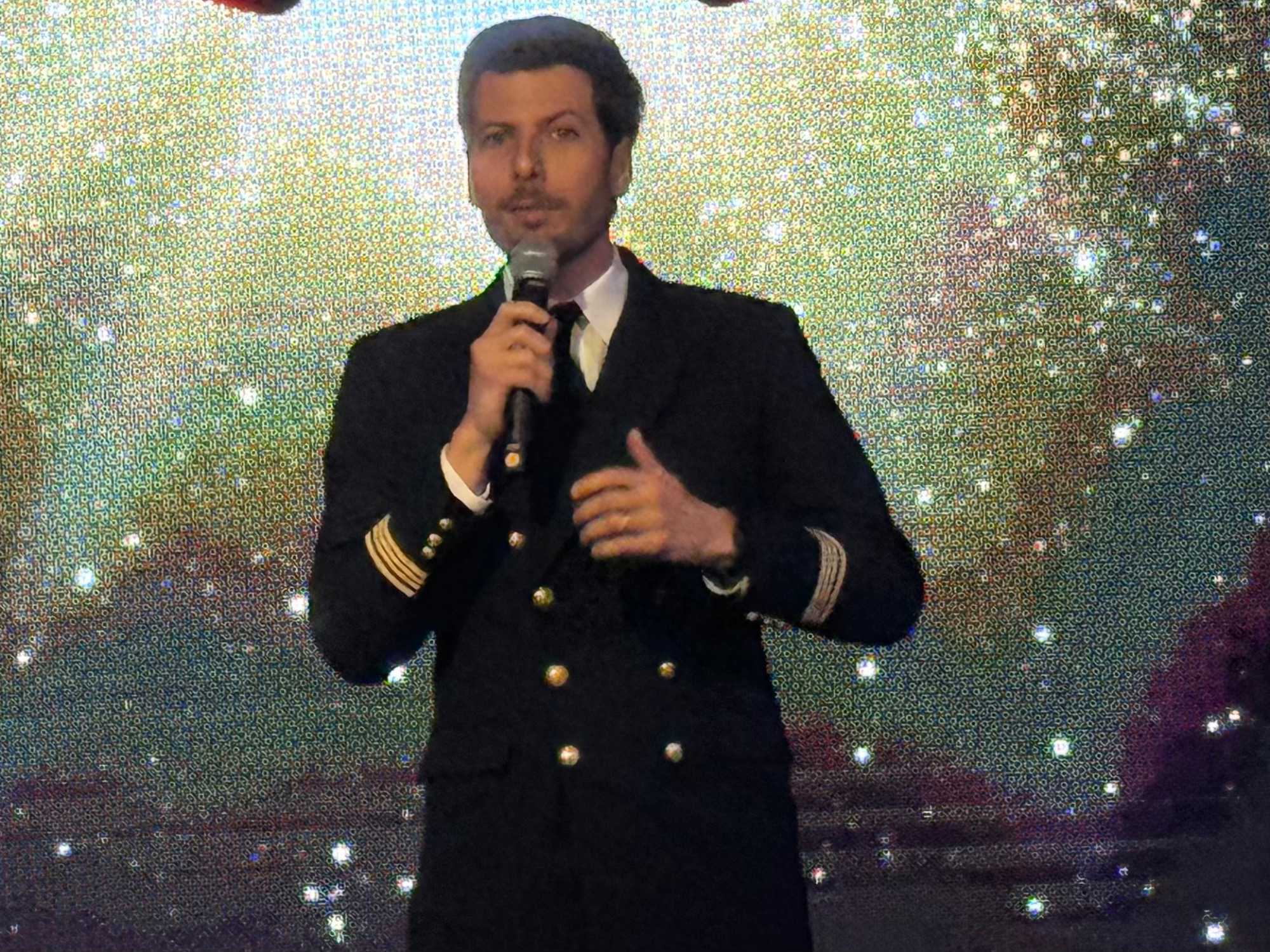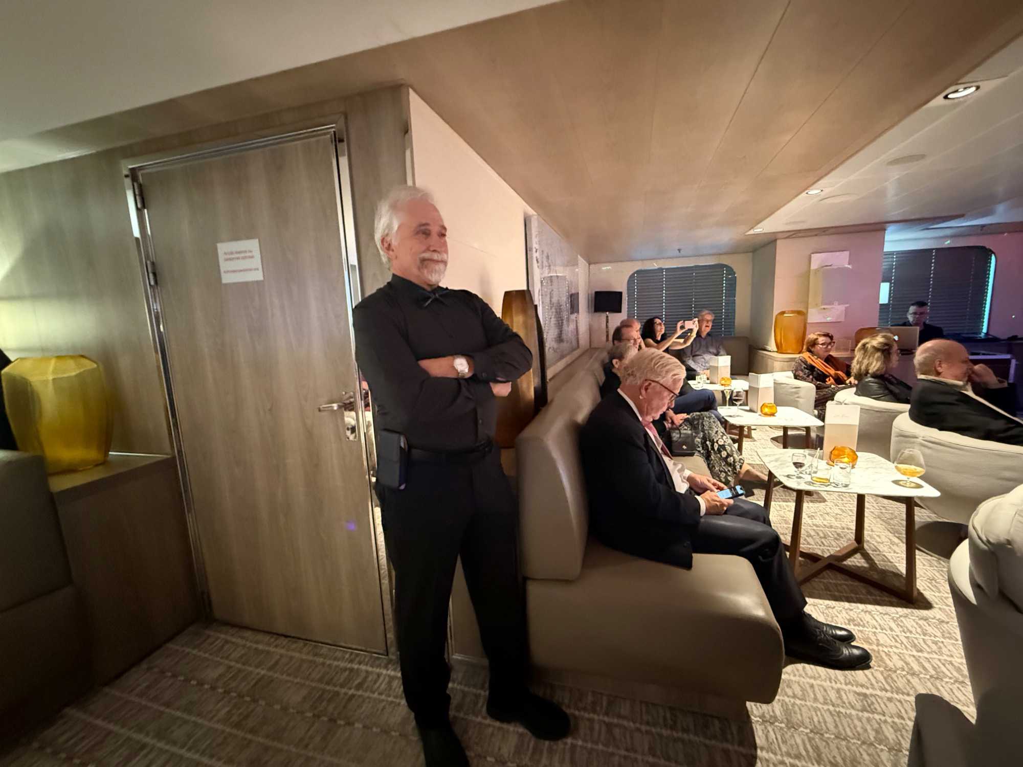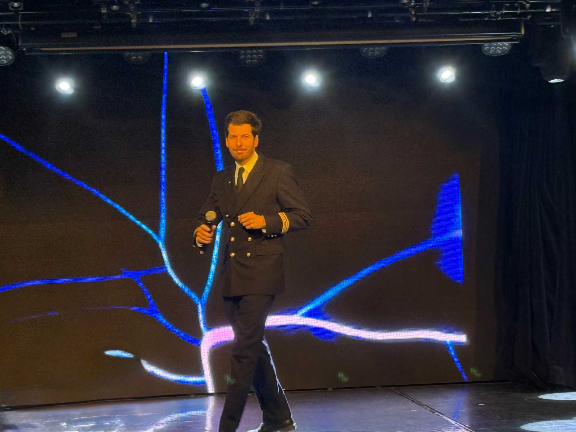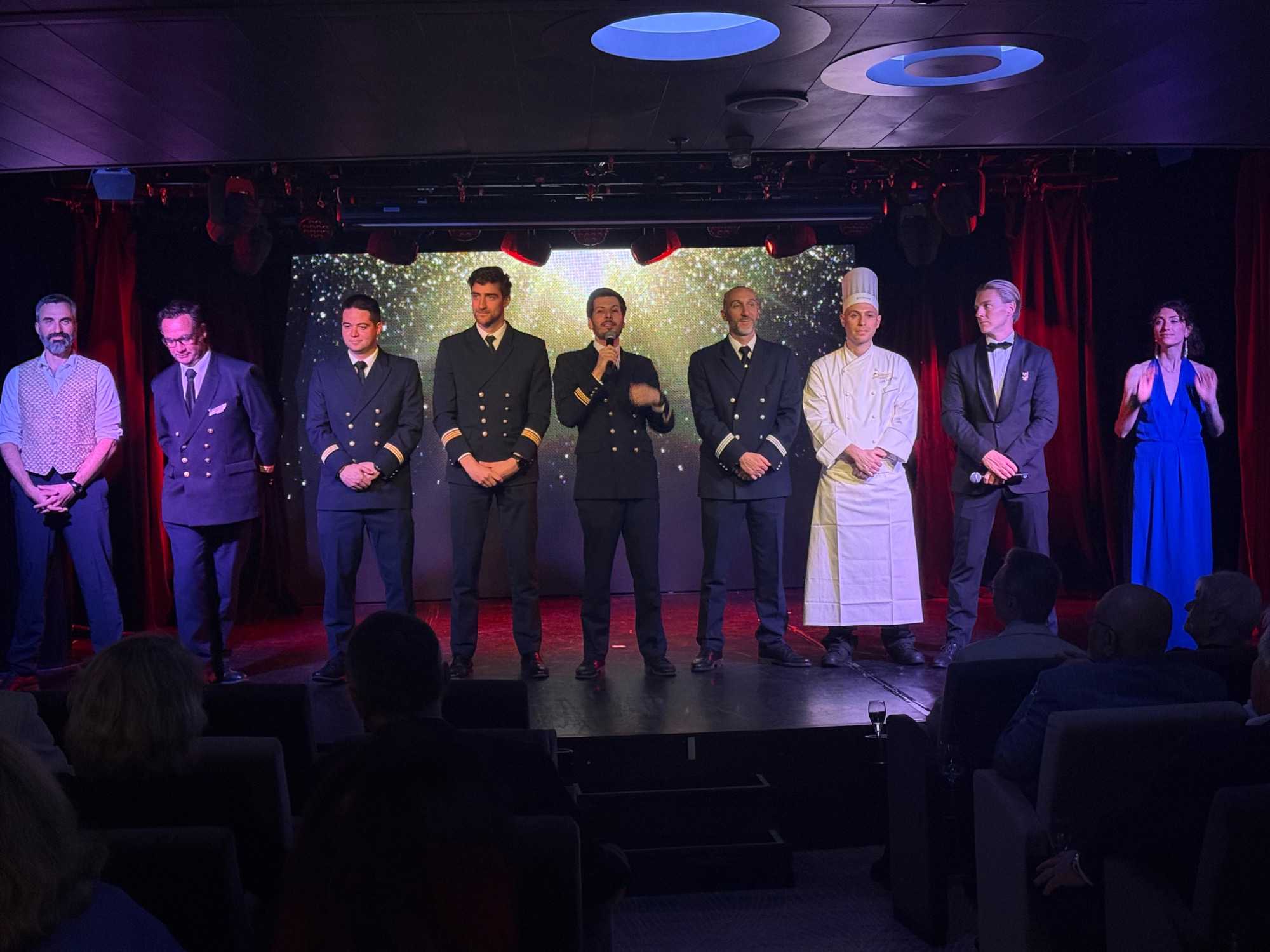 Le cocktail de bienvenue commence dans une ambiance chic et festive. Nous sommes reçus dans le grand théâtre, champagne à la main, avec une belle musique pour nous accueillir. Le commandant, les officiers supérieurs et les chefs de département sont présentés, et on sent à quel point tout est bien encadré à bord.