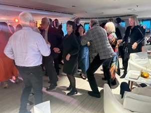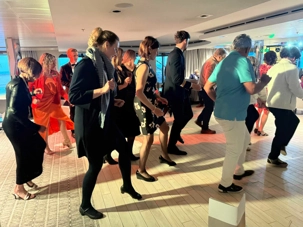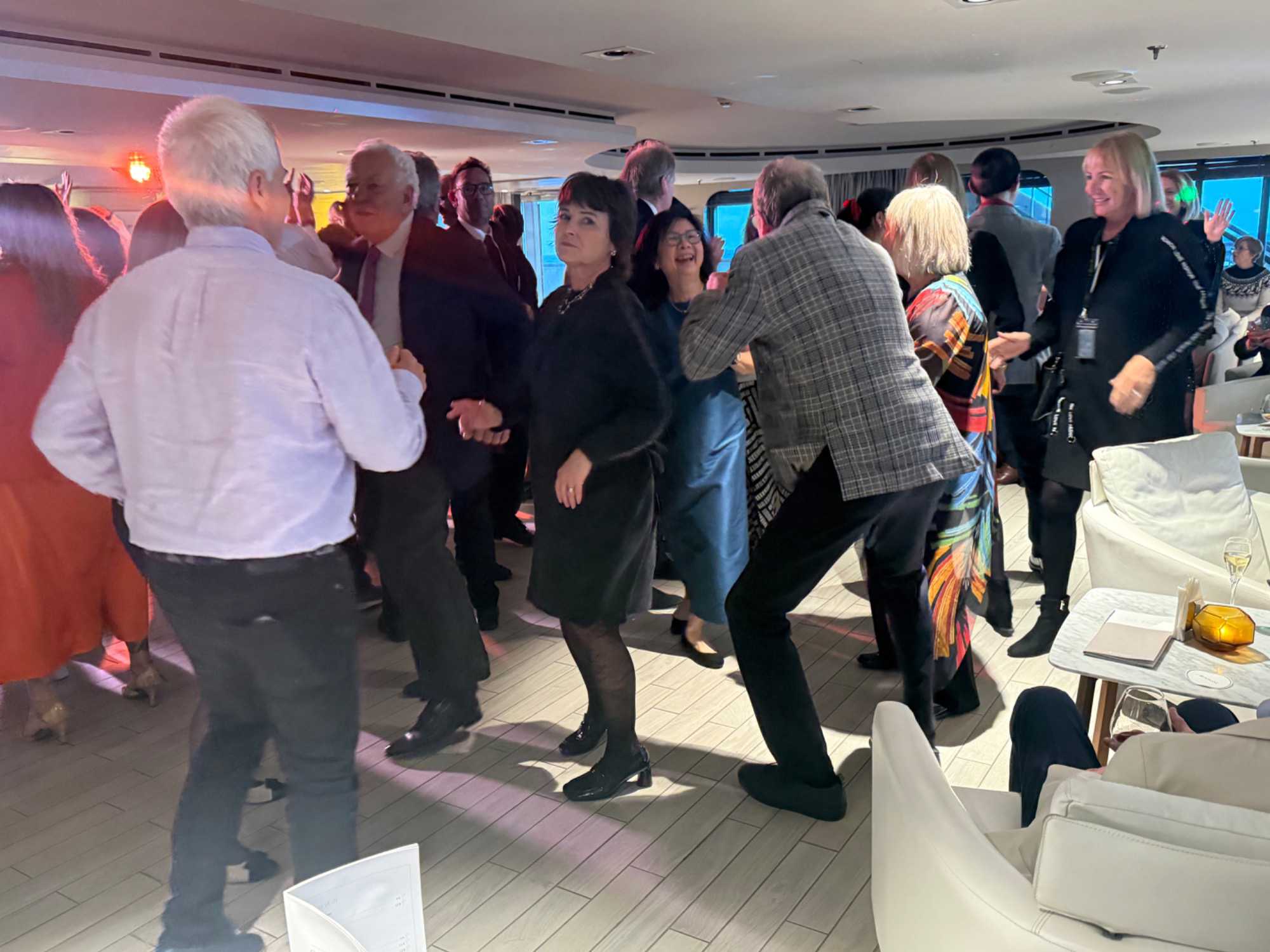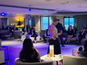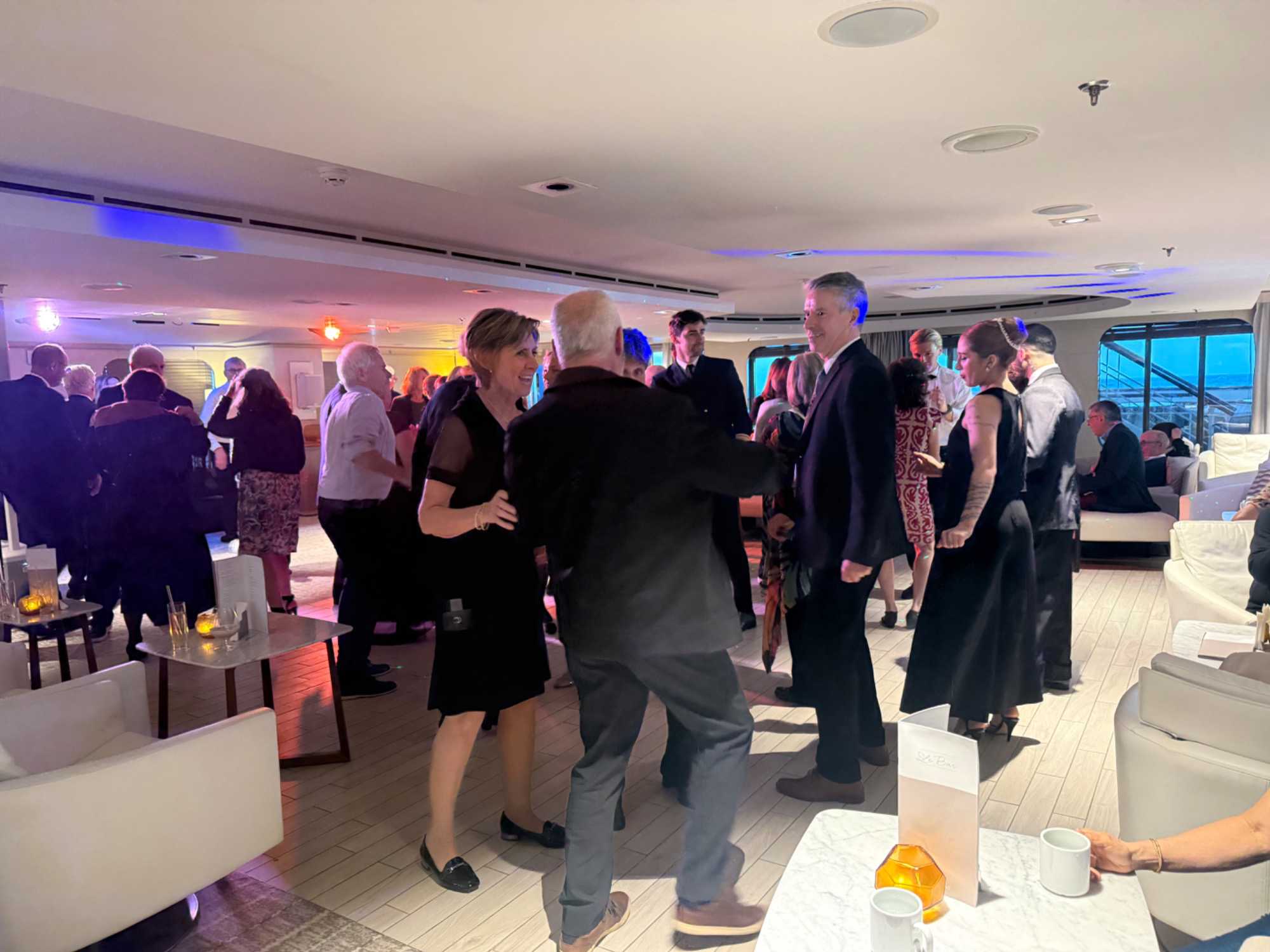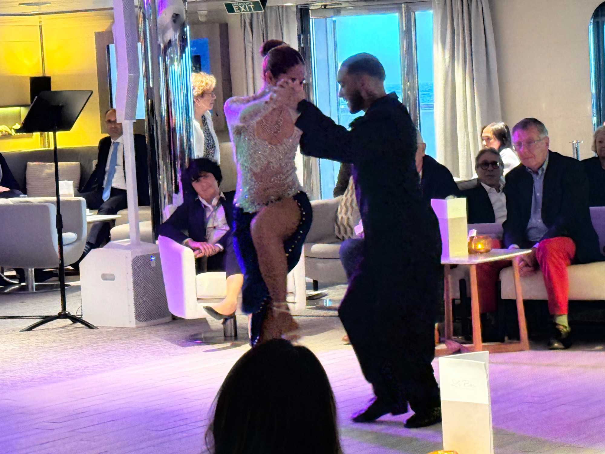 Après cela, nous rejoignons le grand salon pour prolonger la soirée. Un couple de danseurs colombiens nous offre un spectacle, suivi d’ambiance musicale… et bien sûr, ça ne prend pas de temps : la piste de danse s’anime.