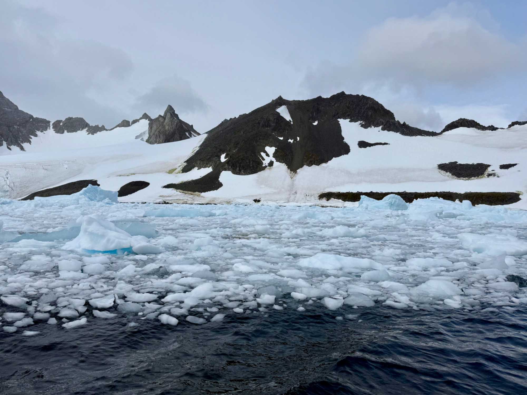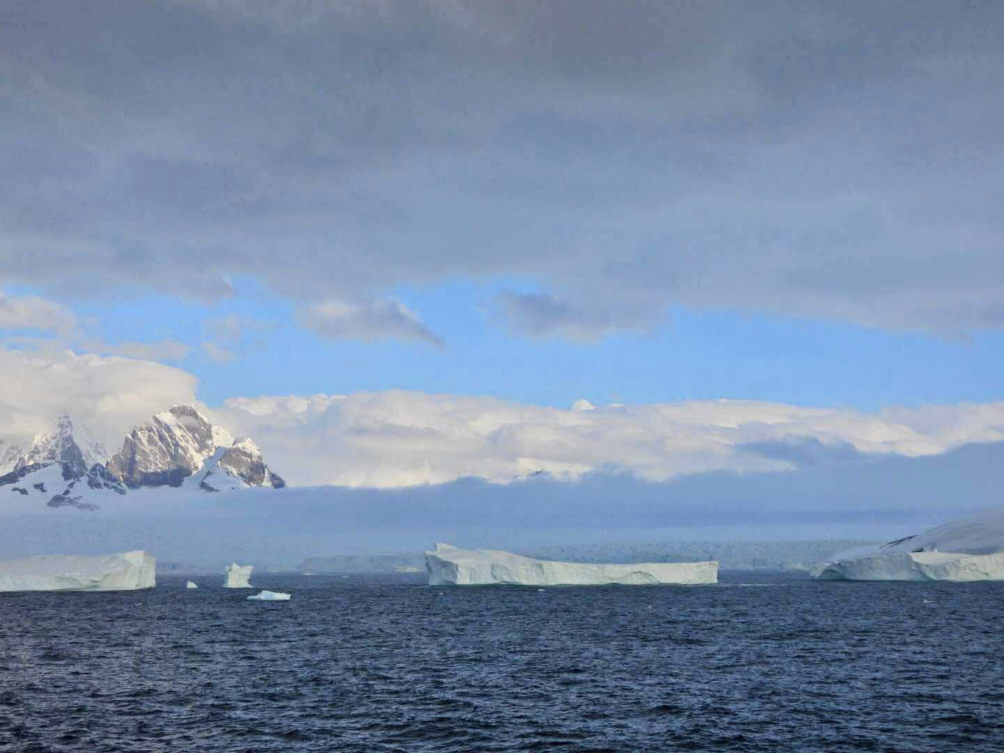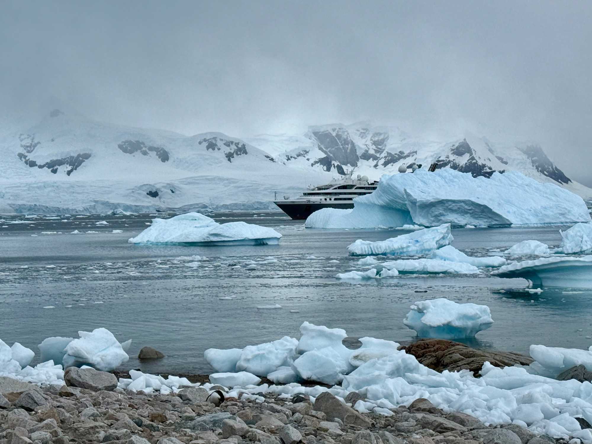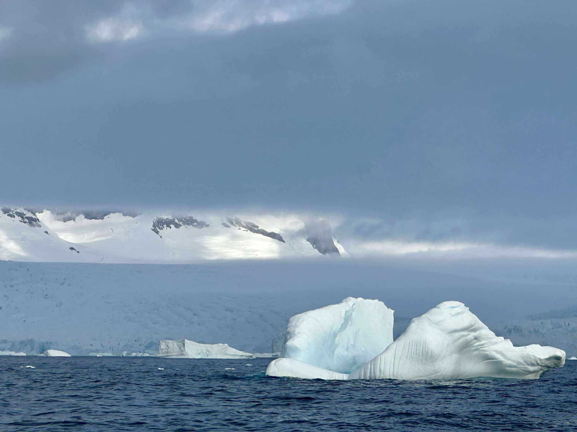 Aujourd’hui, le temps est plus couvert — et c’est ça aussi, l’Antarctique : un mélange de lumière, de nuages, de percées de soleil… une ambiance changeante qui rend les paysages encore plus dramatiques et mystérieux.