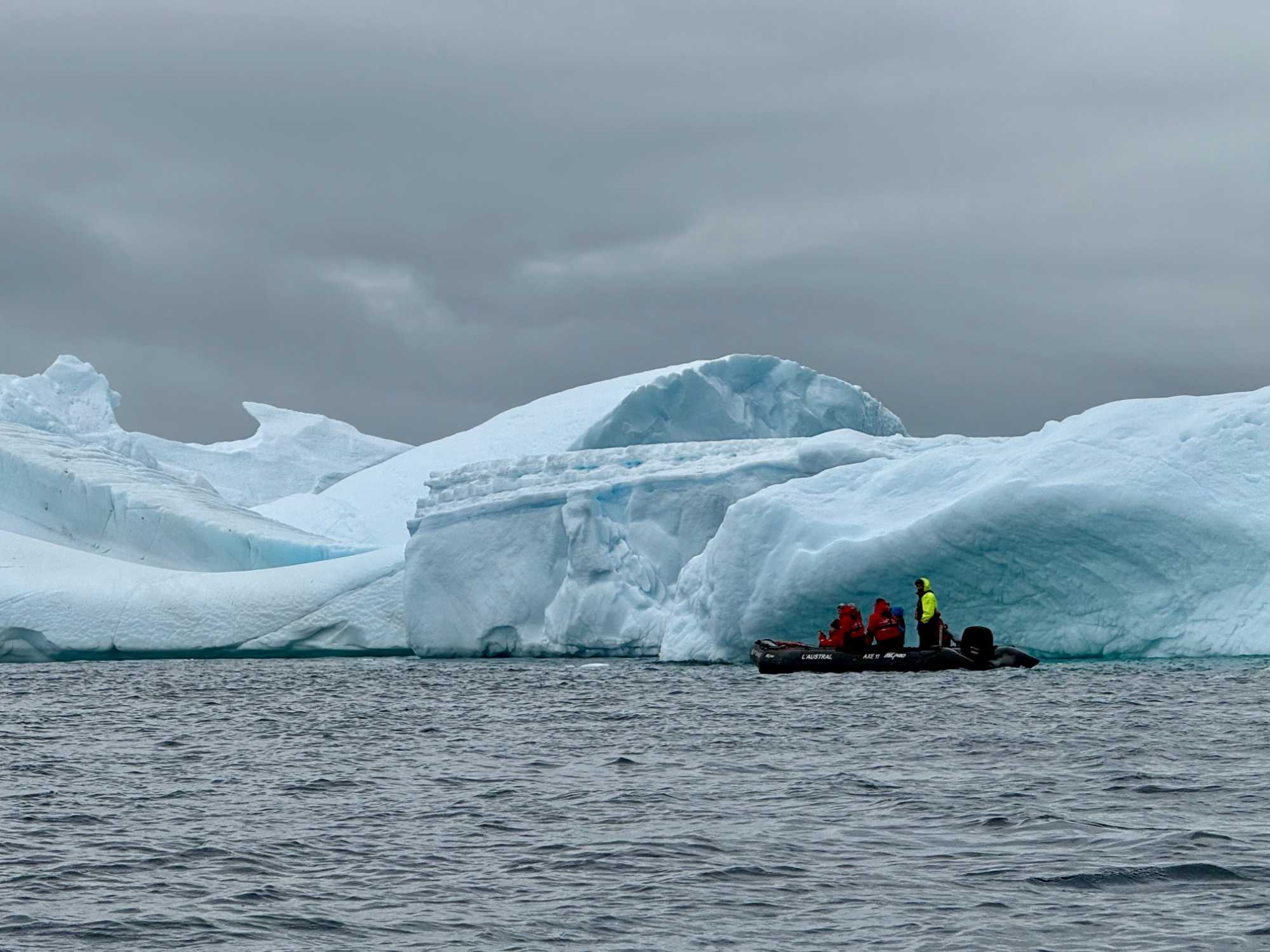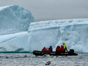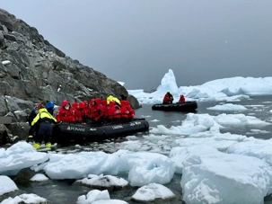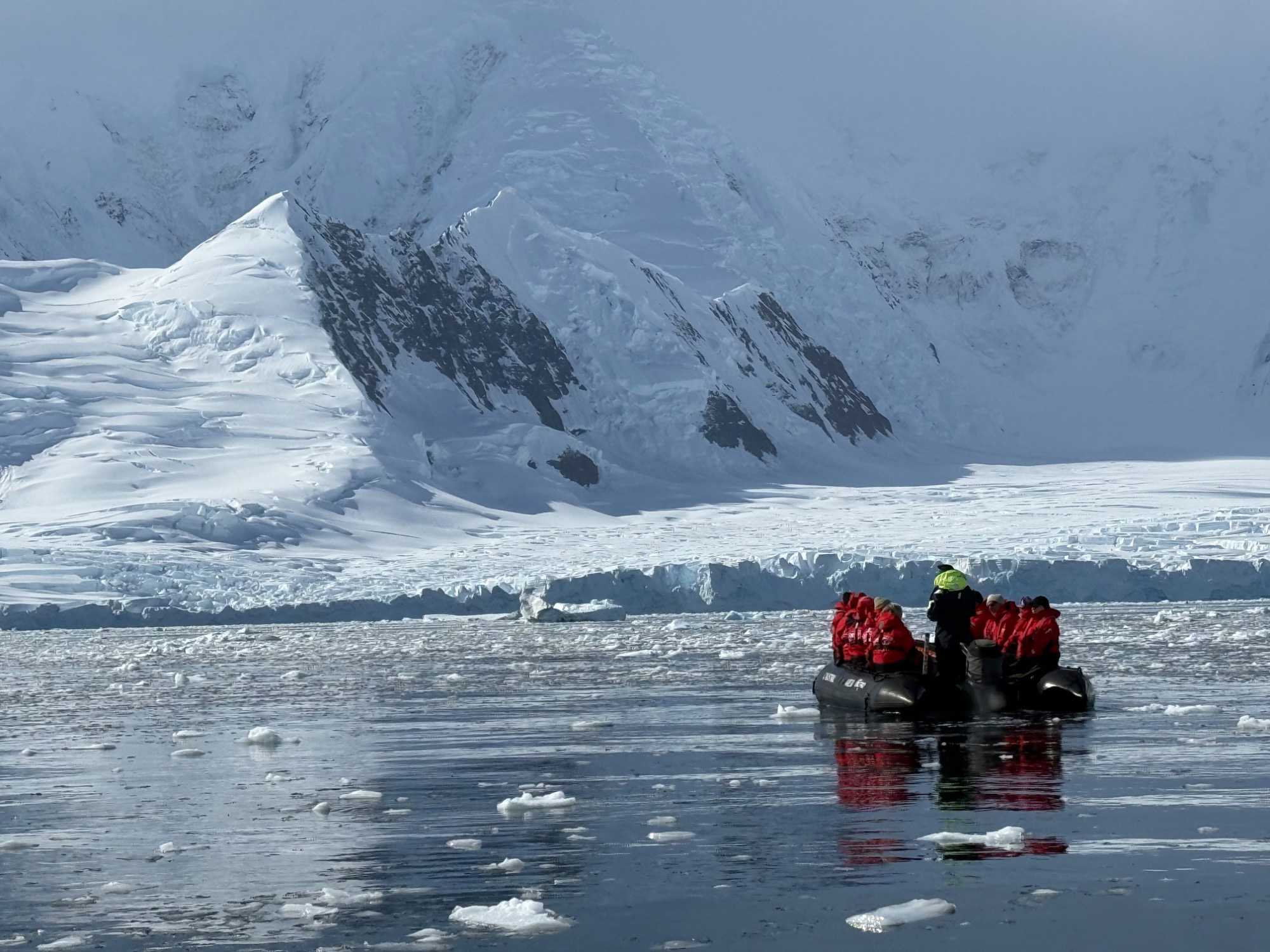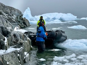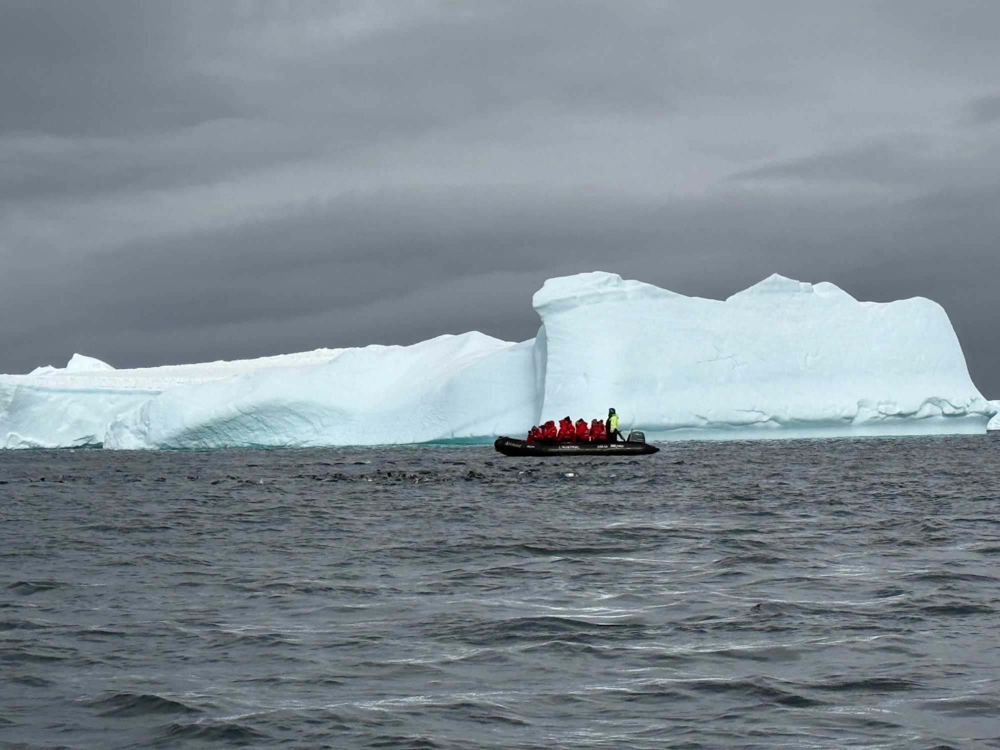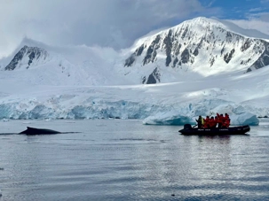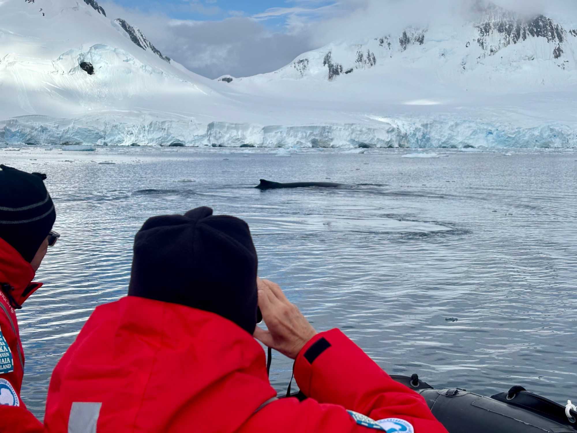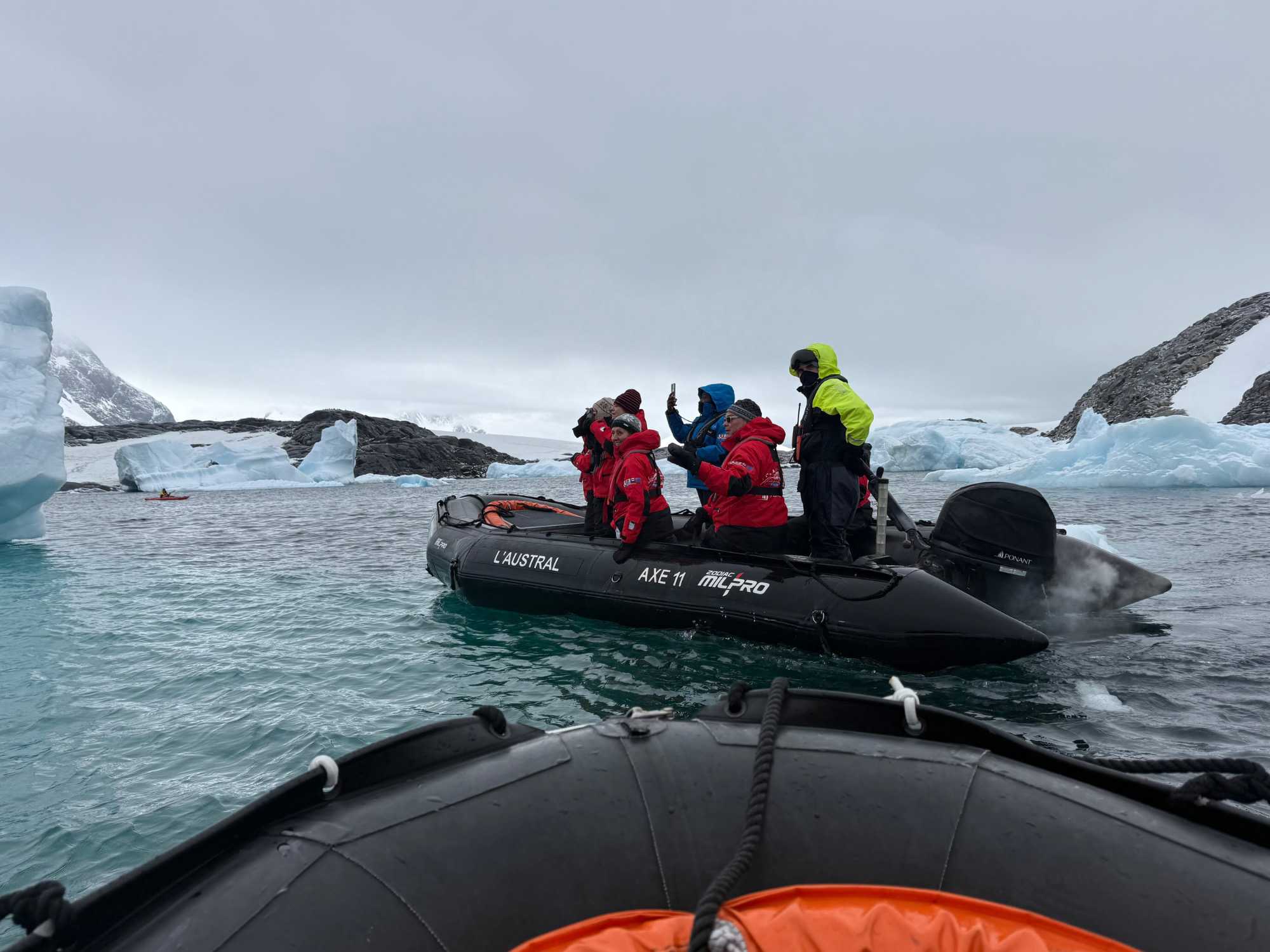 Nous embarquons dans les zodiacs, accompagnés de nos naturalistes francophones, direction le débarquement à Port Charcot. Mais à peine montés à bord, notre guide nous annonce :